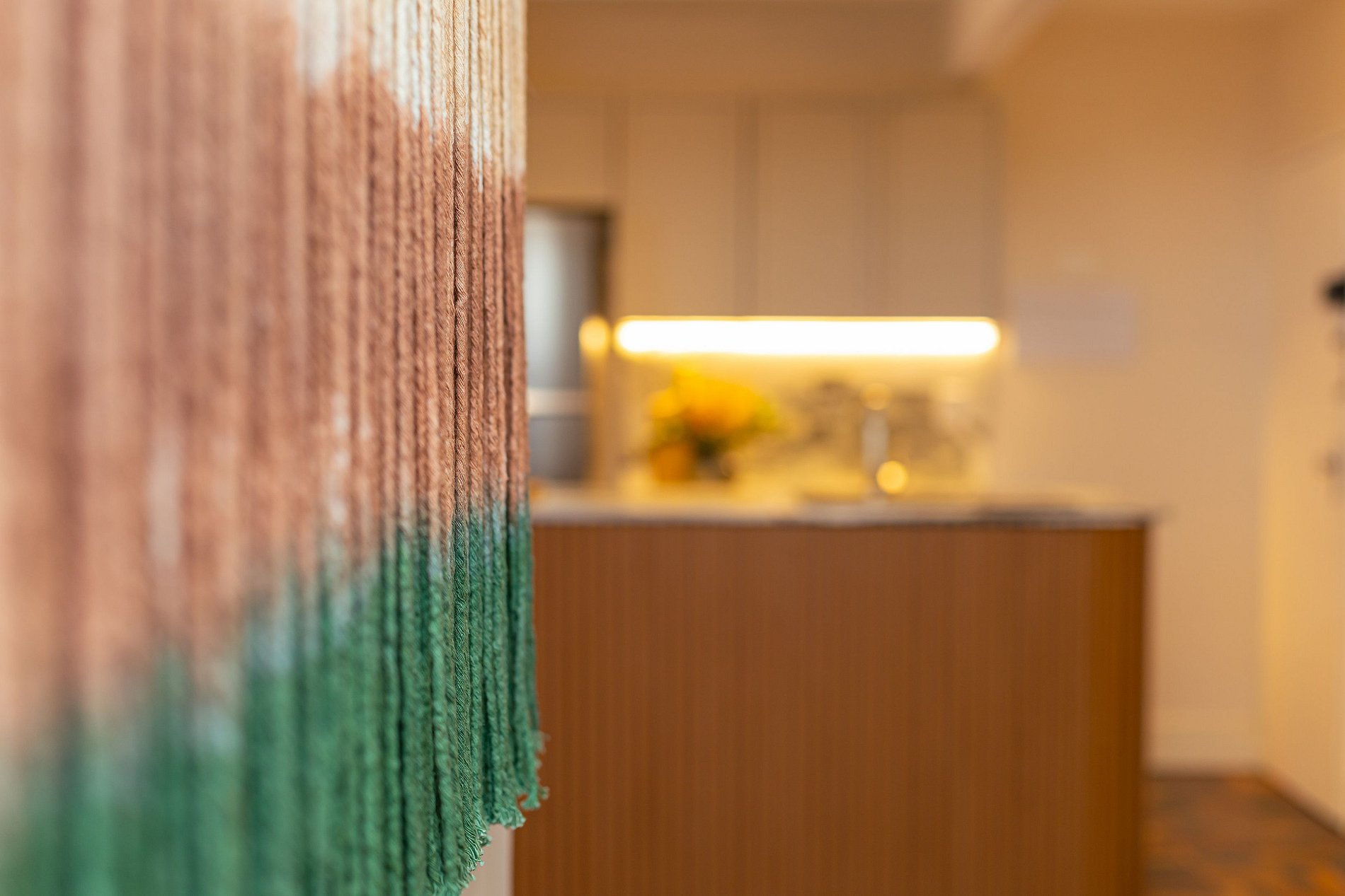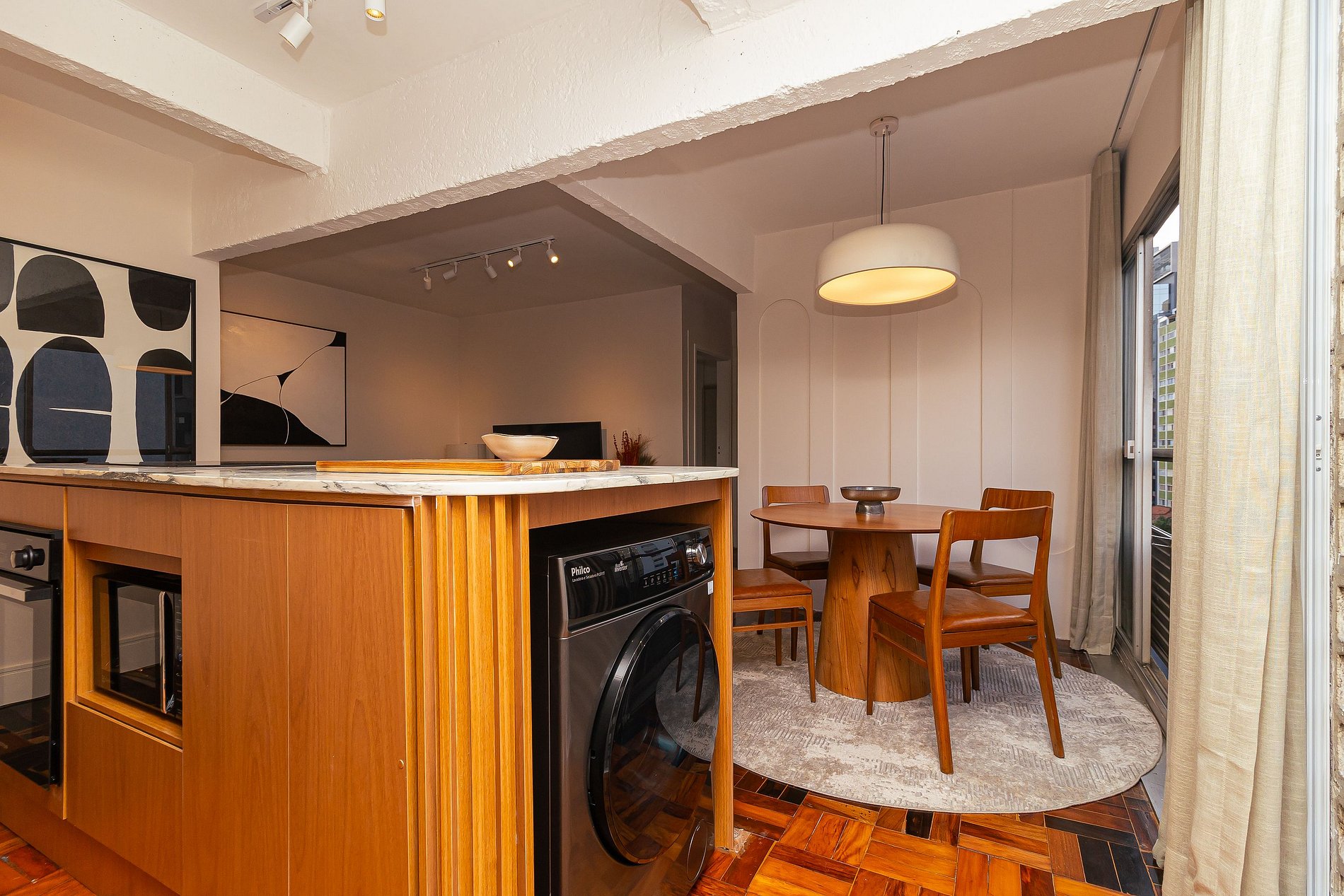 The complete and modern kitchen is an invitation to culinary lovers, equipped with a washer and dryer for your convenience, as well as an oven, stove and refrigerator. Here, style meets functionality to create an environment where every detail has been thought of to make your stay even more special.
