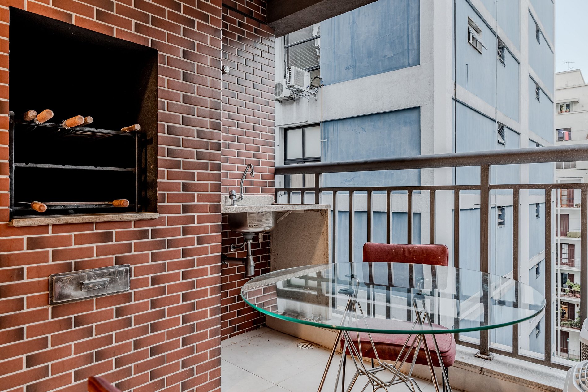 Comfortable 2-bedroom apartment on Martins Fontes Street in central São Paulo. The unit features a queen suite, a second bedroom with a double bed, a fully equipped open kitchen, dining table for four, and a cozy balcony with a barbecue grill. Both bedrooms have air conditioning. Located in a modern building with 24h concierge and elevator. Walking distance to Sírio-Libanês Hospital, 9 de Julho Hospital, Copan, Estadão and the famous Famiglia Mancini restaurant.
