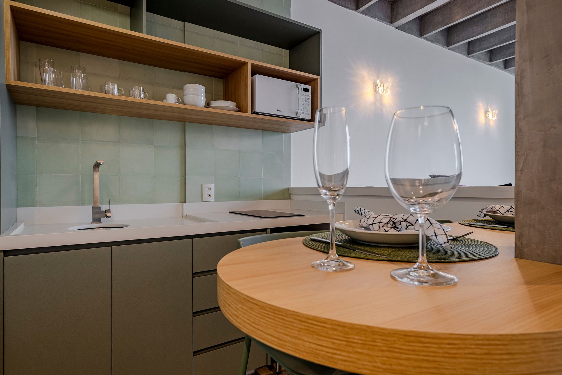 The space stands out for its design: green tones, cozy elements and thoughtful details create an urban garden vibe that feels welcoming and unique. Everything was carefully planned to combine comfort, functionality and a pleasant aesthetic.