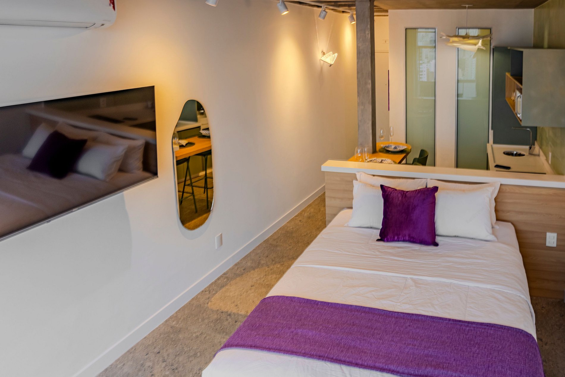 The studio includes a comfortable queen-size bed, a TV for relaxing moments and a fully equipped kitchen, ideal for both short and long stays. The layout and lighting make the space practical, cozy and enjoyable.