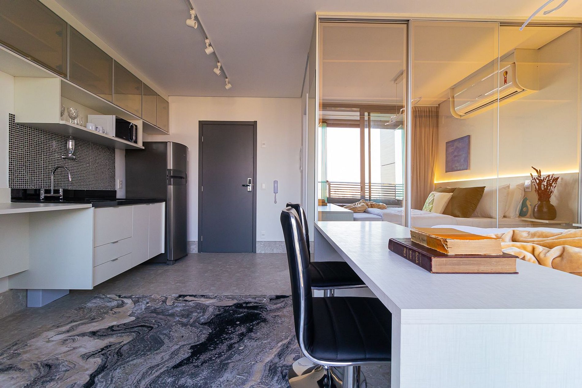 Complete and renovated studio at Helbor Wide on Avenida Rebouças in the Pinheiros neighborhood, easy access to Jardim Paulista and Faria Lima. With a flat and tree-lined view from the twentieth floor, the apartment is elegant and cozy, has a balcony and parking space as well as a heated pool on the roof, cinema, mall, restaurants and complete leisure.