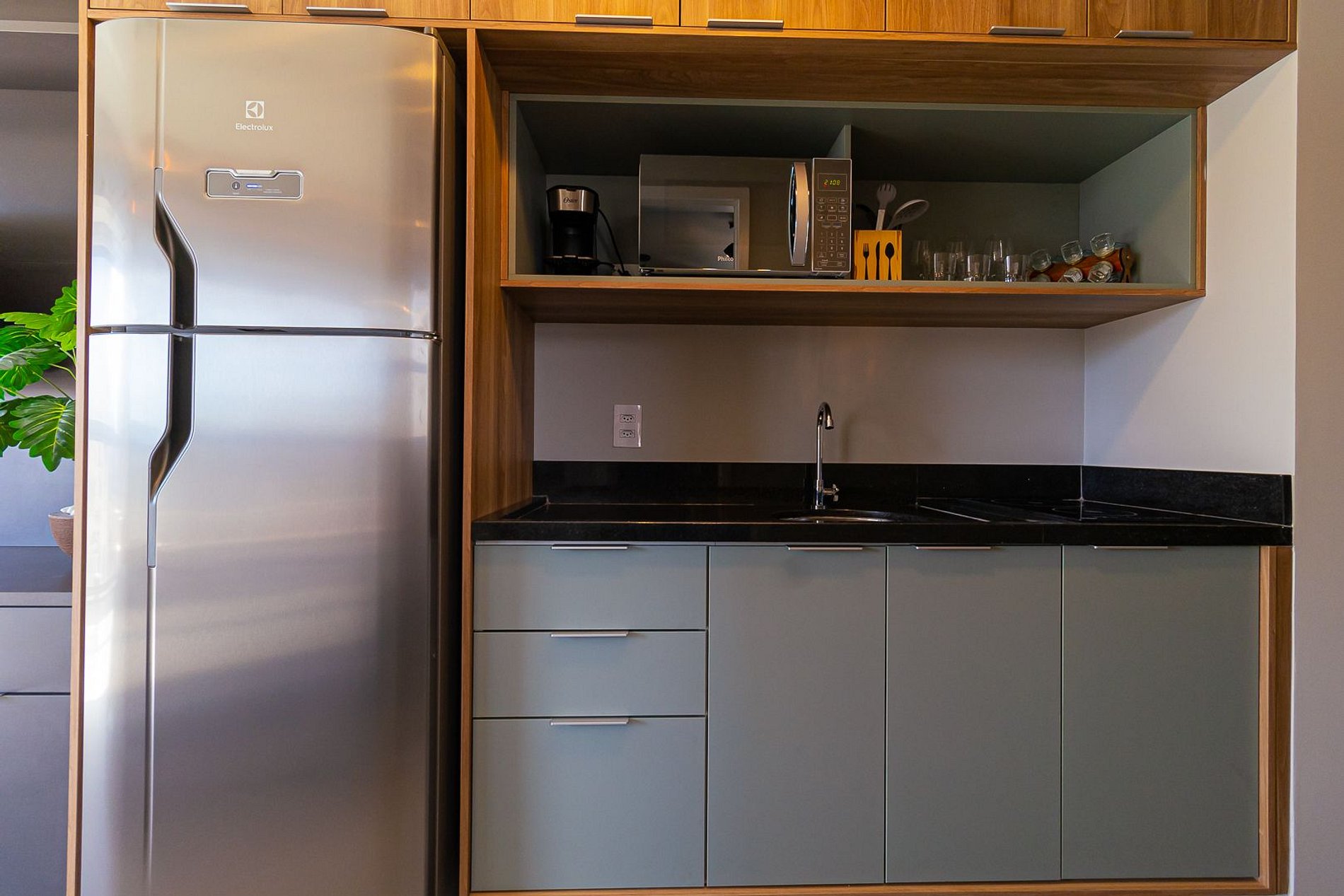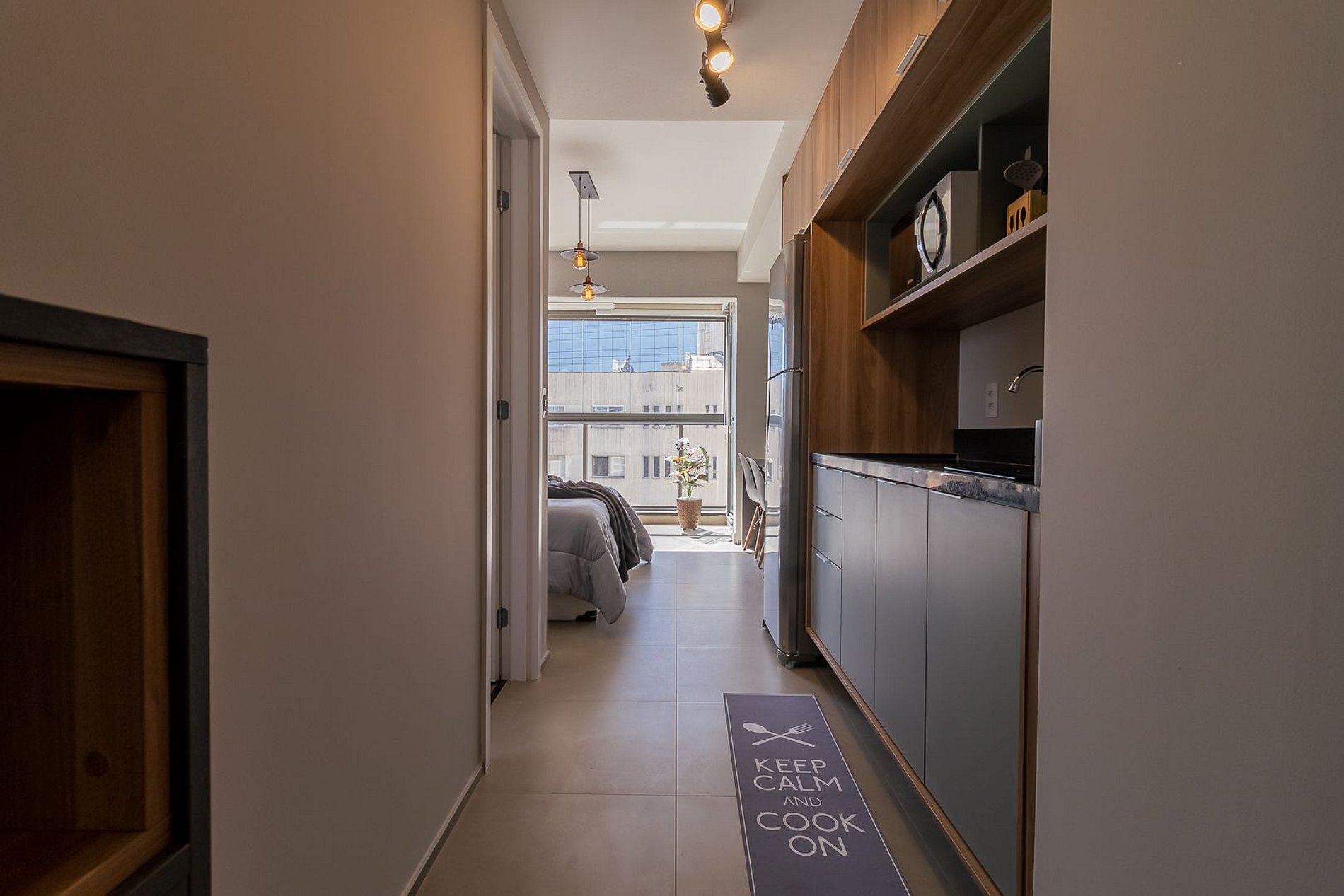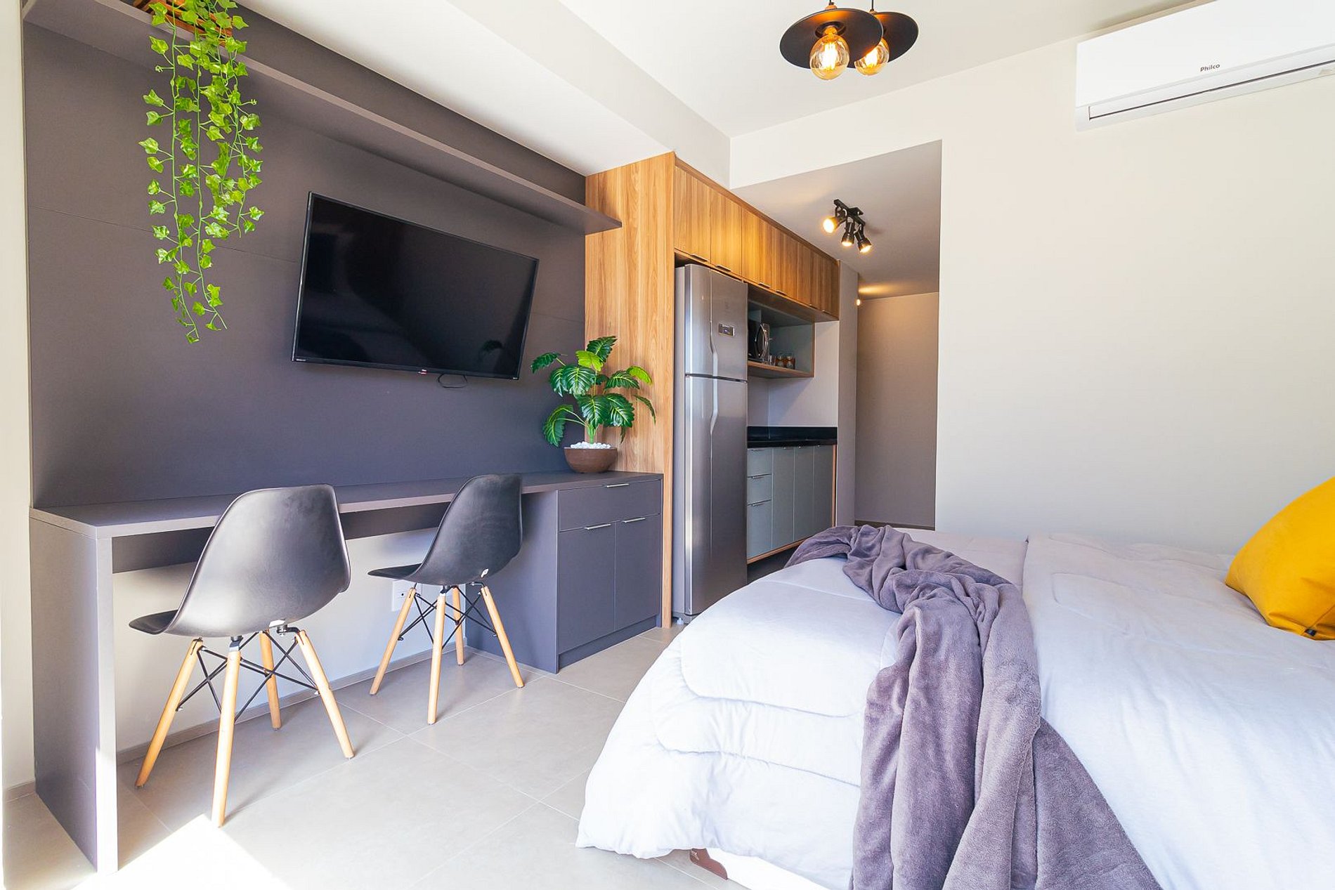 Complete and comfortable studio, it has a clean decoration that combines design and modernity with an urban touch of the city of São Paulo, in beige and gray colors, it has wooden shelves, gray cabinets, warm lamp chandeliers with regulated lighting and studio spots. The apartment has a dining table, induction cooktop, refrigerator, microwave, kitchenware, bowls, 42" television, queen-size bed and white bathroom with window. In addition to air conditioning, we offer comfortable bedding. and new, iron, hangers, shampoo, soap and hair dryer.