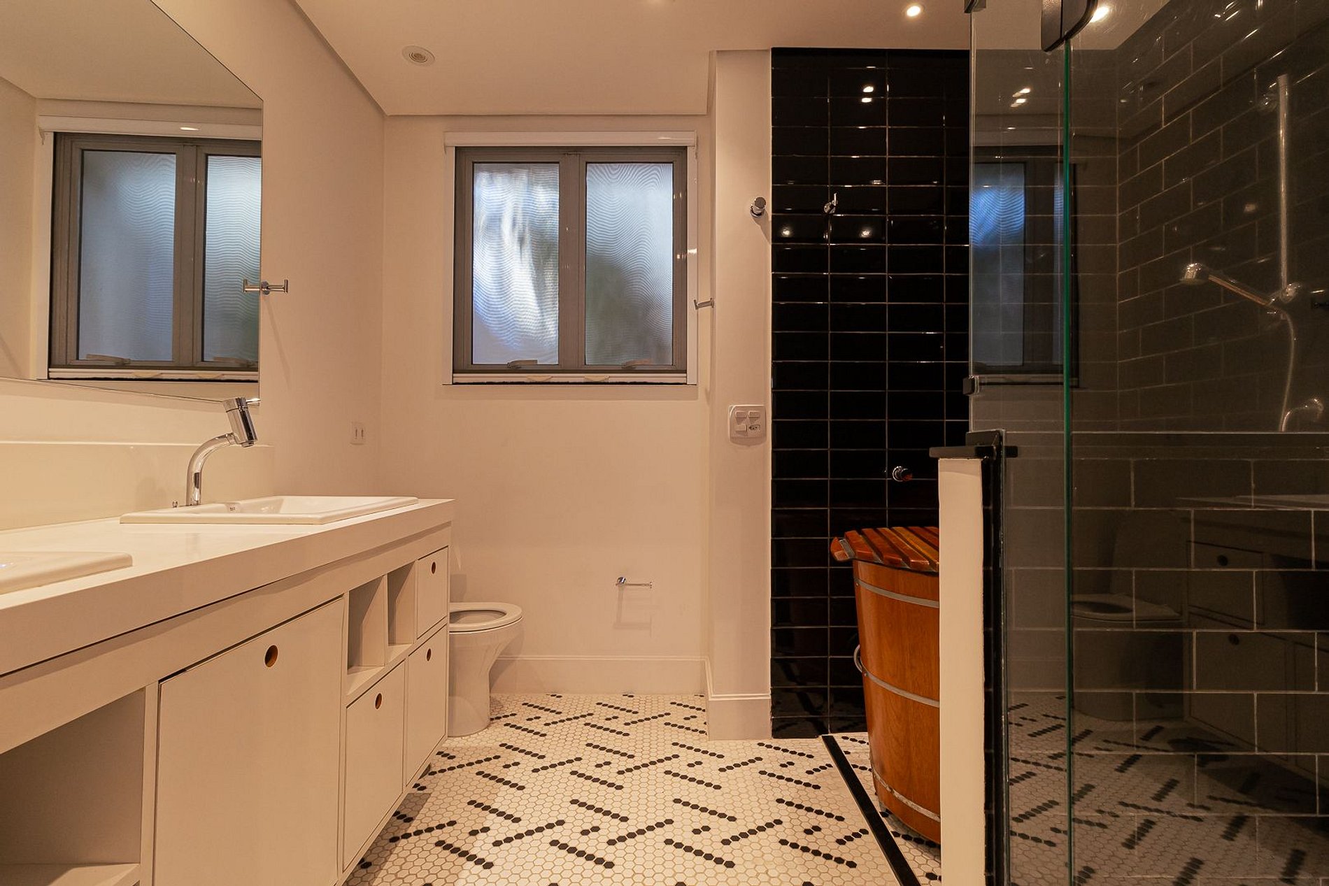 The suite is very spacious with a King bed and reading lamps on each side with individual lighting, television, air conditioning, 3 good-sized closets and at the entrance to the room a mirror that stretches from floor to ceiling. In the closet next to the bed we have the entrance to the suite's bathroom, with a retro feel, due to the black and white hexagonal flooring that was widely used in the 50s and 60s, large countertop with two sinks and lower cabinets, storage area bath and also an area with a hot tub so you can enjoy a great relaxing bath.