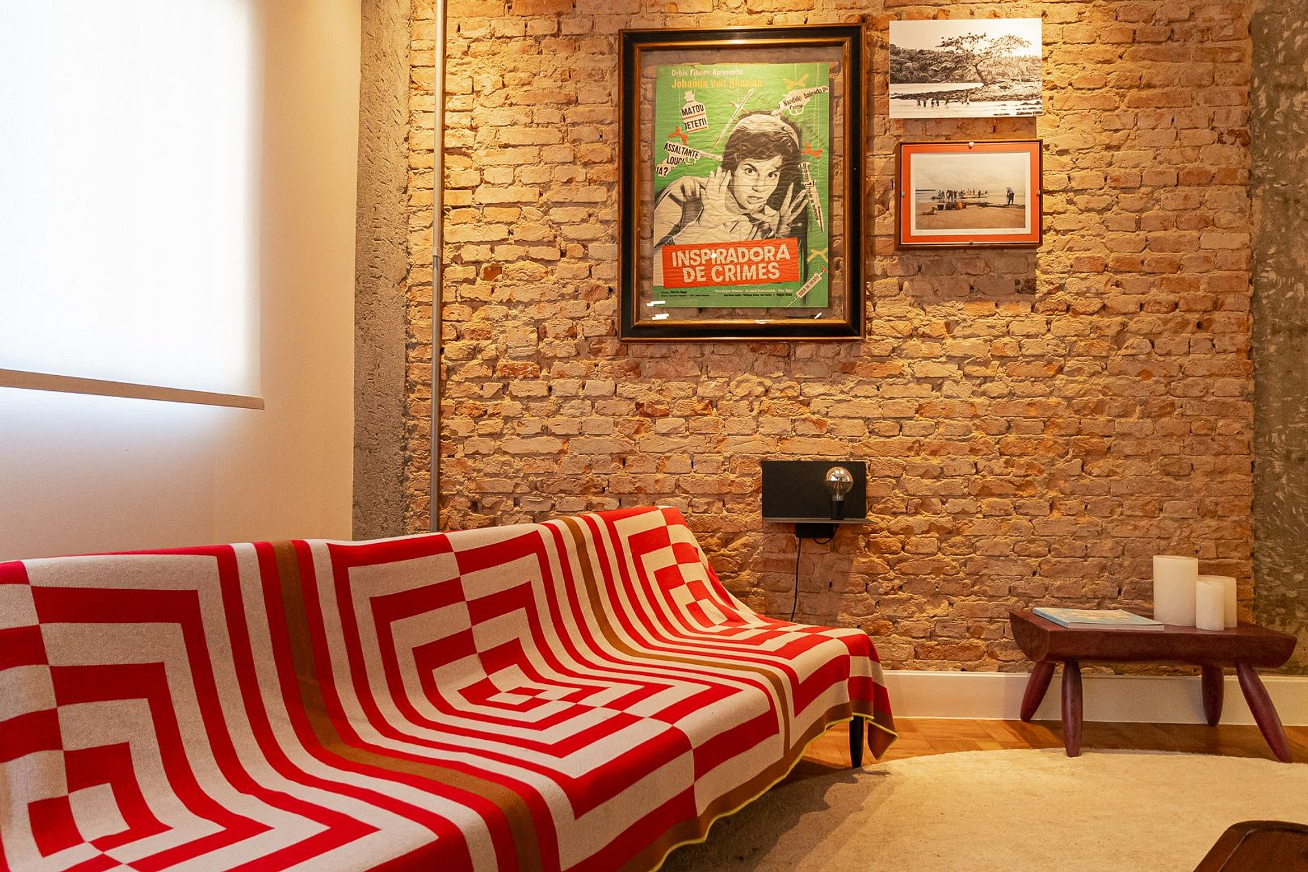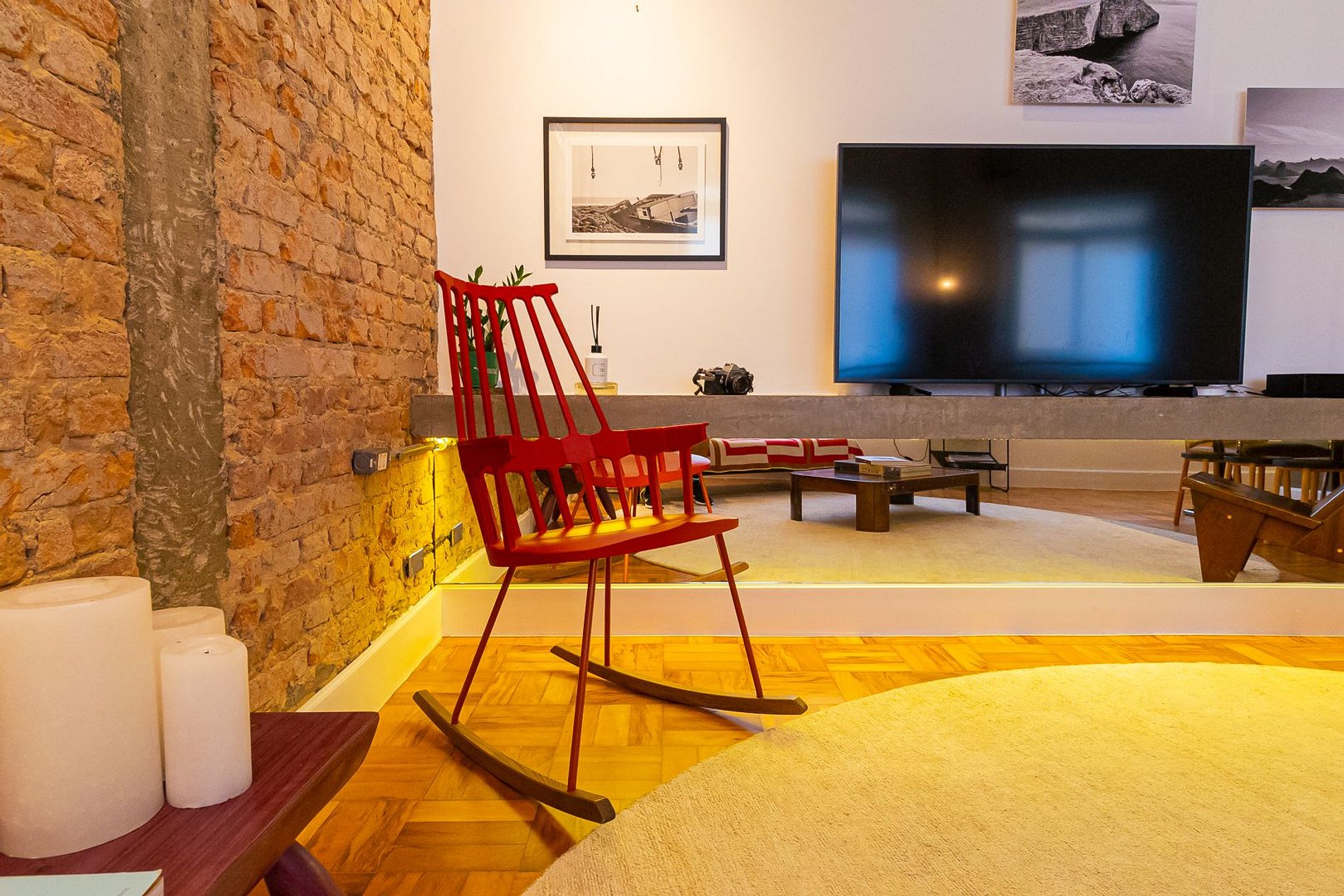 As we enter the apartment, it is impossible not to look directly at the brick wall that forms a mini-gallery with industrial-style lighting that highlights it. The ambient lighting is also done with the yellowish tone of the lights and the exclusively designed lamps transform the environment, making it very intimate and the air conditioning to improve the temperature on hot days. The entrance hall with a floor-to-ceiling mirror and a purple door gives us a feeling of more space, not that it needs it, after all the apartment is very large and the living room is very spacious, consisting of 2 bedrooms.