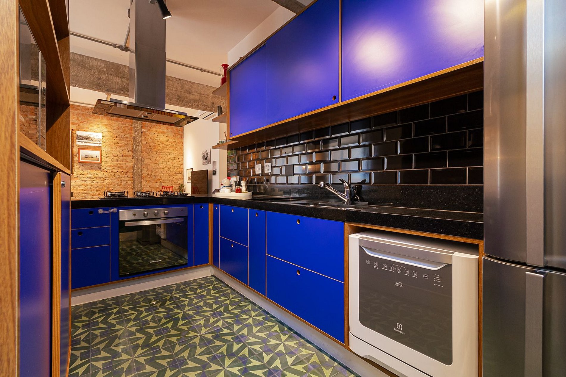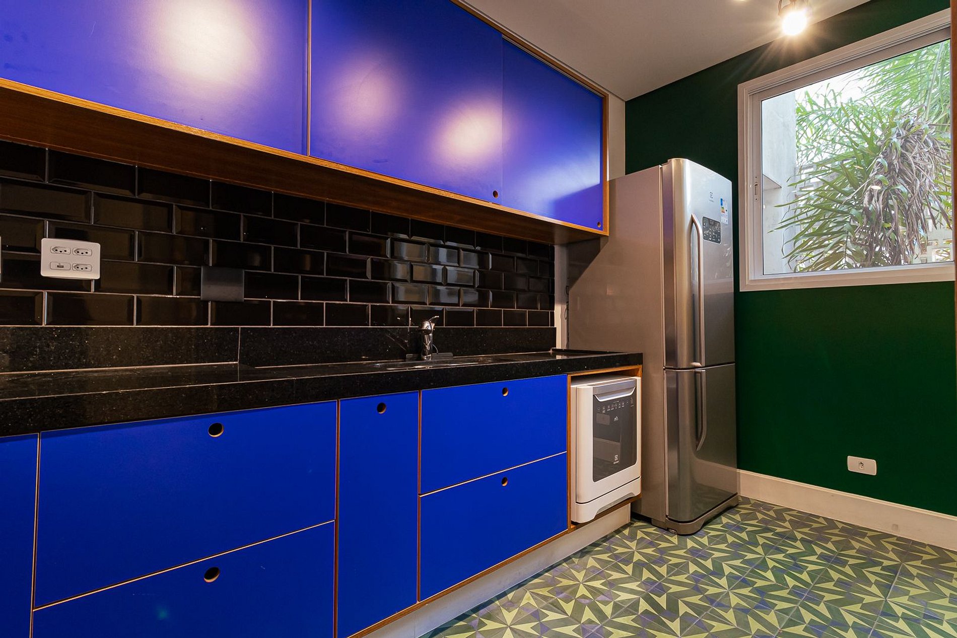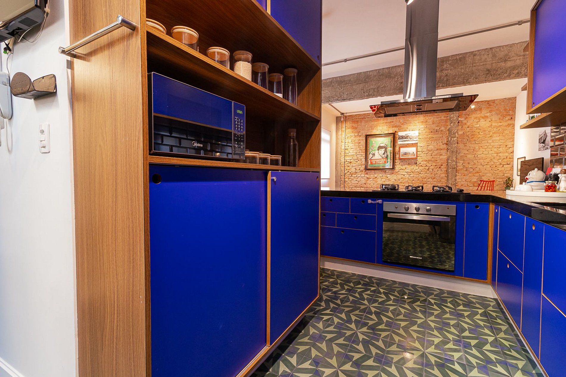 The kitchen has a hydraulic tile floor in blue and green tones that combines with the beautiful and functional joinery in vibrant Cobalt Blue and wood, with a built-in oven and space for a dishwasher. The L-shaped countertop has a built-in cooktop and double sink, with lighting in the upper joinery, so we have a great and well-lit space for use by those who enjoy cooking and want to enjoy this extremely cozy kitchen. The service area also has great space, a closet with niches and drawers, a washing machine, a ceiling clothesline with a crank and even a support bathroom.
