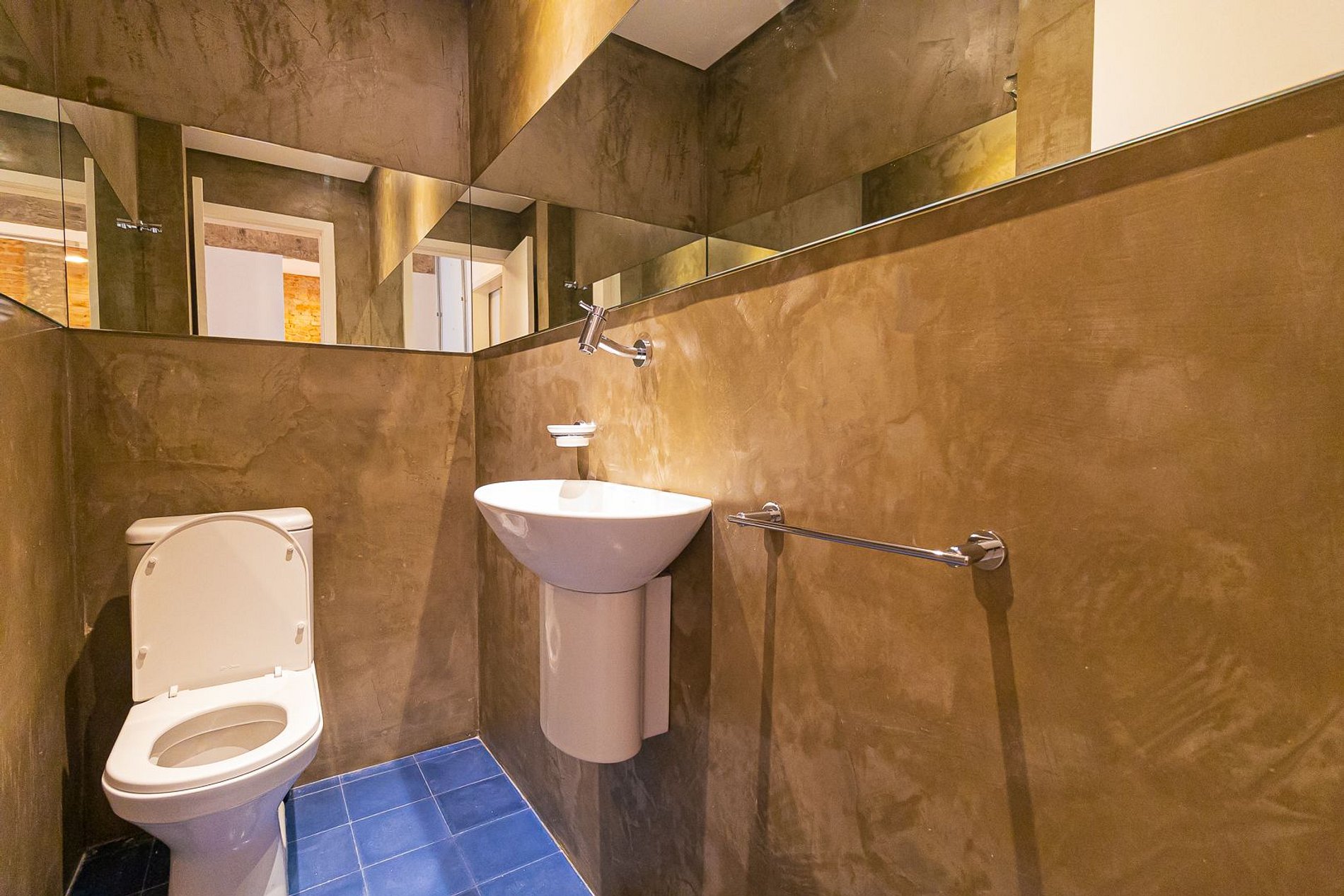 The bathroom with burnt cement walls, white dishes and mirrors that surround practically the entire room.