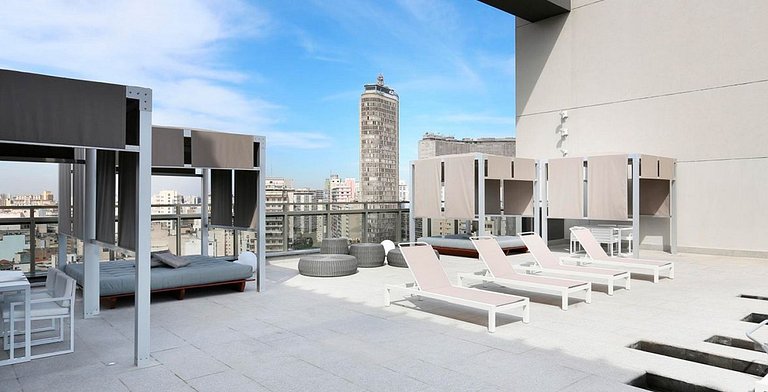 The studio is spacious and complete with warm tones and a balcony overlooking the city. This is an accommodation for those looking for practicality and comfort, as it has a kitchen, comfortable bed, built-in carpentry and air conditioning. In addition to the apartment being wonderful, the building in which it is located has a swimming pool, gym, laundry (paid), and is next to the República metro station, making it convenient to access the city.