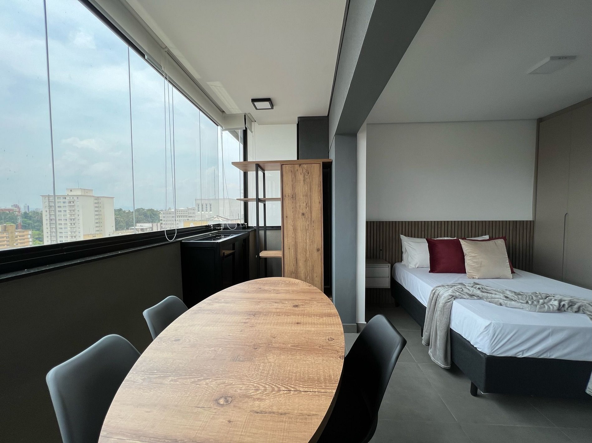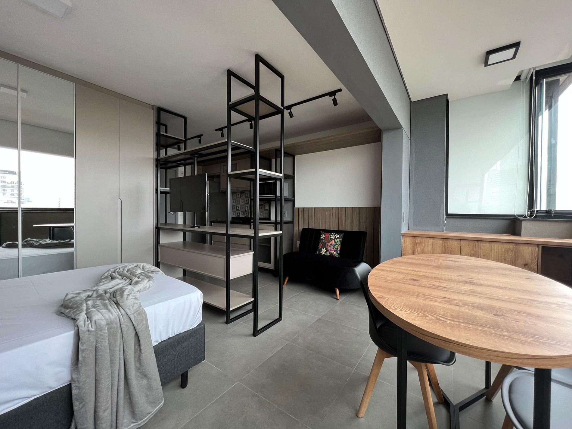 The studio with bespoke furniture is very well decorated in the industrial style, in gray and black colors and with wooden elements bringing an air of sophistication and modernity, its extended balcony and large windows make it spacious and with a high view to give light to the room. The 6-door wardrobe with mirror next to the bed helps to give more spaciousness to the room.
