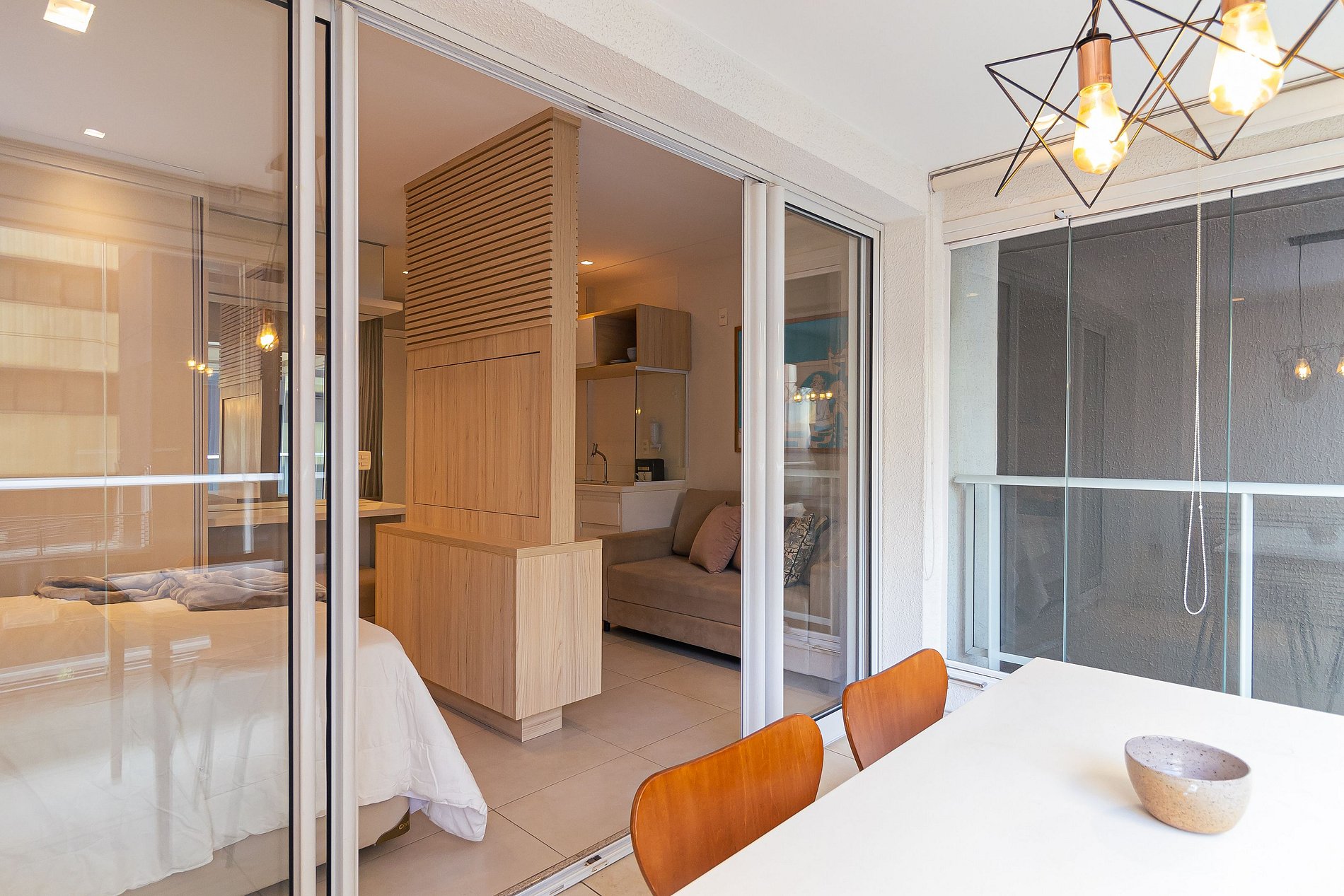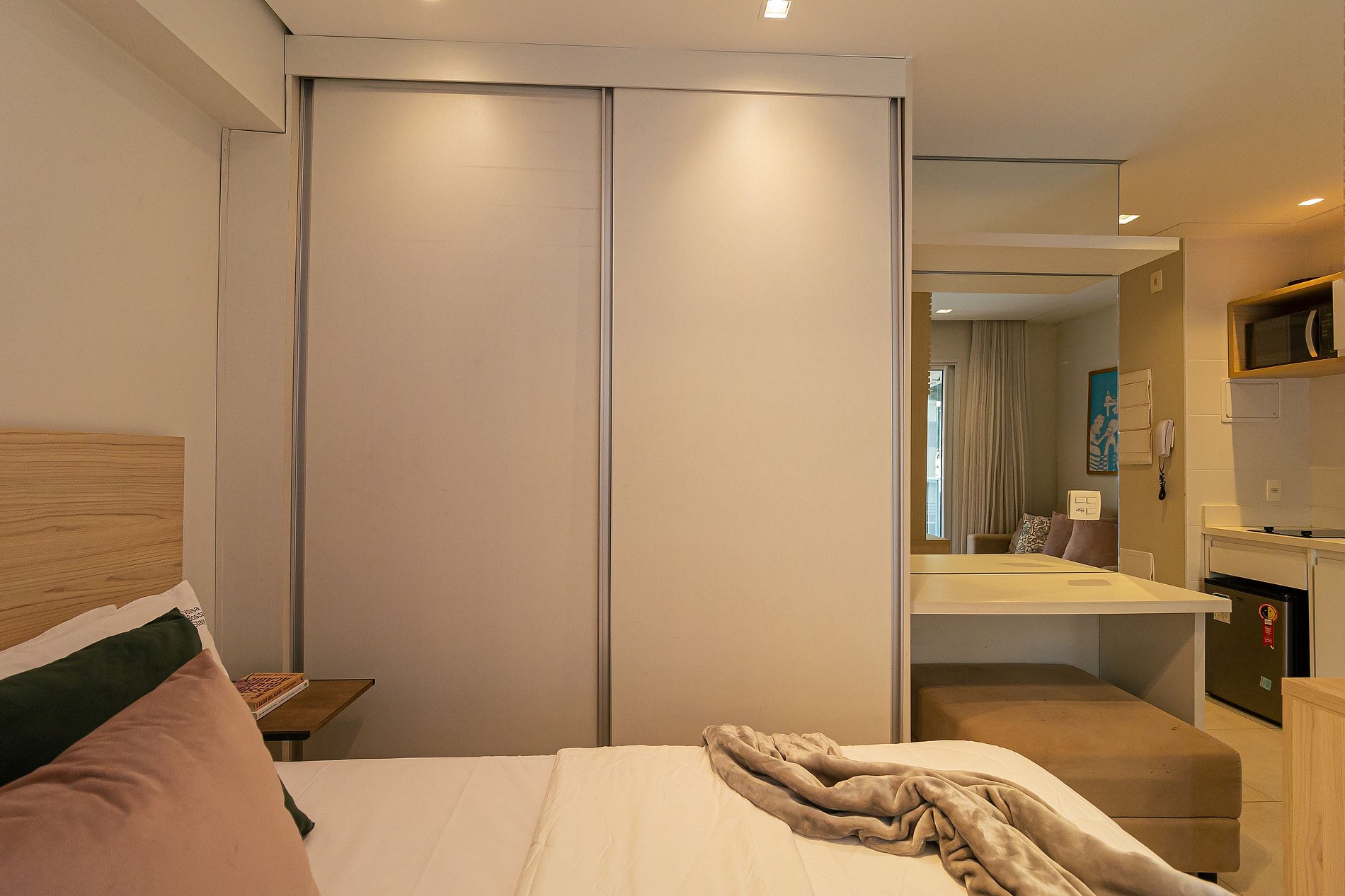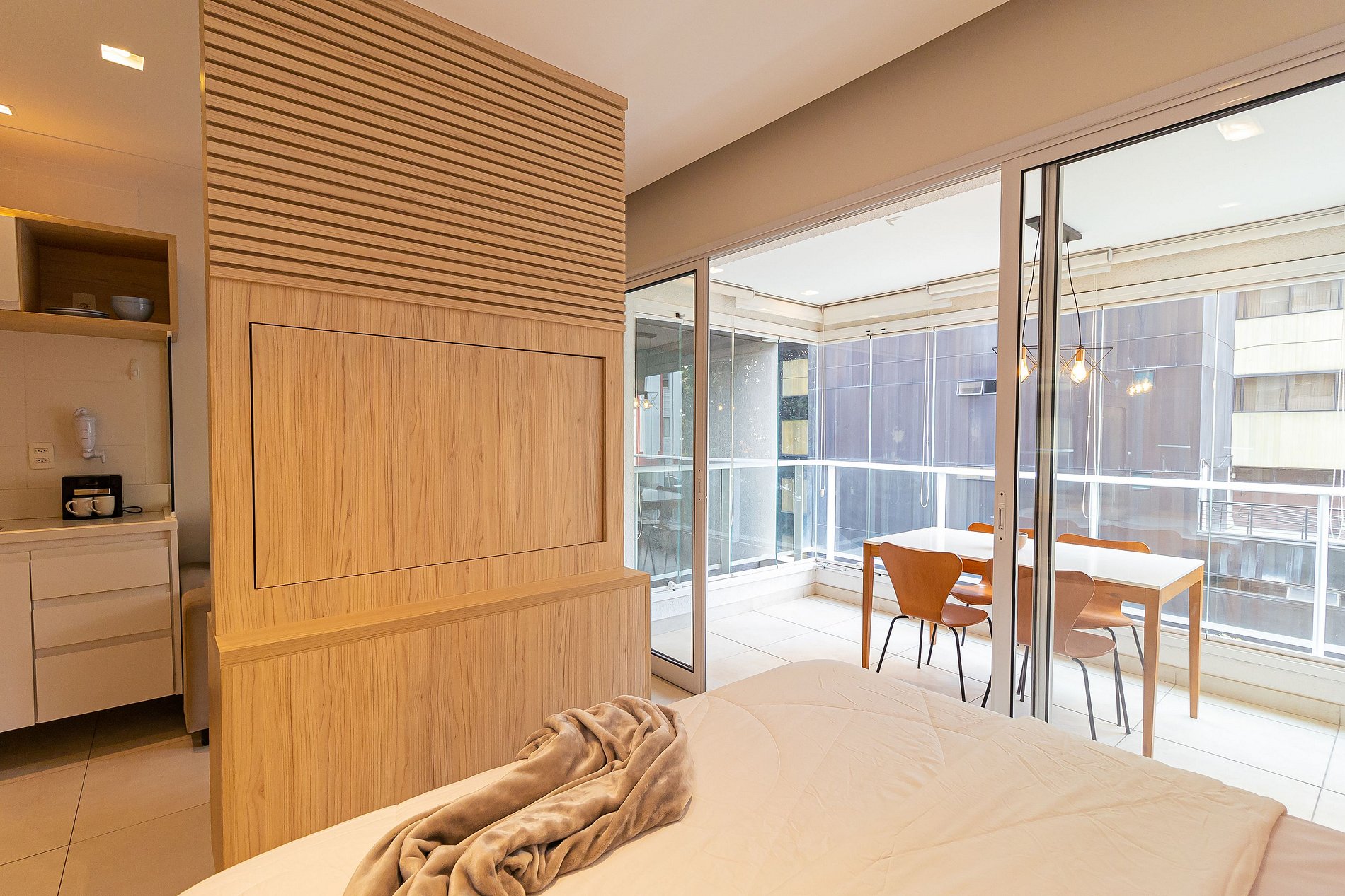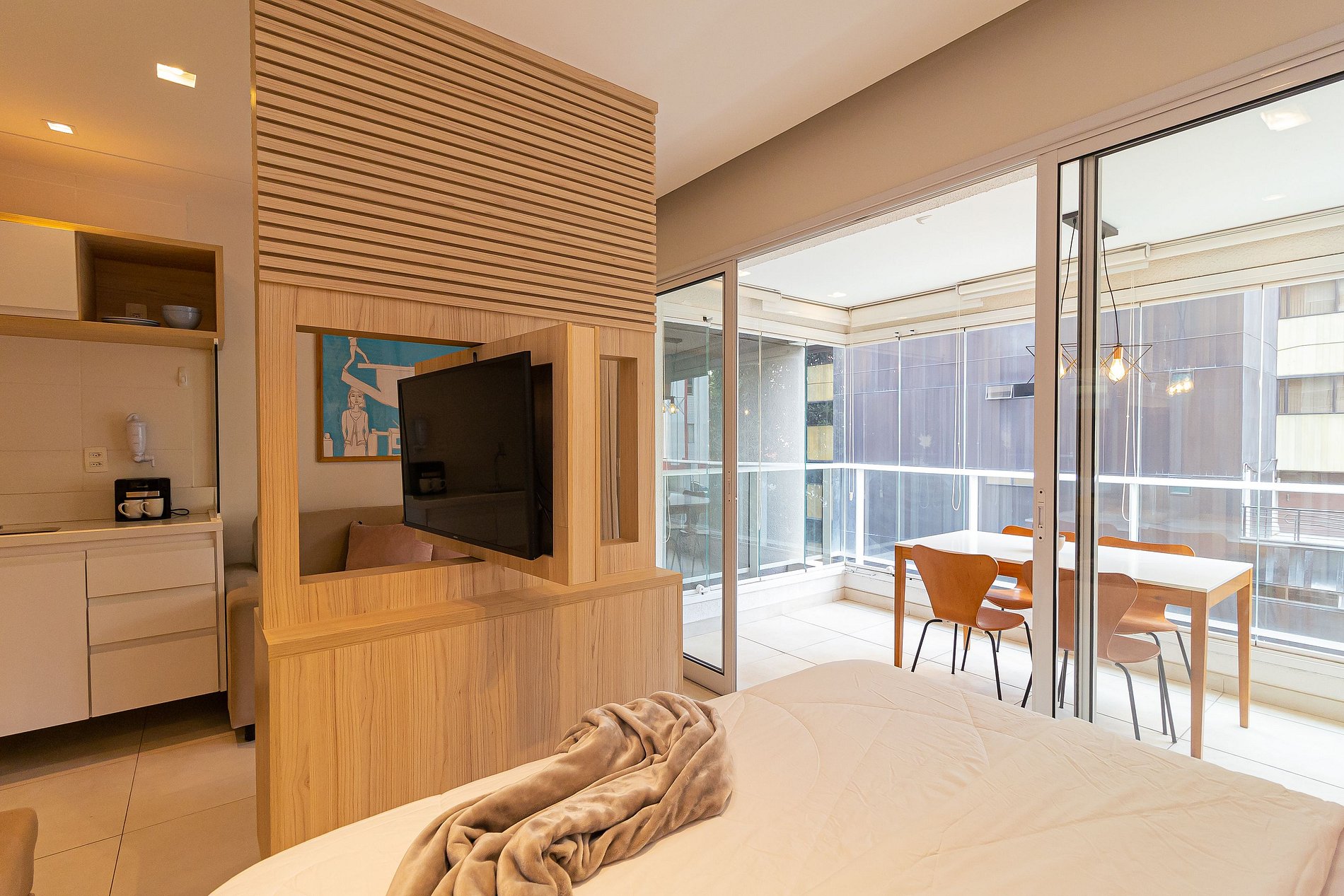 With a functional and cozy design, the studio has a balcony, 1 bedroom, bathroom, living room and kitchen, all integrated harmoniously, with neutral and woody tones that bring lightness to the space and decorative details that make all the difference. is ready for seasonal rental, with loose furniture and built-in joinery items, including: refrigerator, air conditioning, sofa, cooktop, TV, table with chairs, wardrobe and dressing table with large, illuminated mirror.