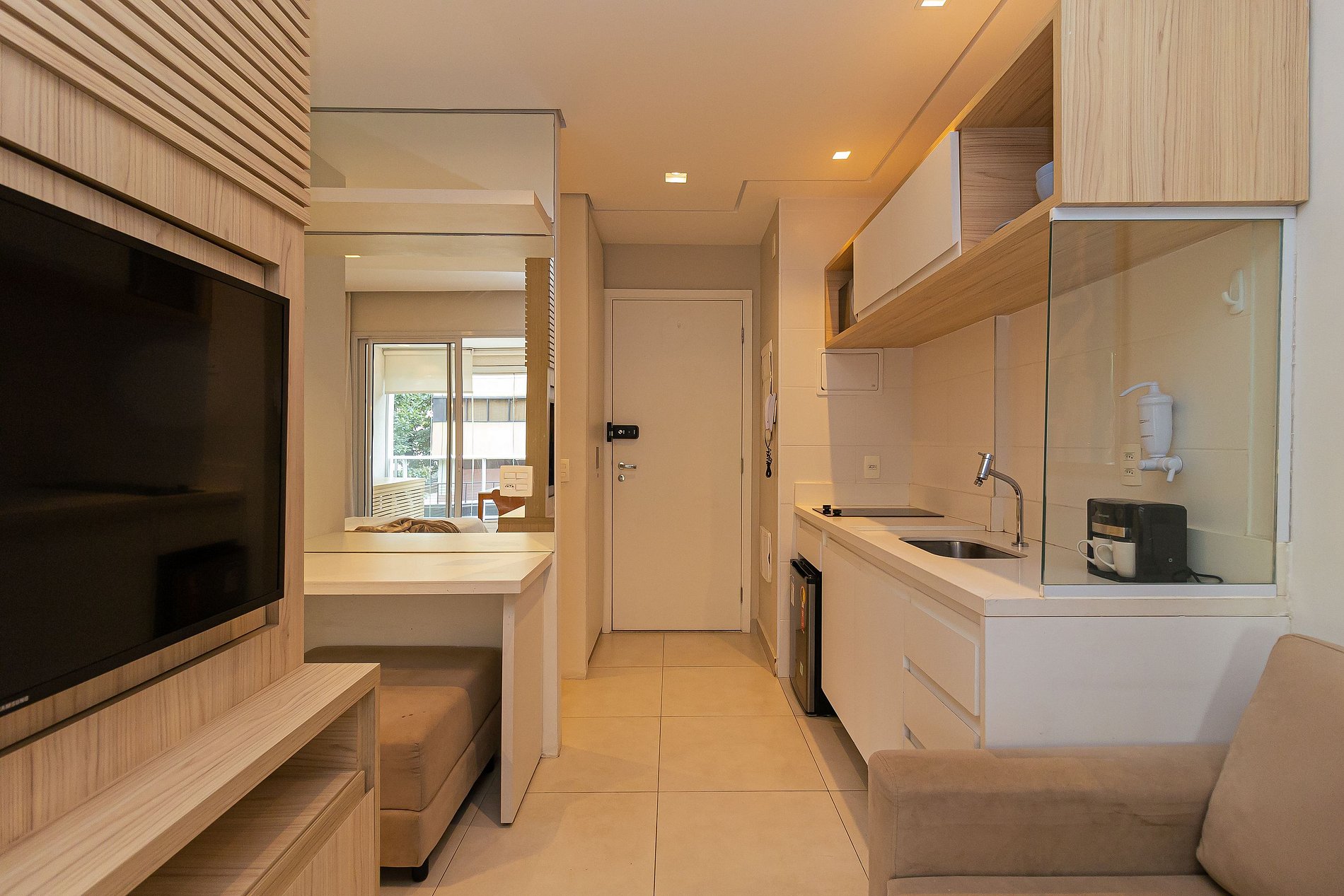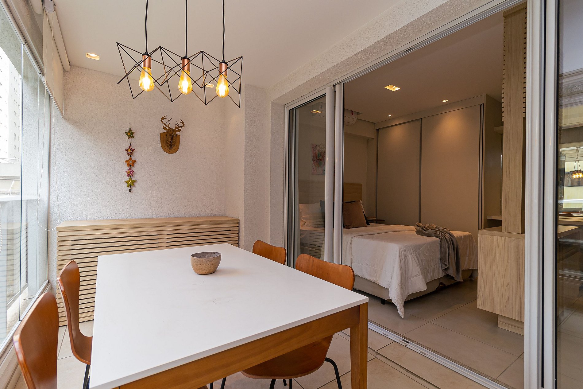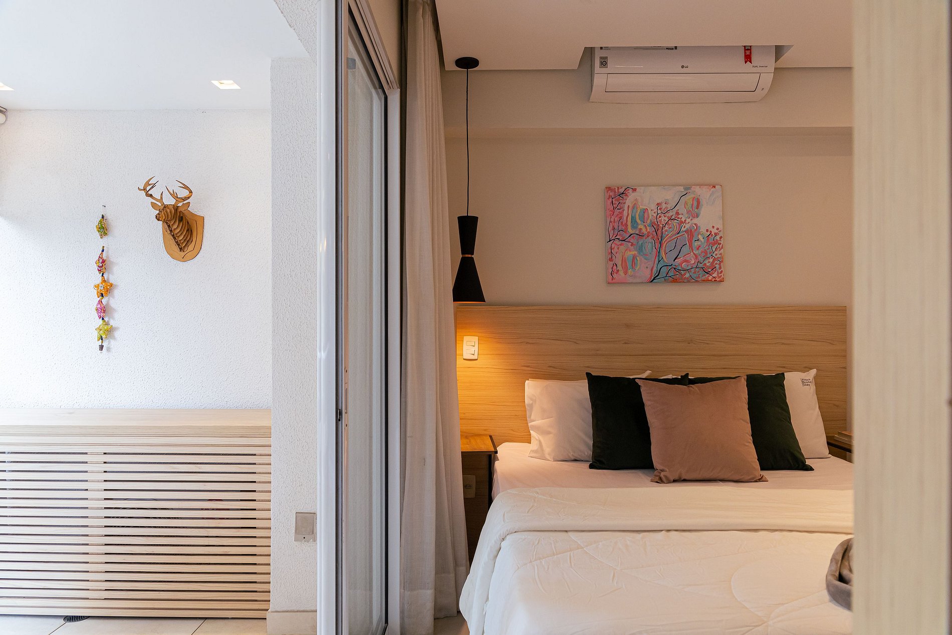 With a functional and cozy design, the studio has a balcony, 1 bedroom, bathroom, living room and kitchen, all integrated harmoniously, with neutral and woody tones that bring lightness to the space and decorative details that make all the difference. is ready for seasonal rental, with loose furniture and built-in joinery items, including: refrigerator, air conditioning, sofa, cooktop, TV, table with chairs, wardrobe and dressing table with large, illuminated mirror.