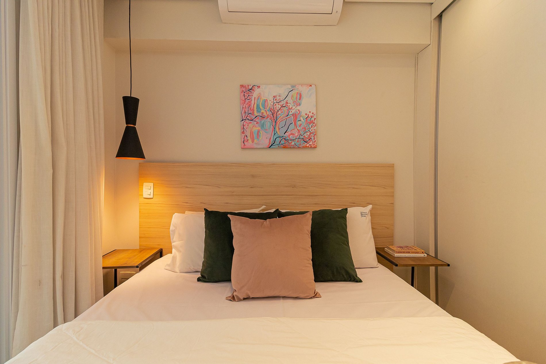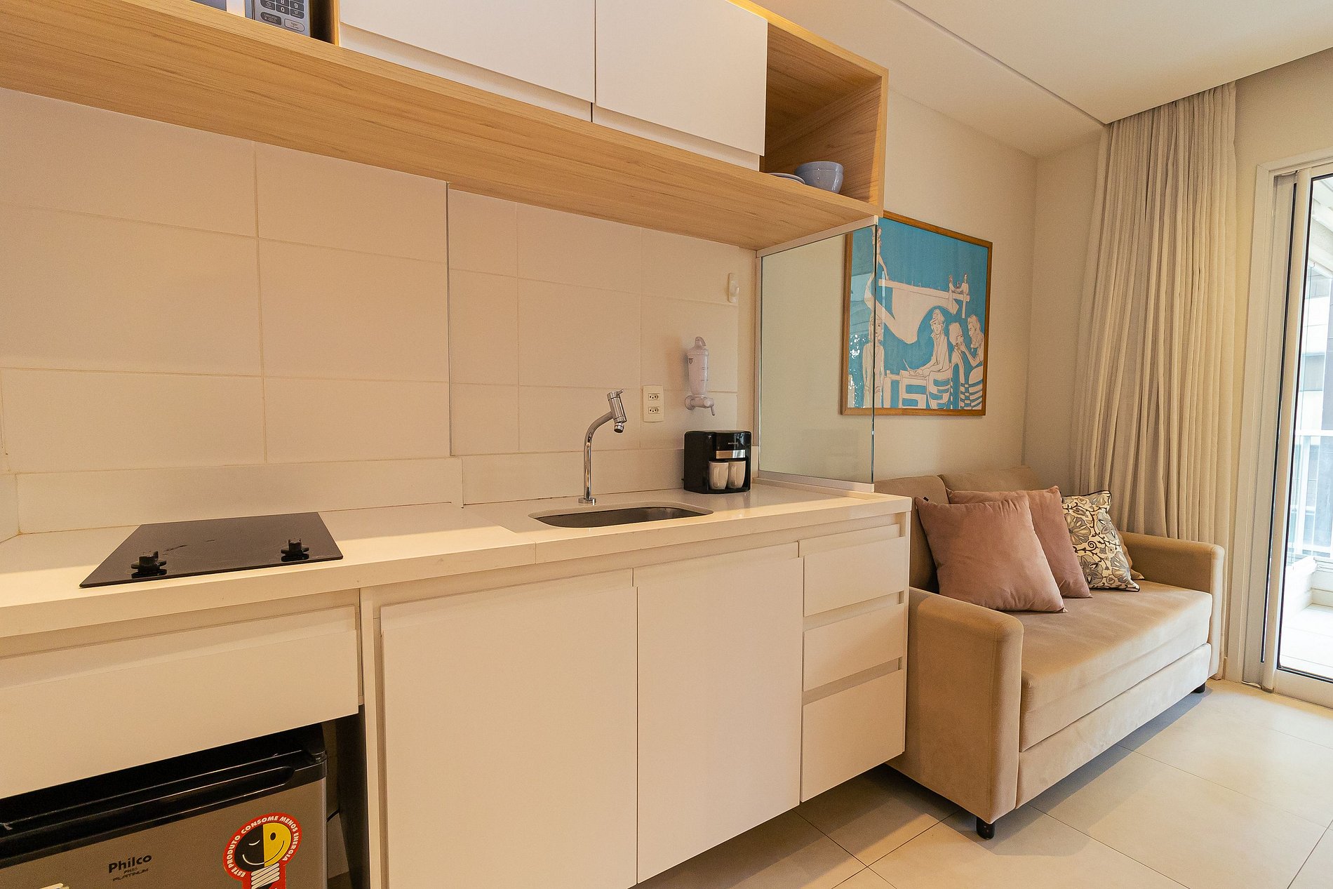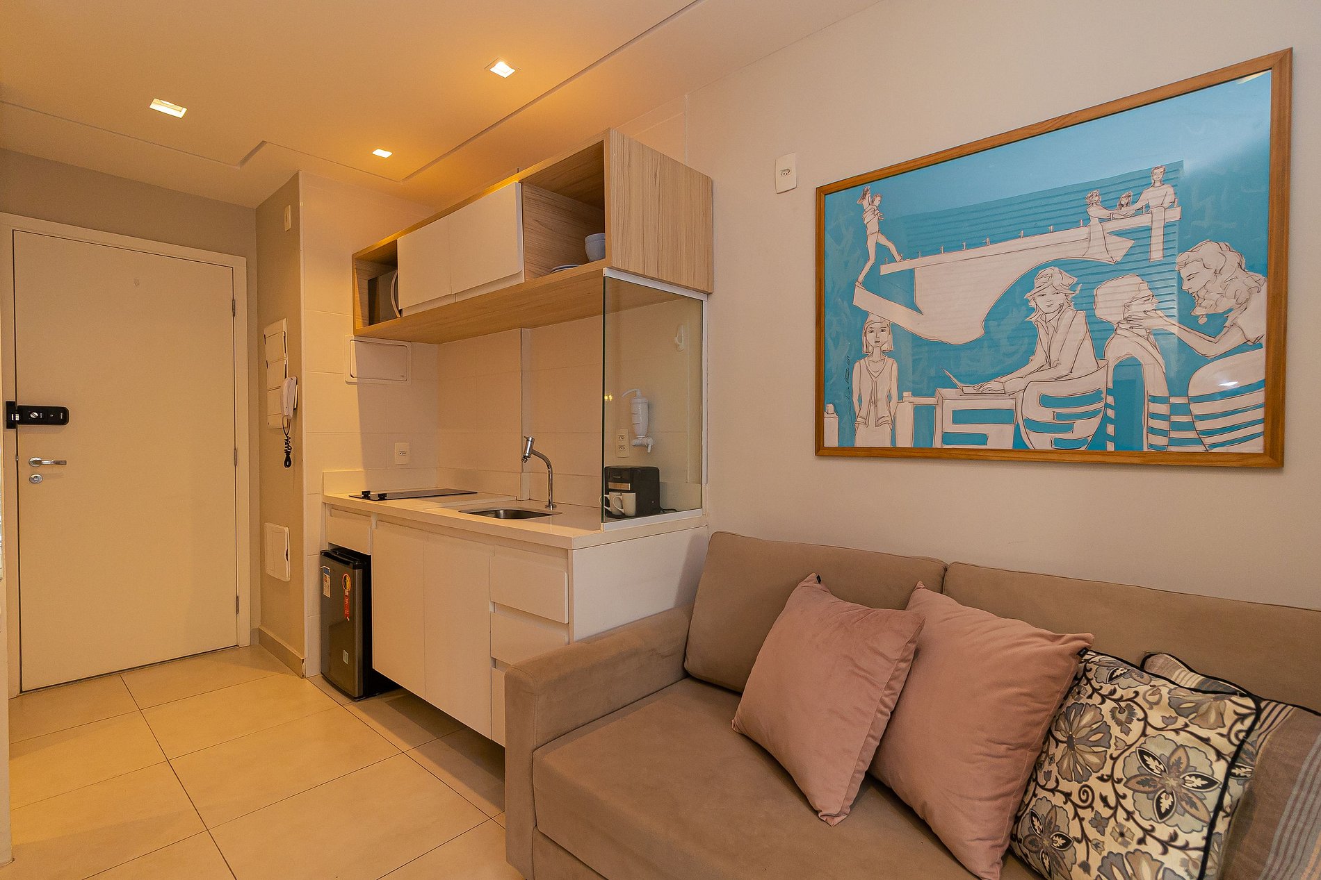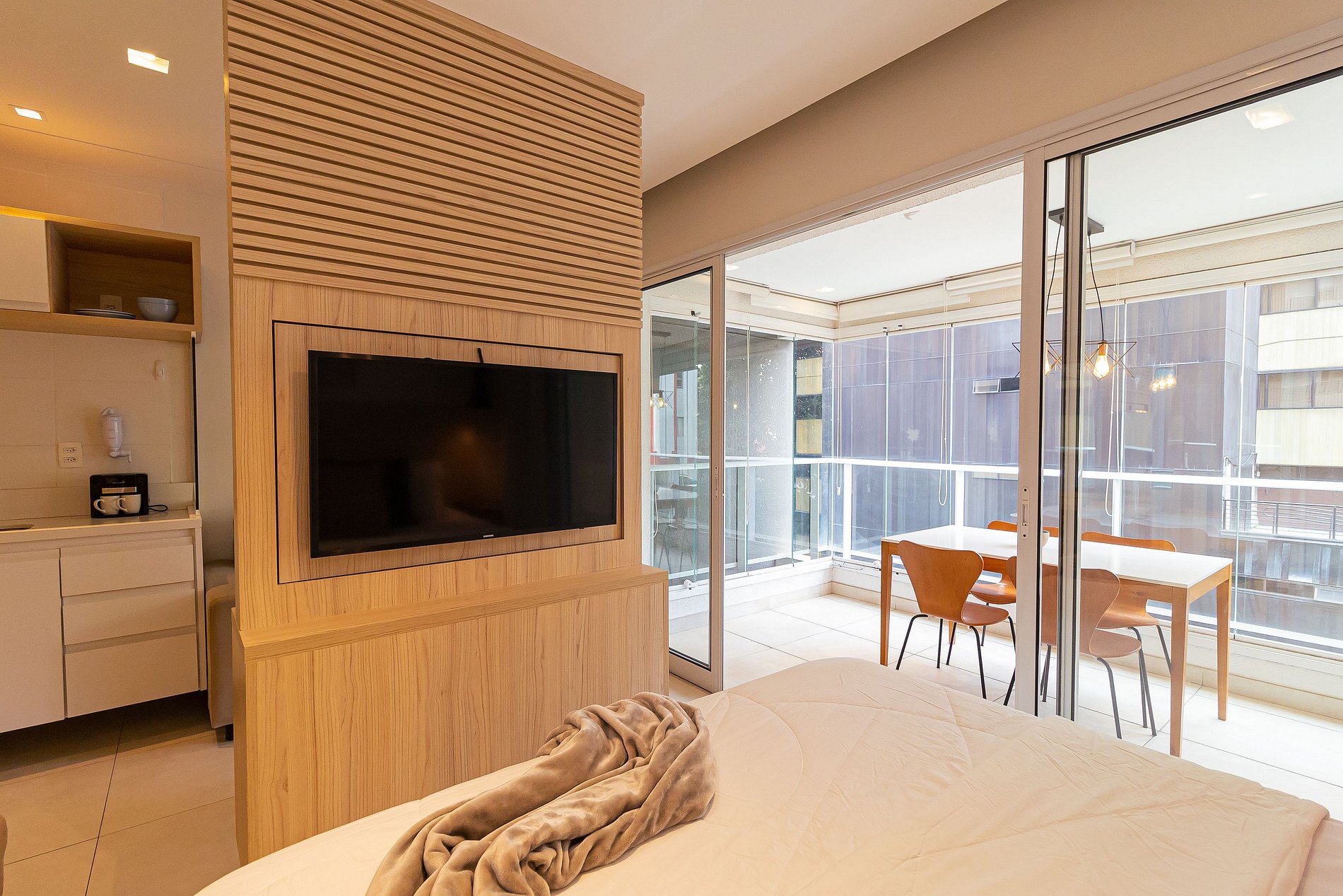With a functional and cozy design, the studio has a balcony, 1 bedroom, bathroom, living room and kitchen, all integrated harmoniously, with neutral and woody tones that bring lightness to the space and decorative details that make all the difference. is ready for seasonal rental, with loose furniture and built-in joinery items, including: refrigerator, air conditioning, sofa, cooktop, TV, table with chairs, wardrobe and dressing table with large, illuminated mirror.