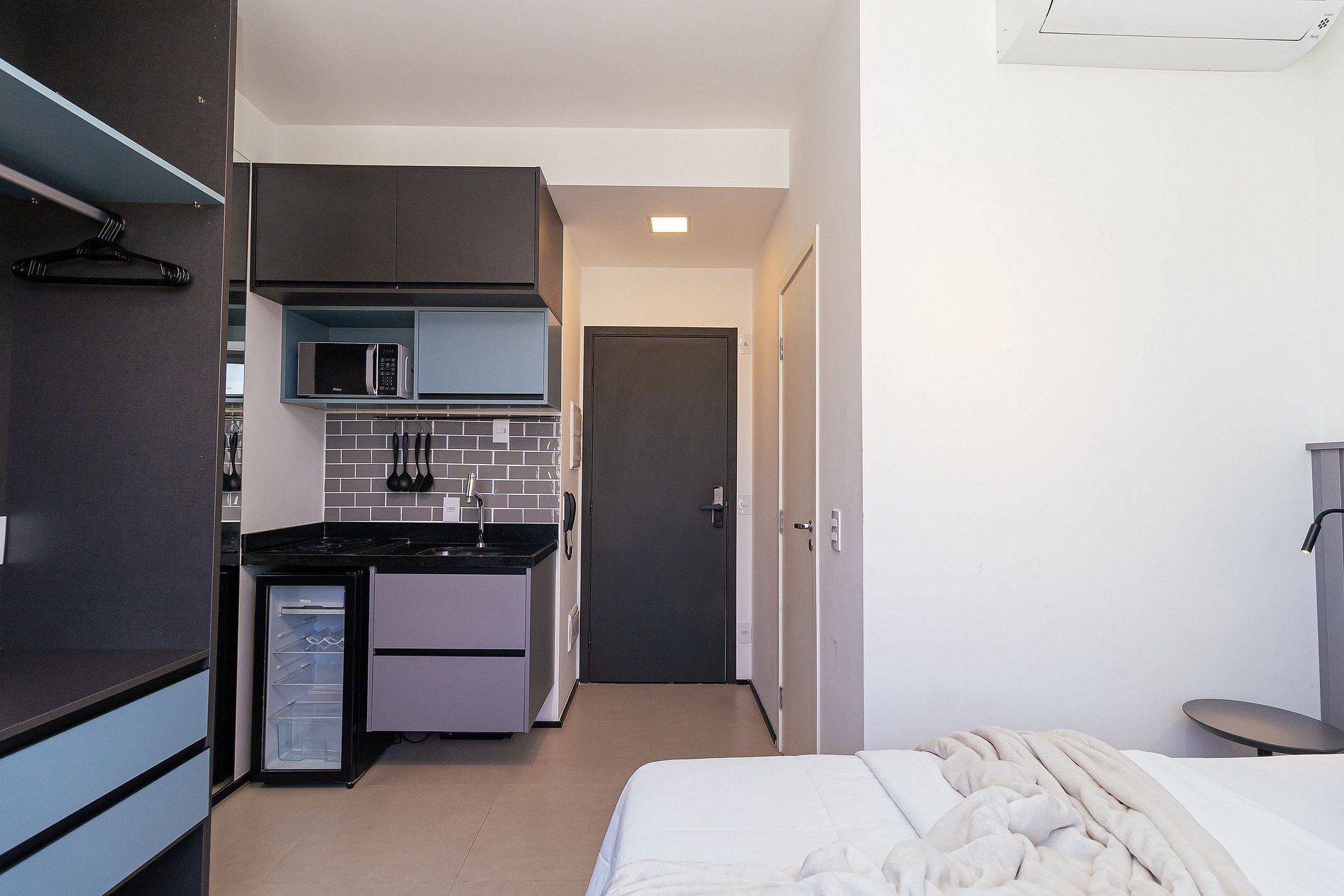 With a privileged view, this accommodation—like a stadium suite—has everything needed for a perfect short-term stay, whether for rest, work, or leisure. The apartment follows a minimalist and functional concept, ensuring comfort and practicality.