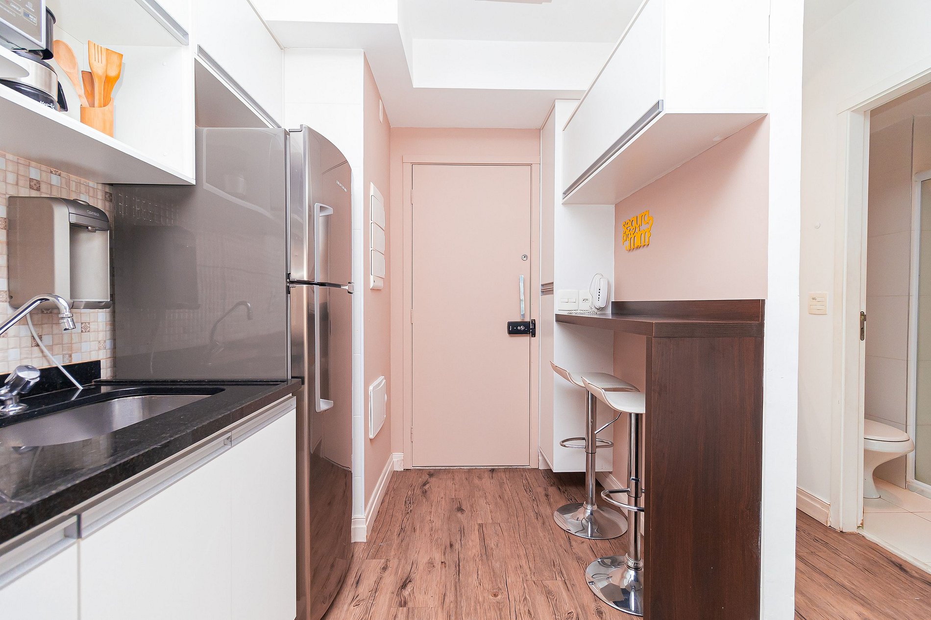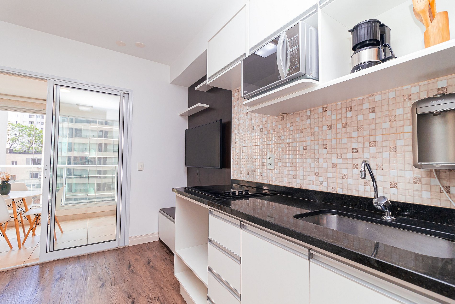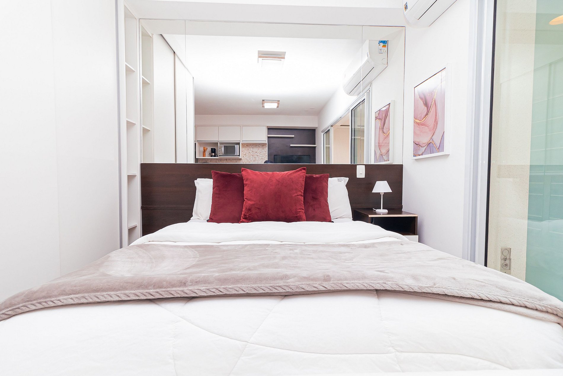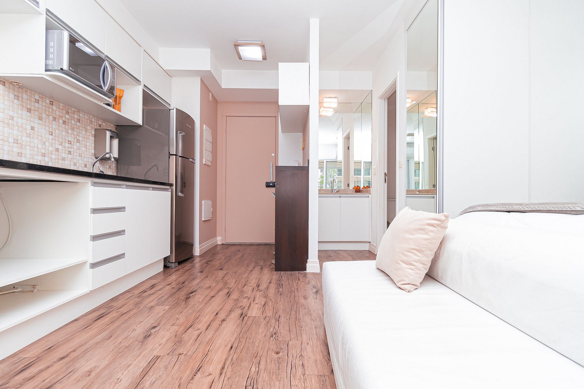 Modernity, comfort, sophistication and convenience? This 34m2 space has all this and a little more. The integrated studio has a bedroom, bathroom, full kitchen and a large and cozy balcony, with several special touches that make a total difference to the environment. Composed of slatted textures and woody and neutral tones, this apartment is pure charm.