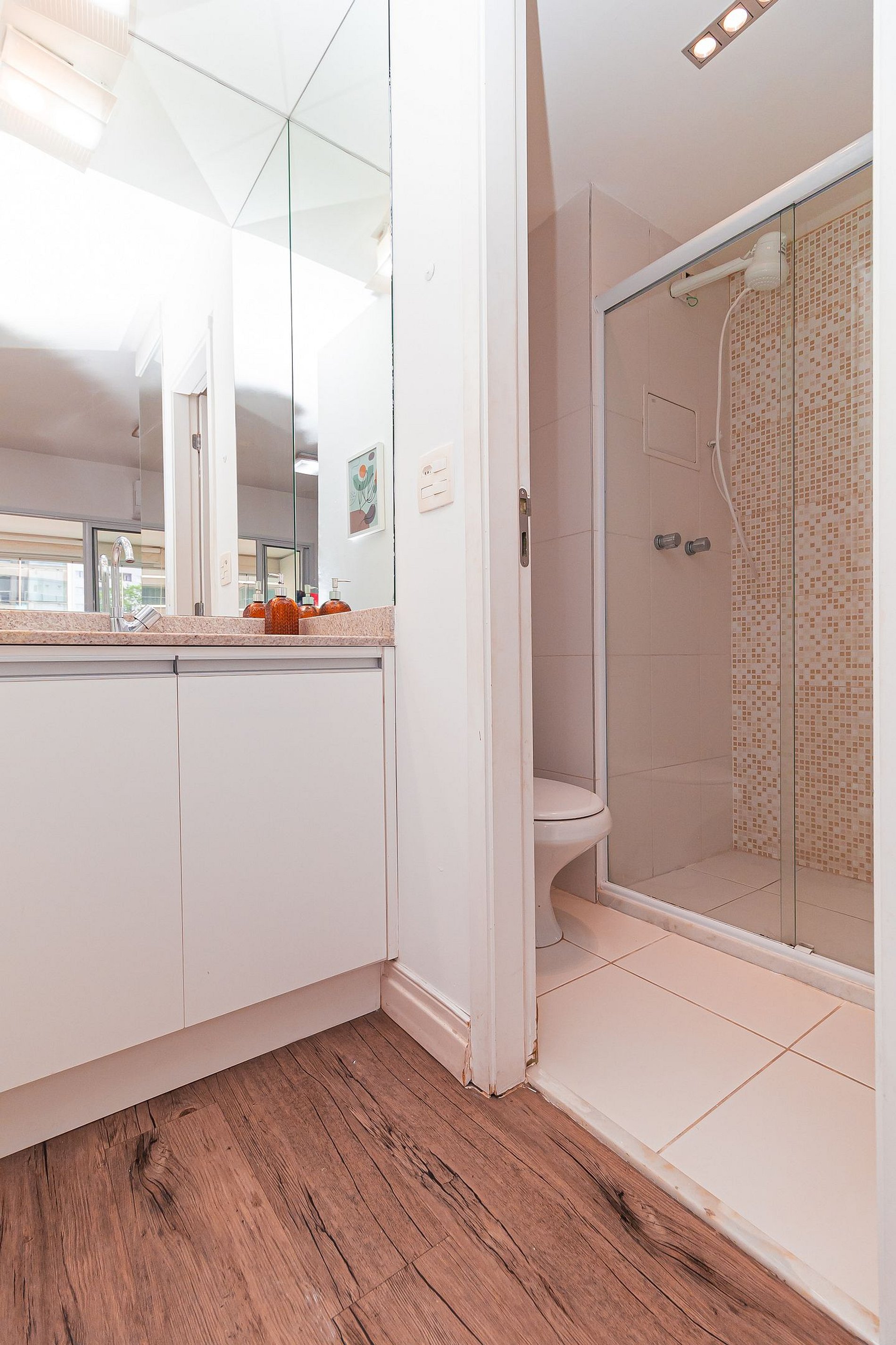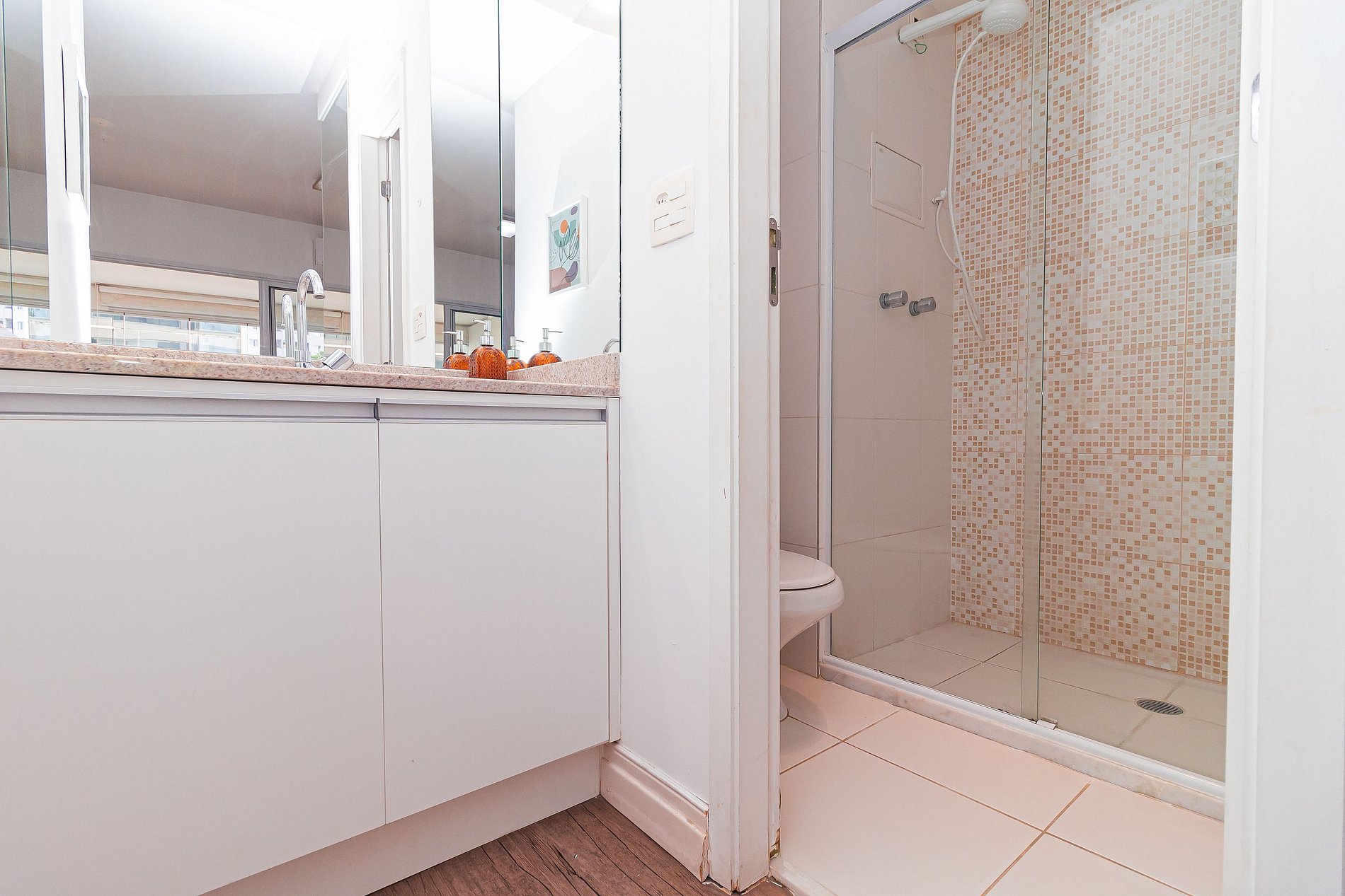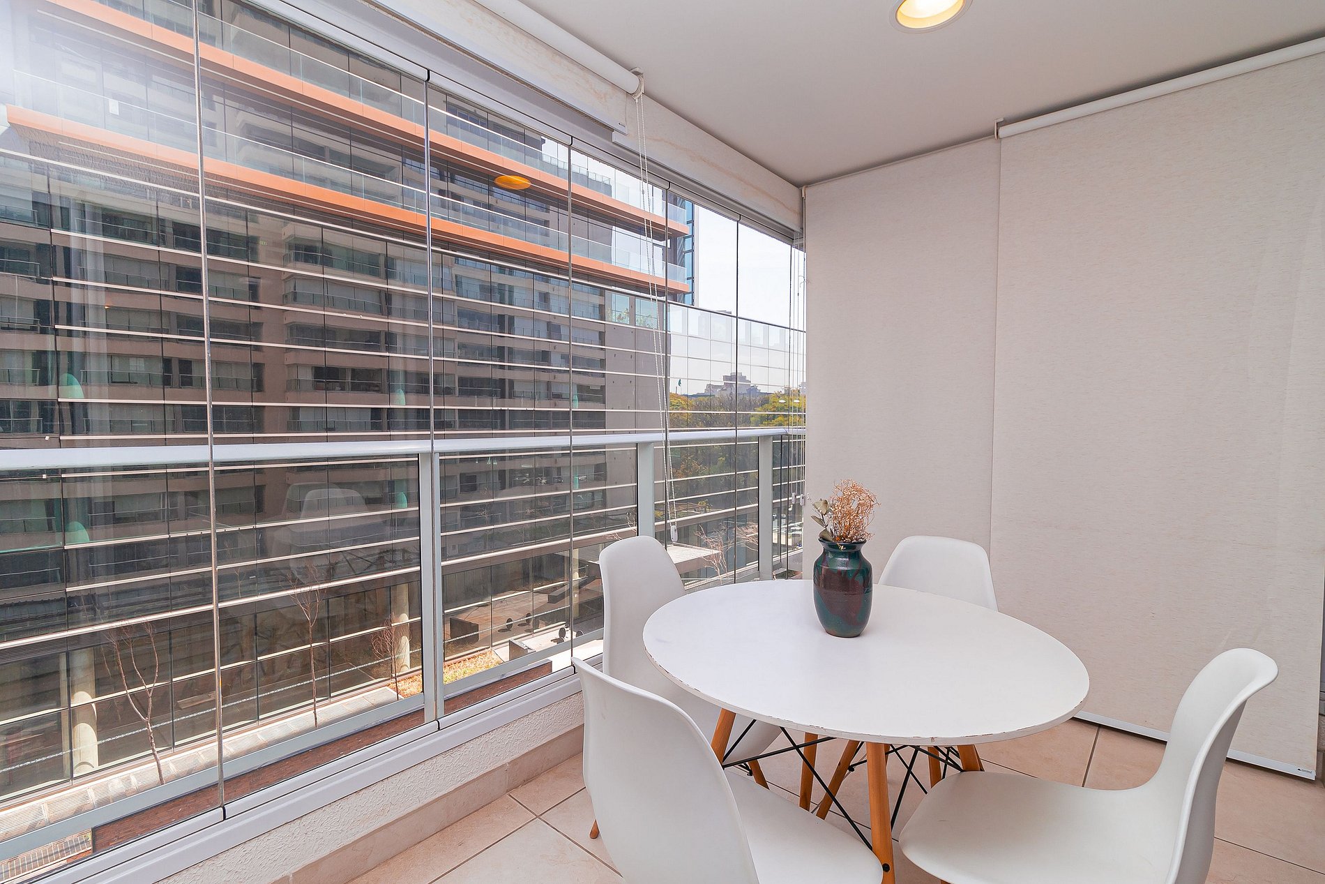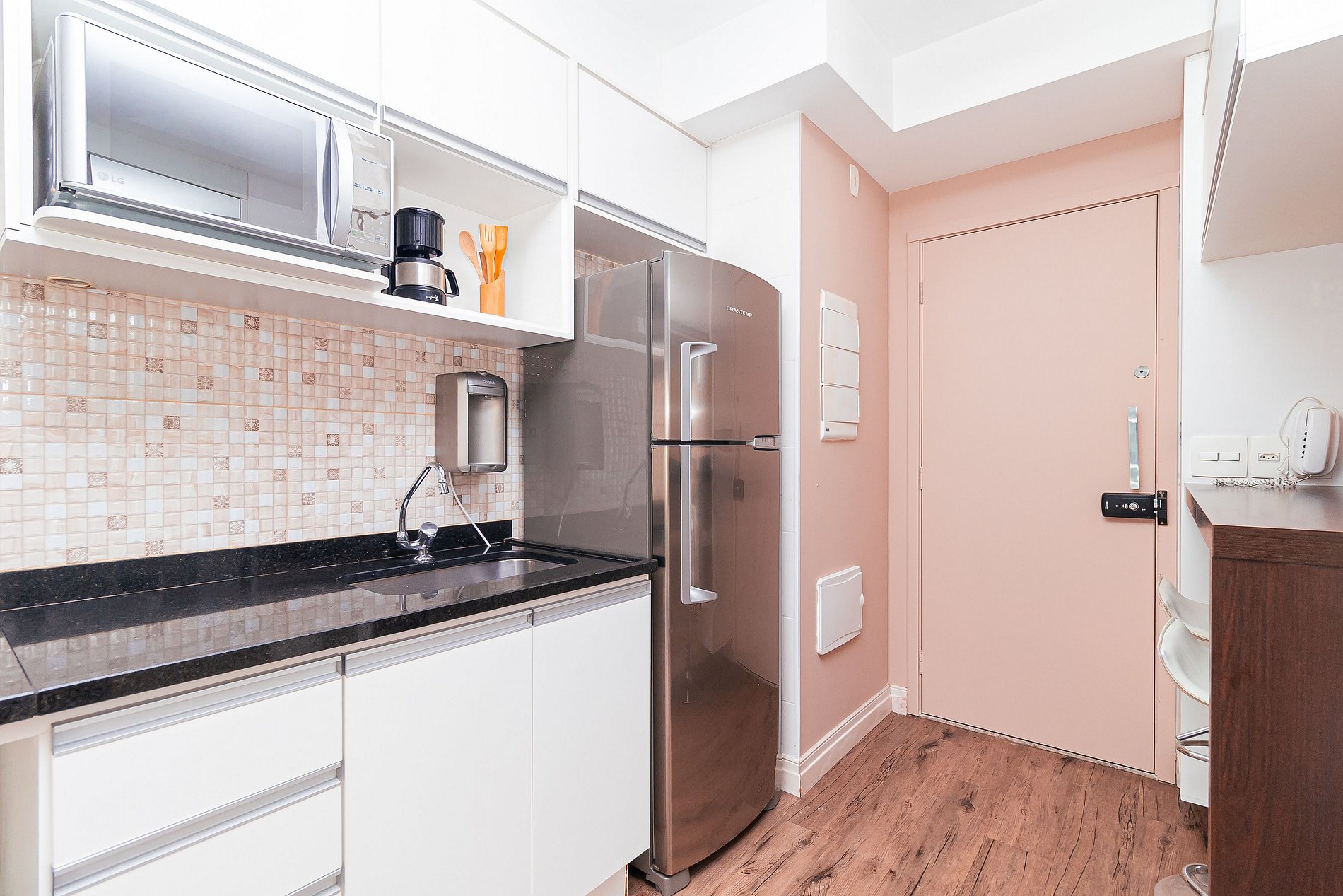 Modernity, comfort, sophistication and convenience? This 34m2 space has all this and a little more. The integrated studio has a bedroom, bathroom, full kitchen and a large and cozy balcony, with several special touches that make a total difference to the environment. Composed of slatted textures and woody and neutral tones, this apartment is pure charm.