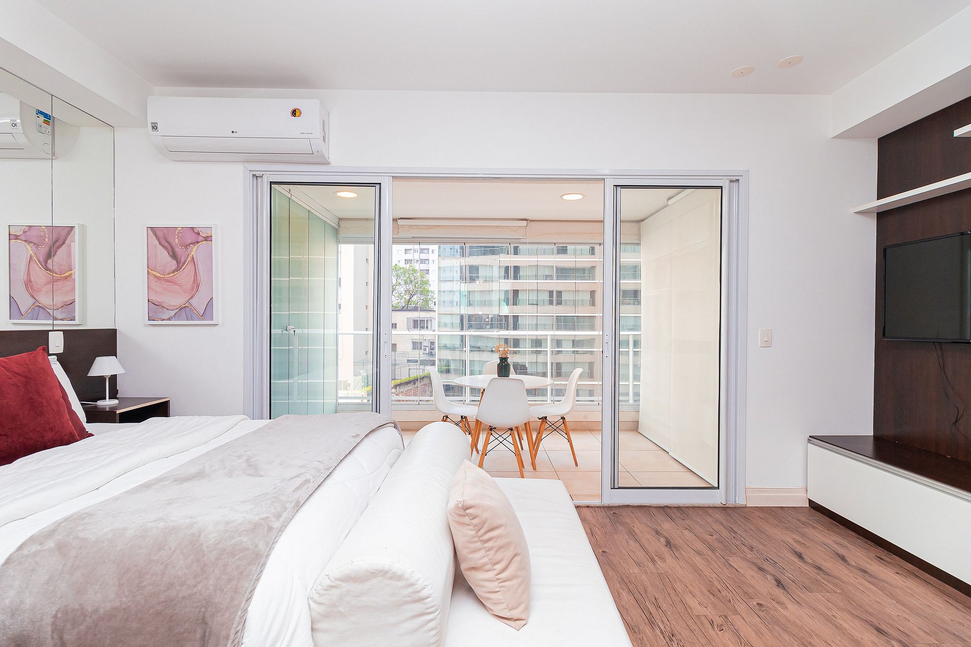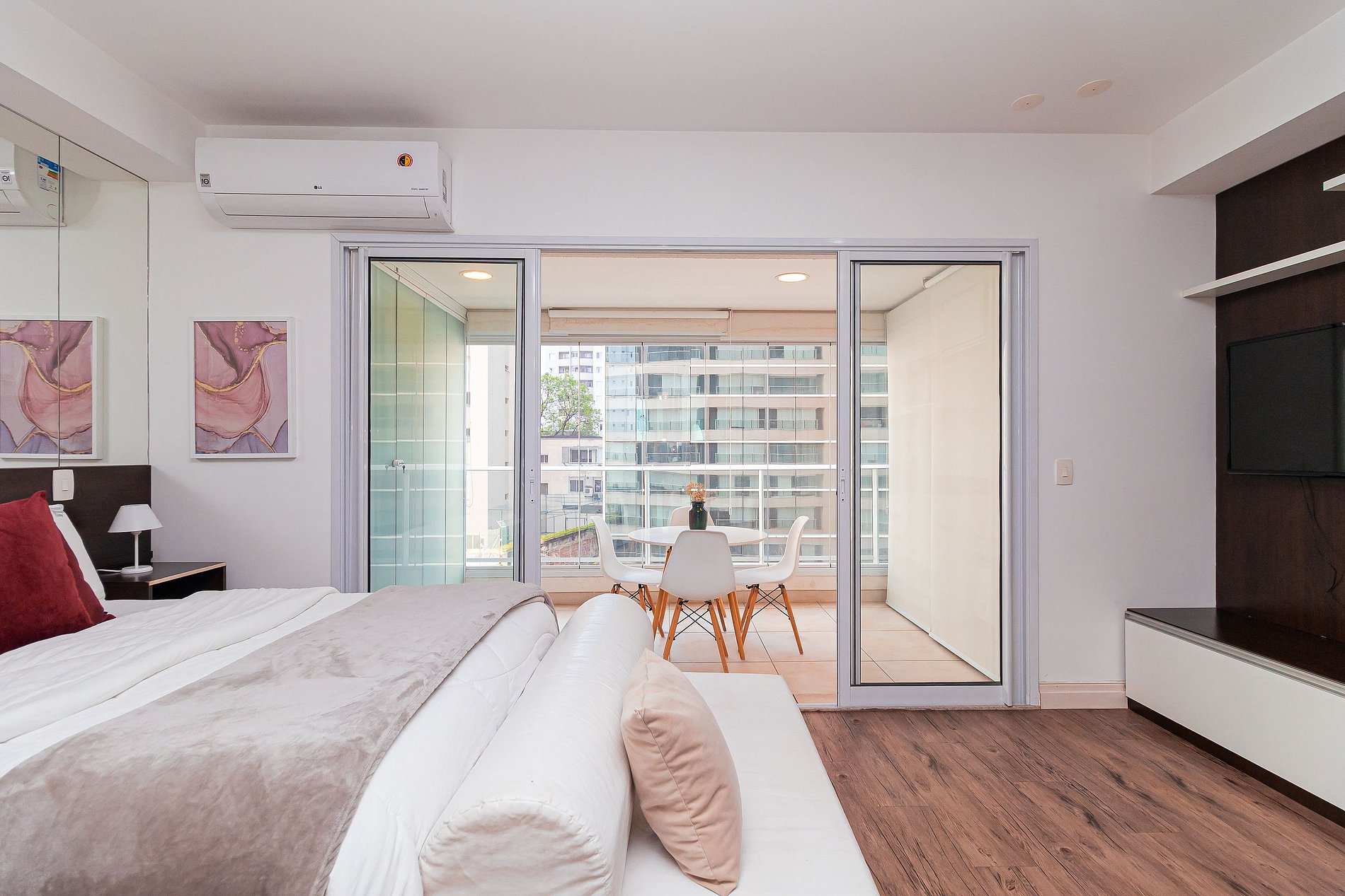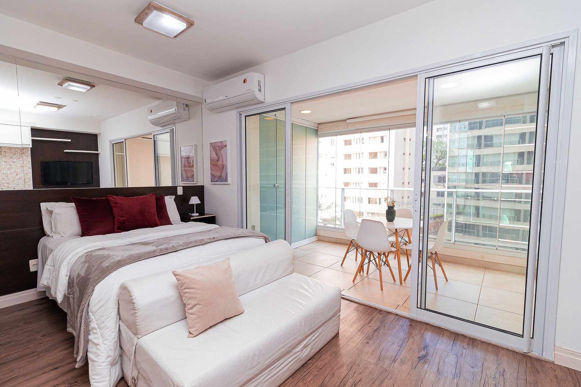 It has a full kitchen, a bright balcony with dining area, and a space with TV, bed, sofa and AIR CONDITIONING.