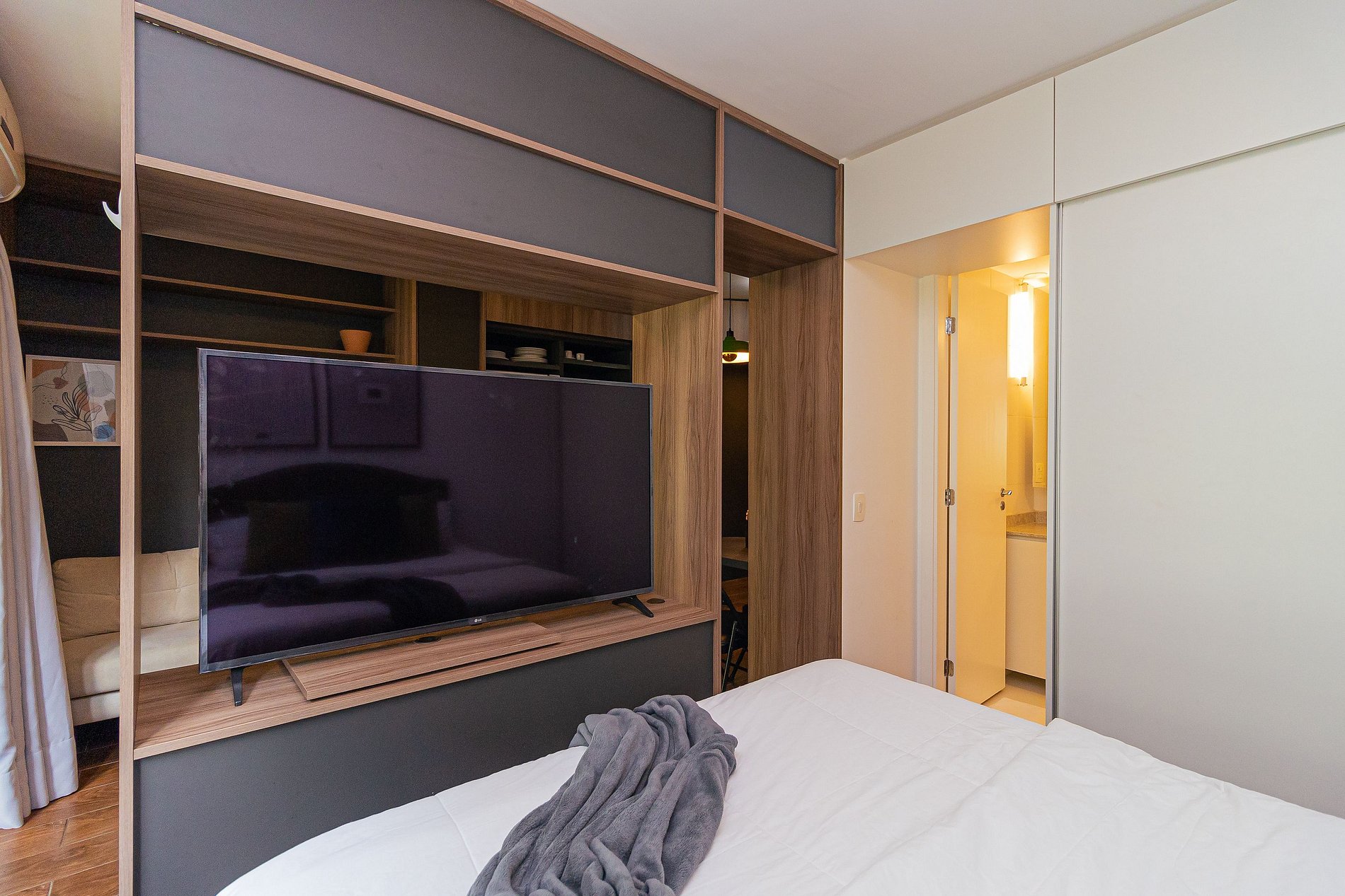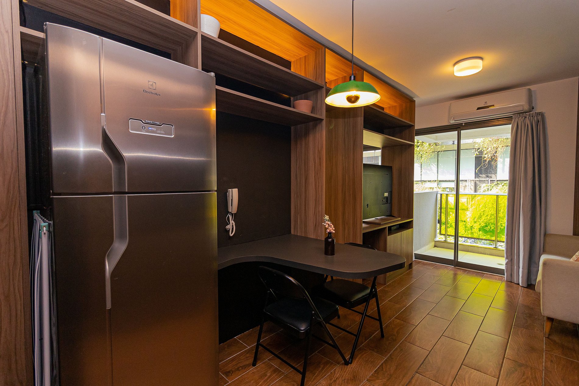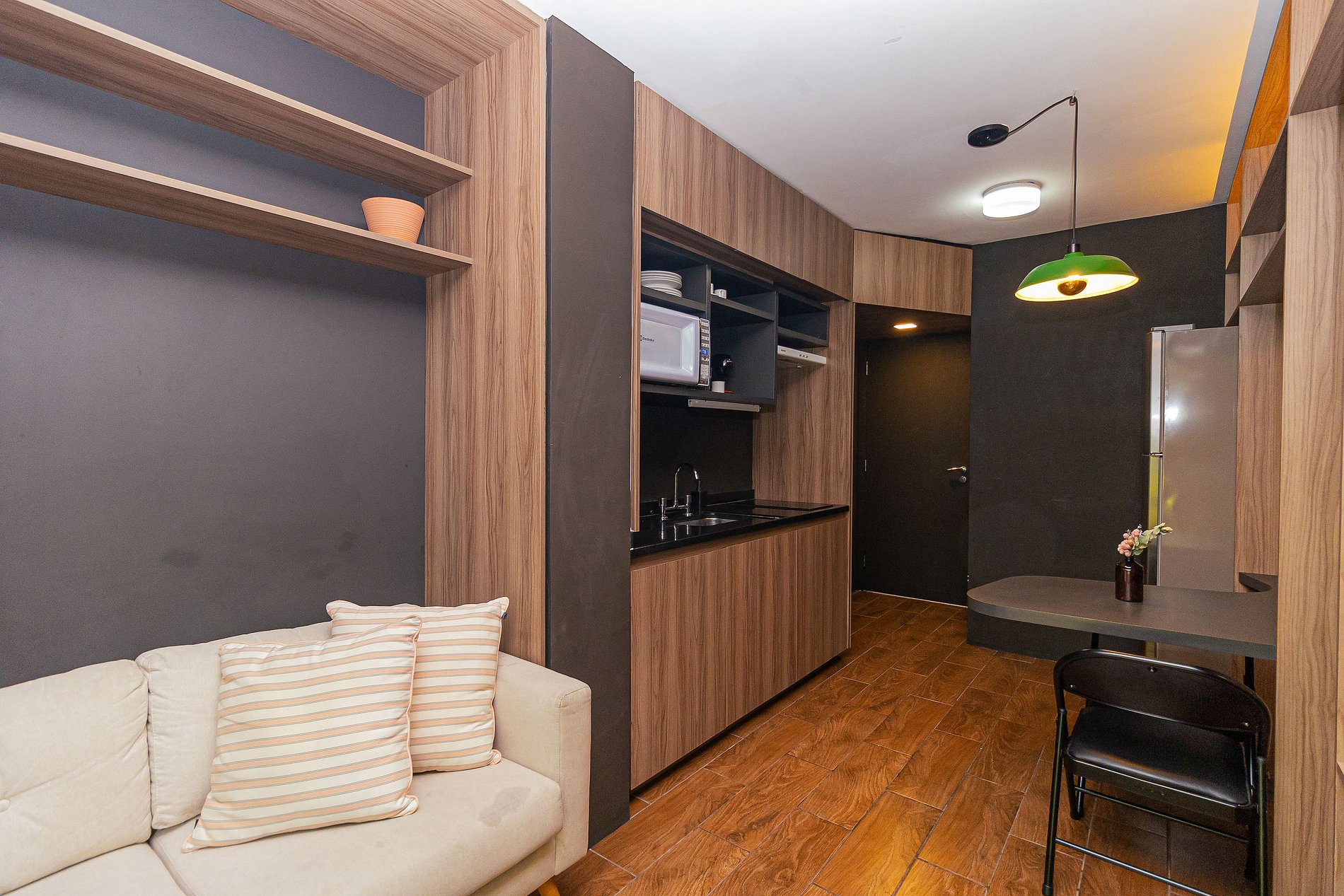 The environment follows a concept inspired by the Vila's nights, with an environment designed in colder and darker tones, also featuring warm lighting that contrasts with the colors used for the setting, which makes the apartment completely charming.
