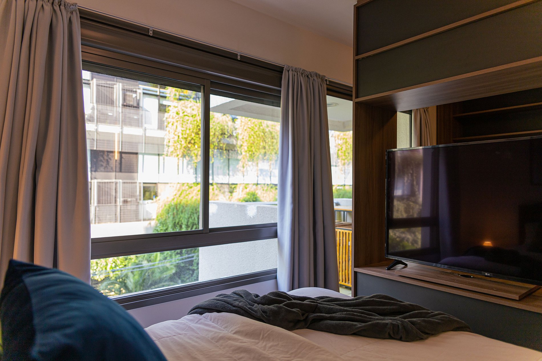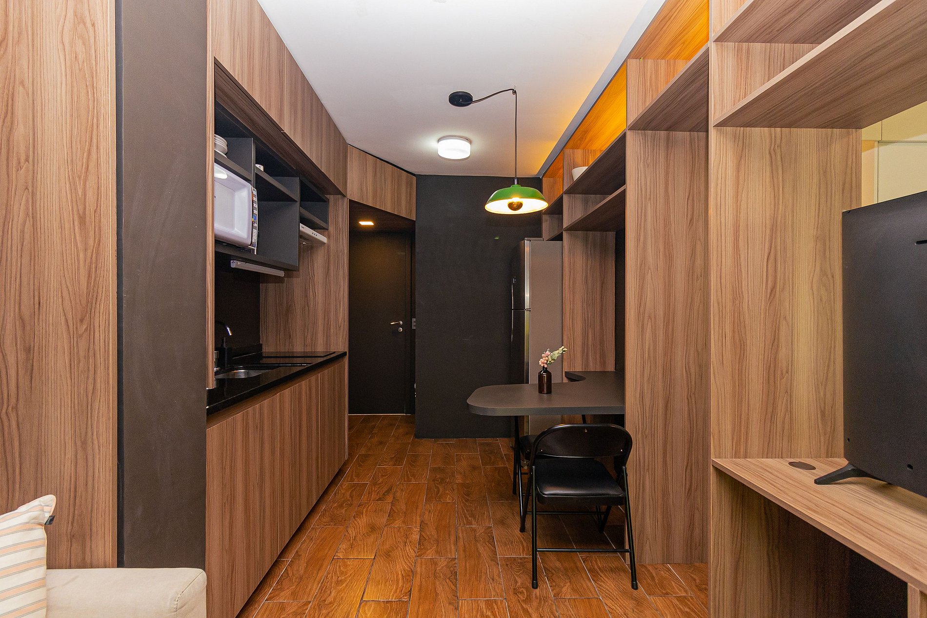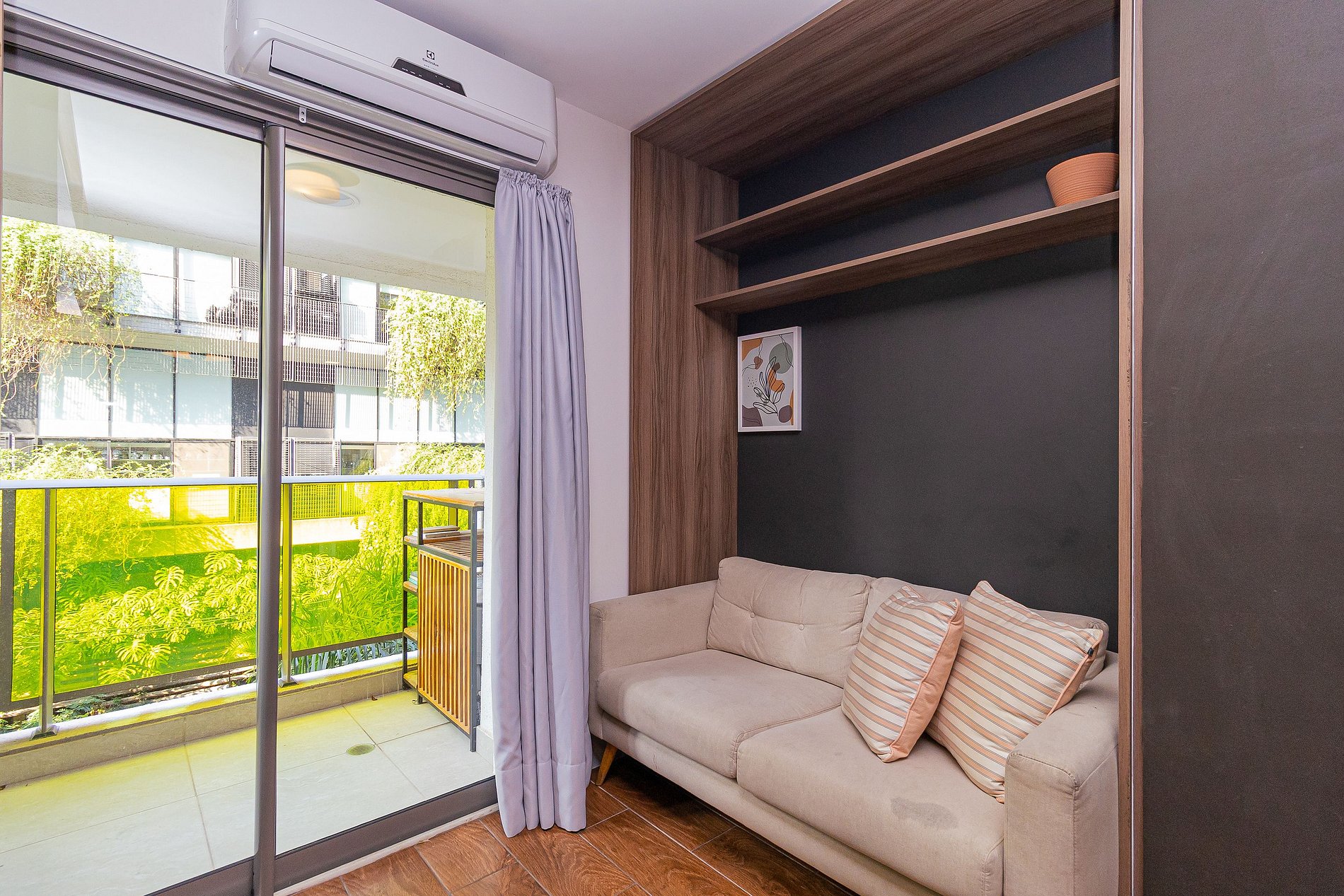 The environment follows a concept inspired by the Vila's nights, with an environment designed in colder and darker tones, also featuring warm lighting that contrasts with the colors used for the setting, which makes the apartment completely charming.