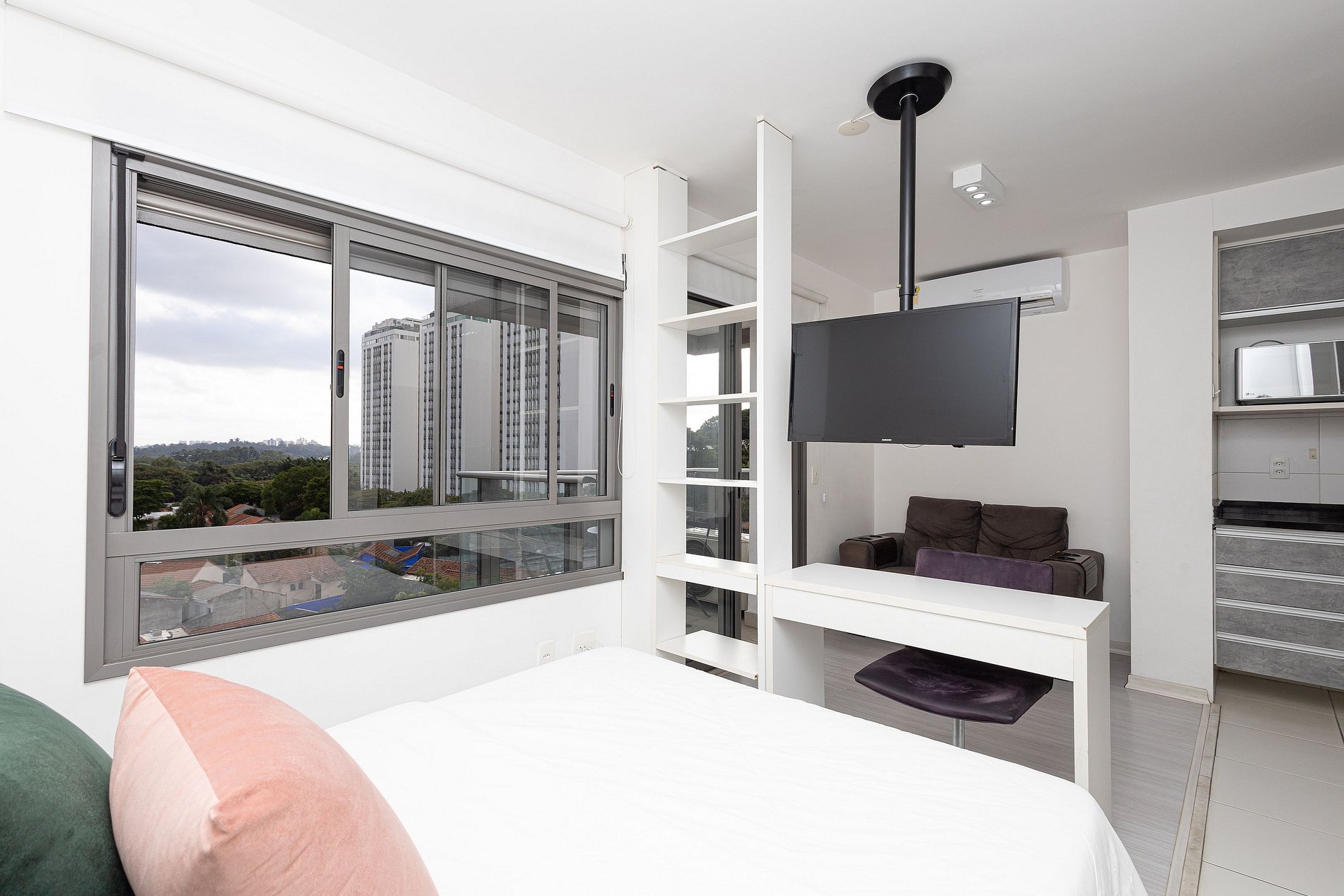 This studio was designed with a modern industrial concept, even with its urban style, the environment is welcoming and optimized for your maximum comfort. The soft lighting and carefully chosen decor create a relaxing atmosphere, perfect for unwinding after a busy day.