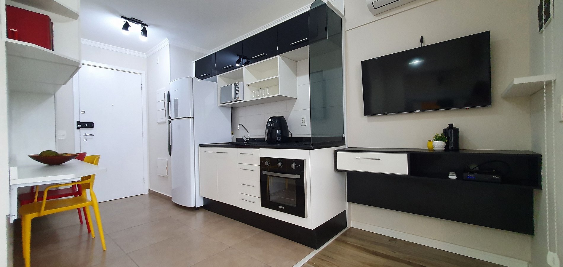 An incredible view, cozy decor and a balcony with a good space for dining. Open and well-equipped kitchen, comfortable bed, good furniture, air conditioning and 200mbps Wifi.