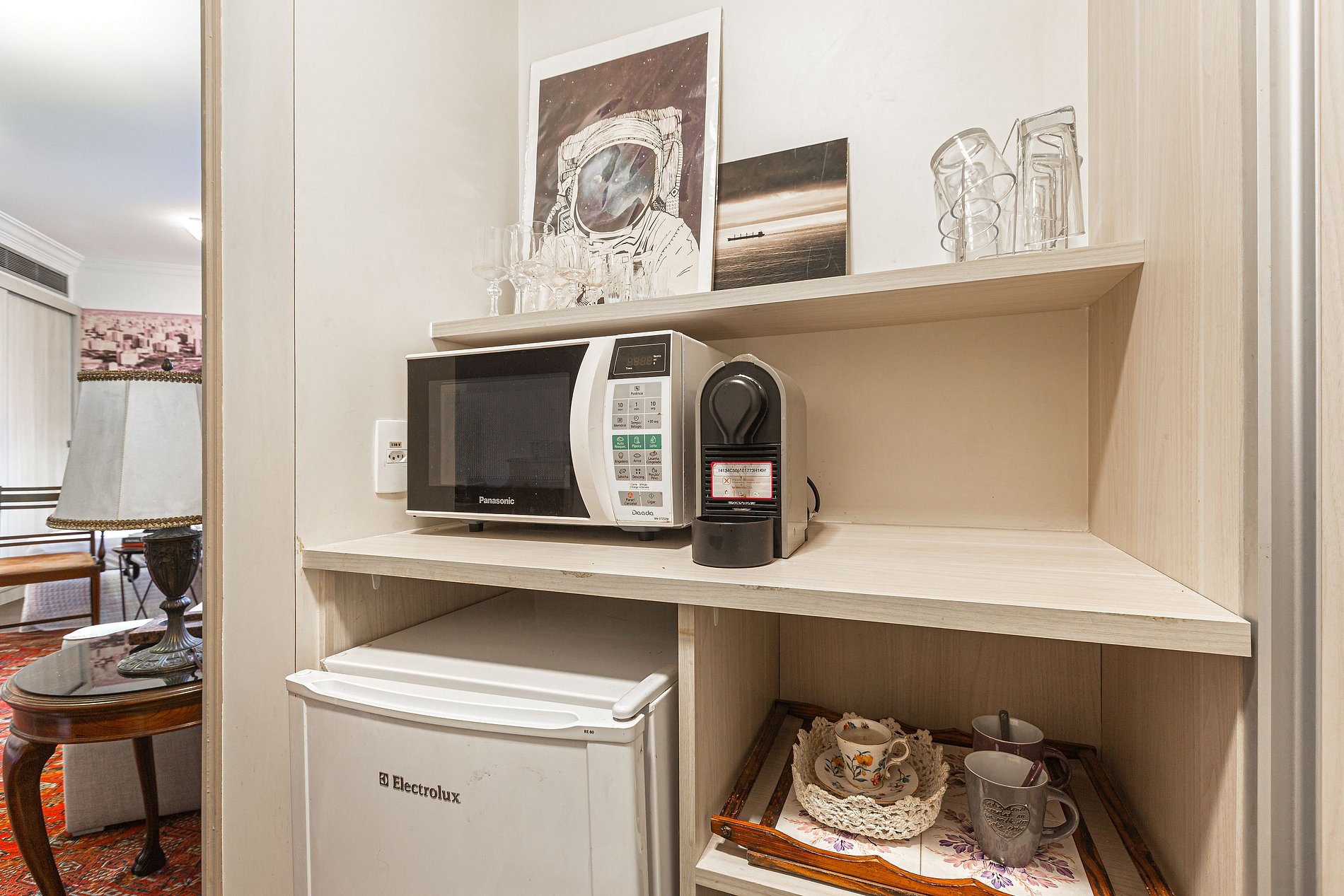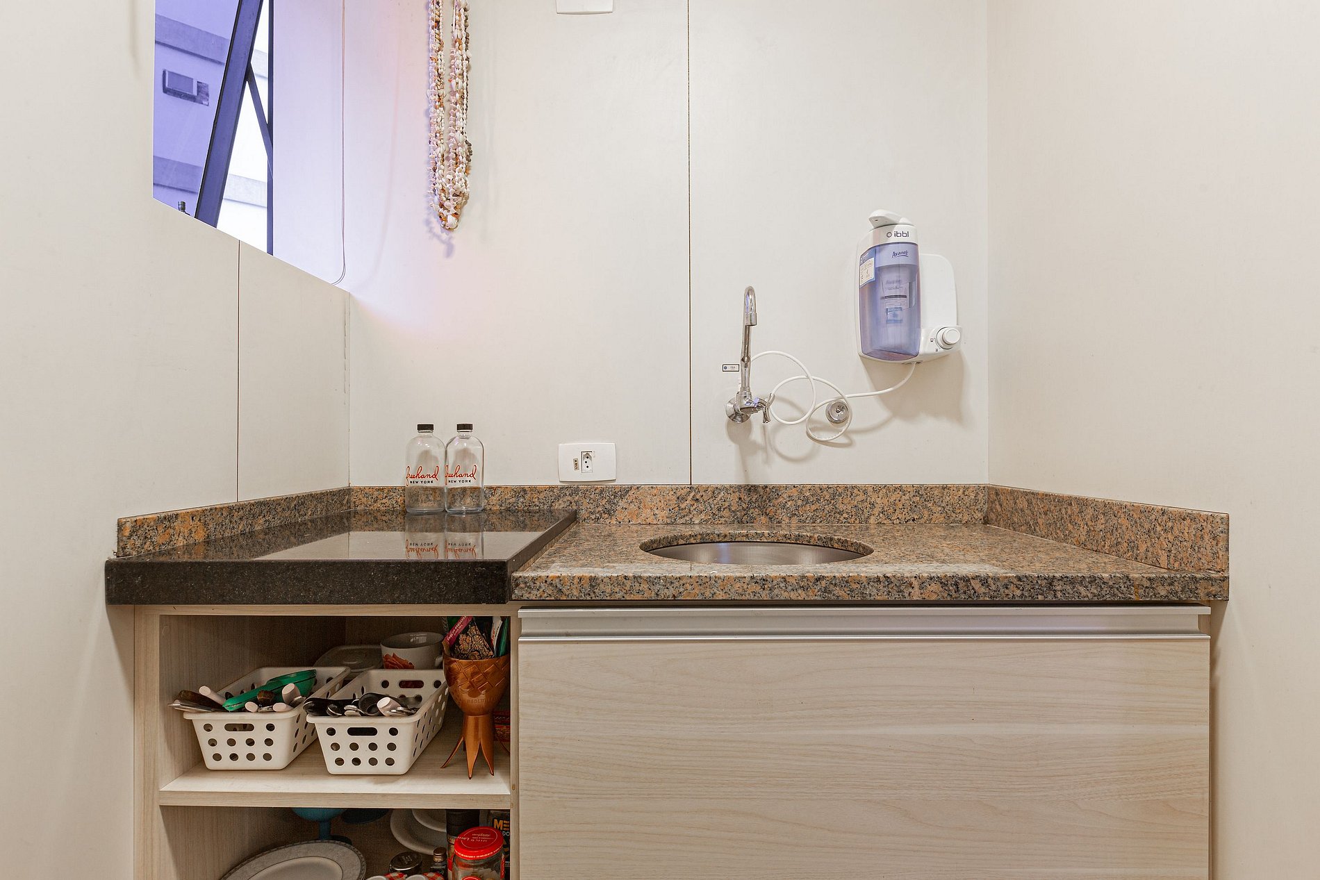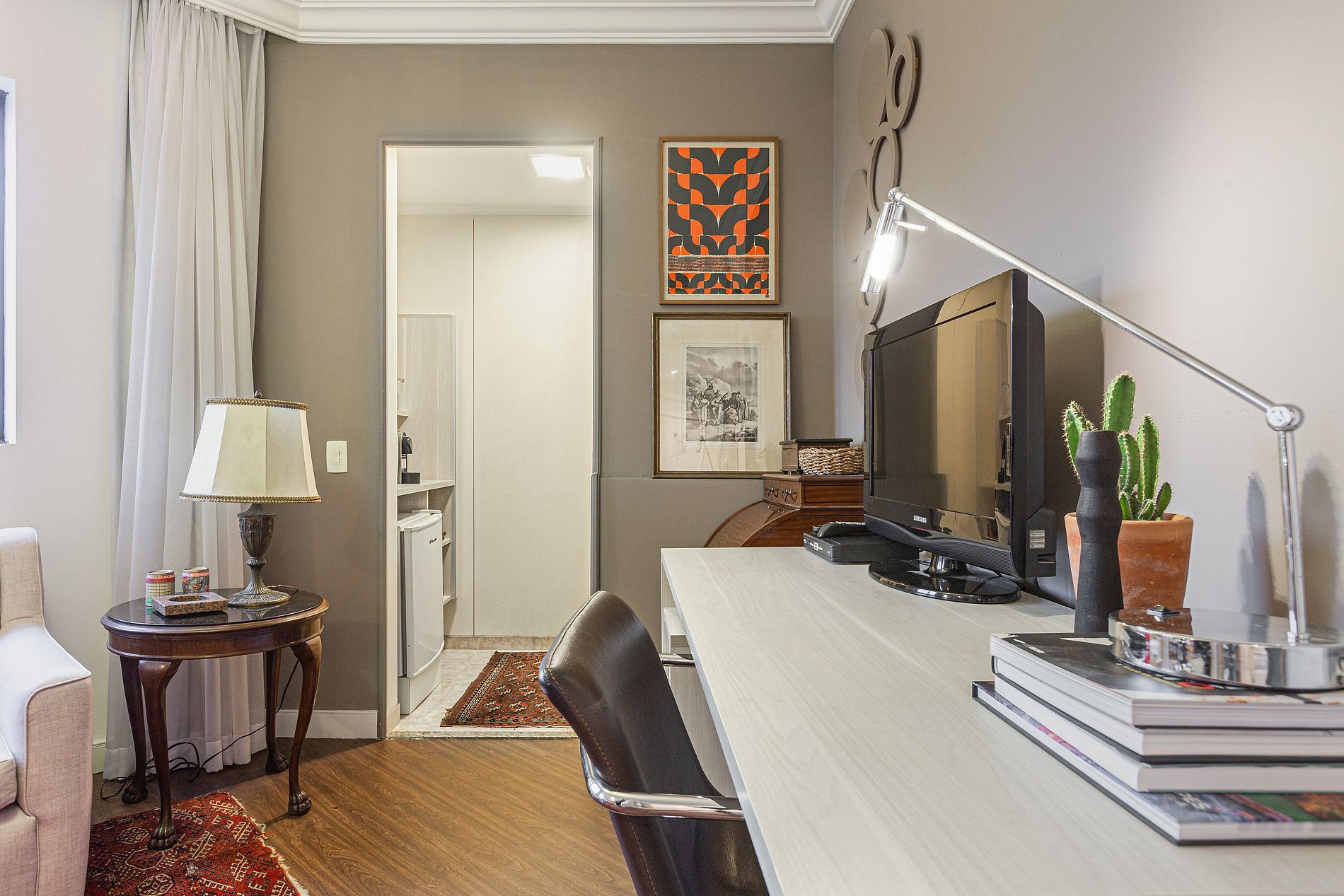 Flat decorated in retro style on Rua da Consolação in the heart of Jardins. With a functional and cozy design, the apartment is ready for seasonal rent, with loose furniture and built-in joinery items in an optimized way.