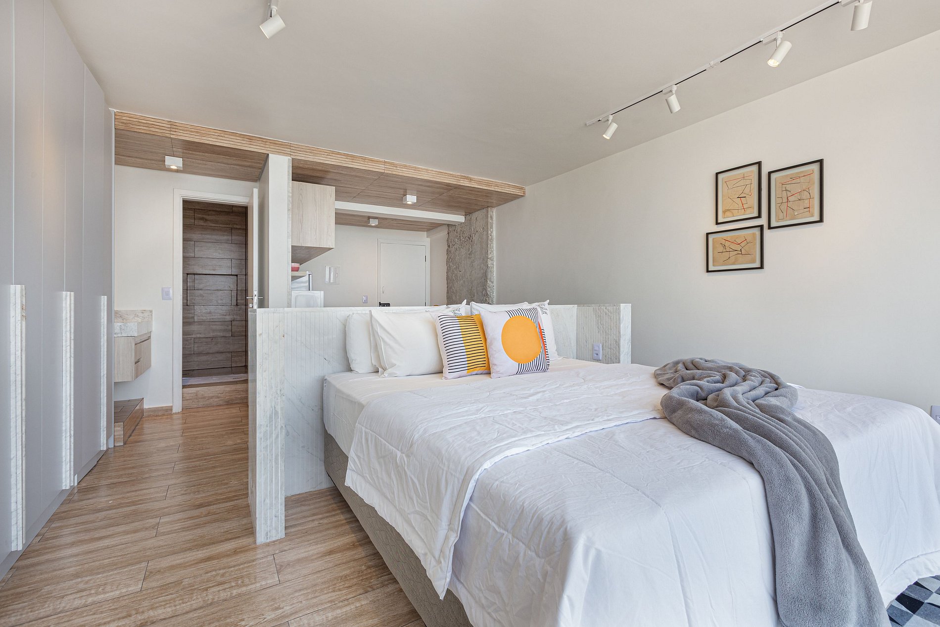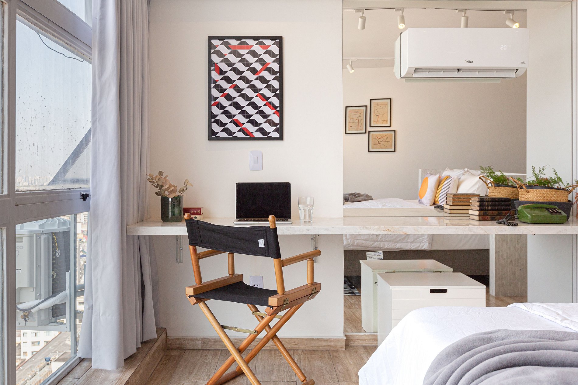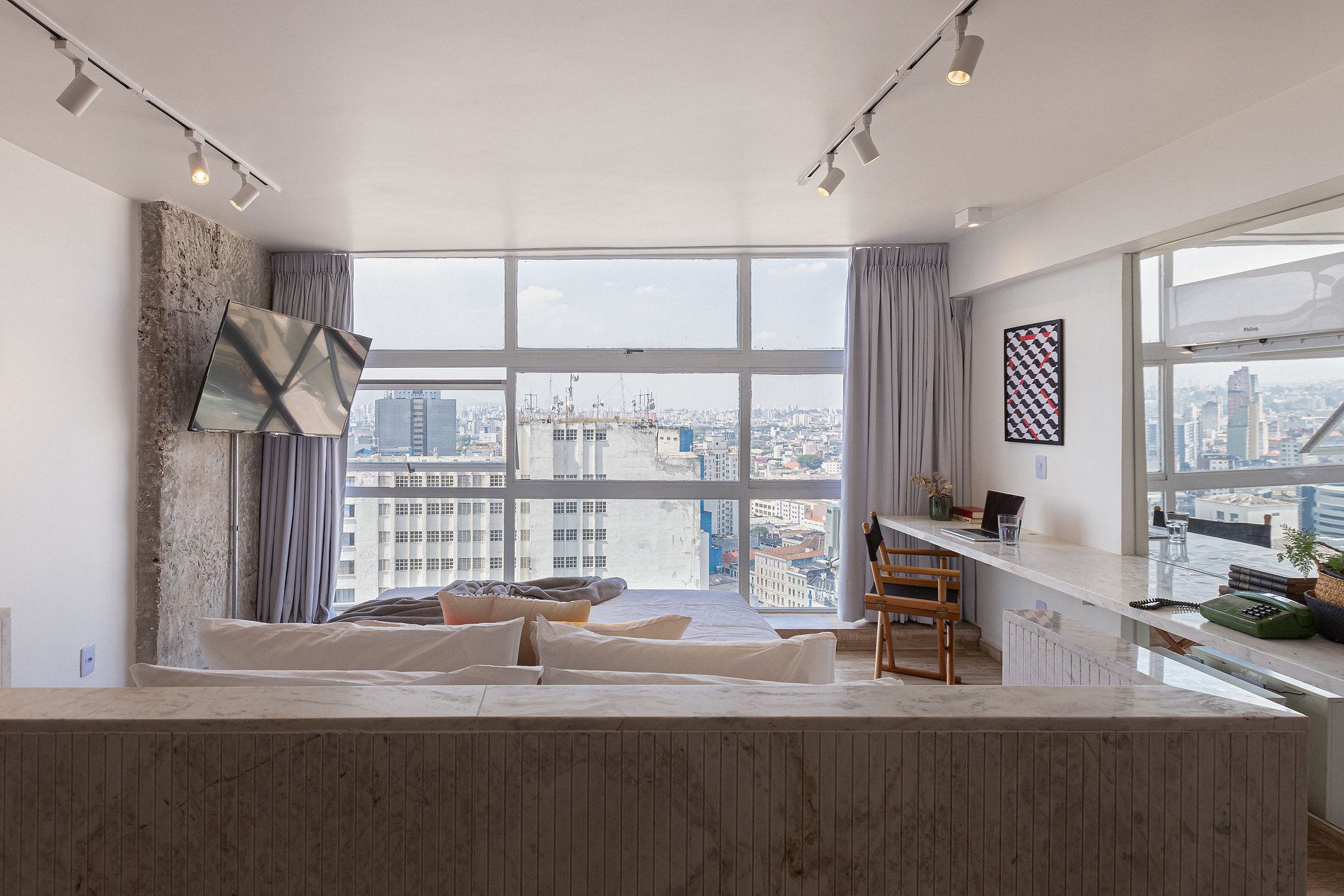 With a stunning view from the iconic window on the 32nd floor of one of the tallest buildings in the city, this studio at Mirante do Vale overlooks the beautiful Santa Ifigênia Viaduct.
