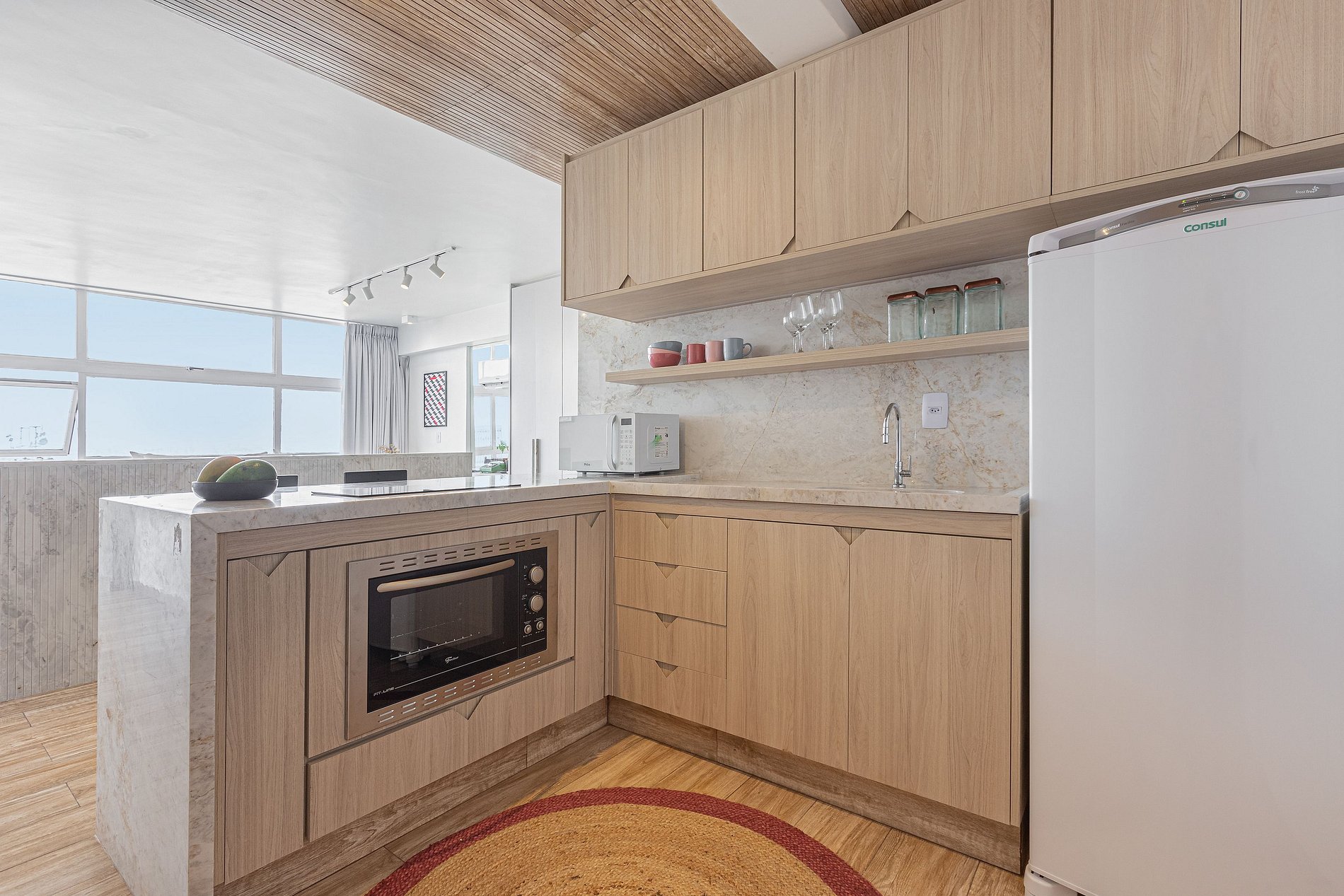The apartment was renovated under the vision of architect Renato Mendonça, who used high-quality materials and harmoniously integrated the spaces to create a functional layout full of personality and style.