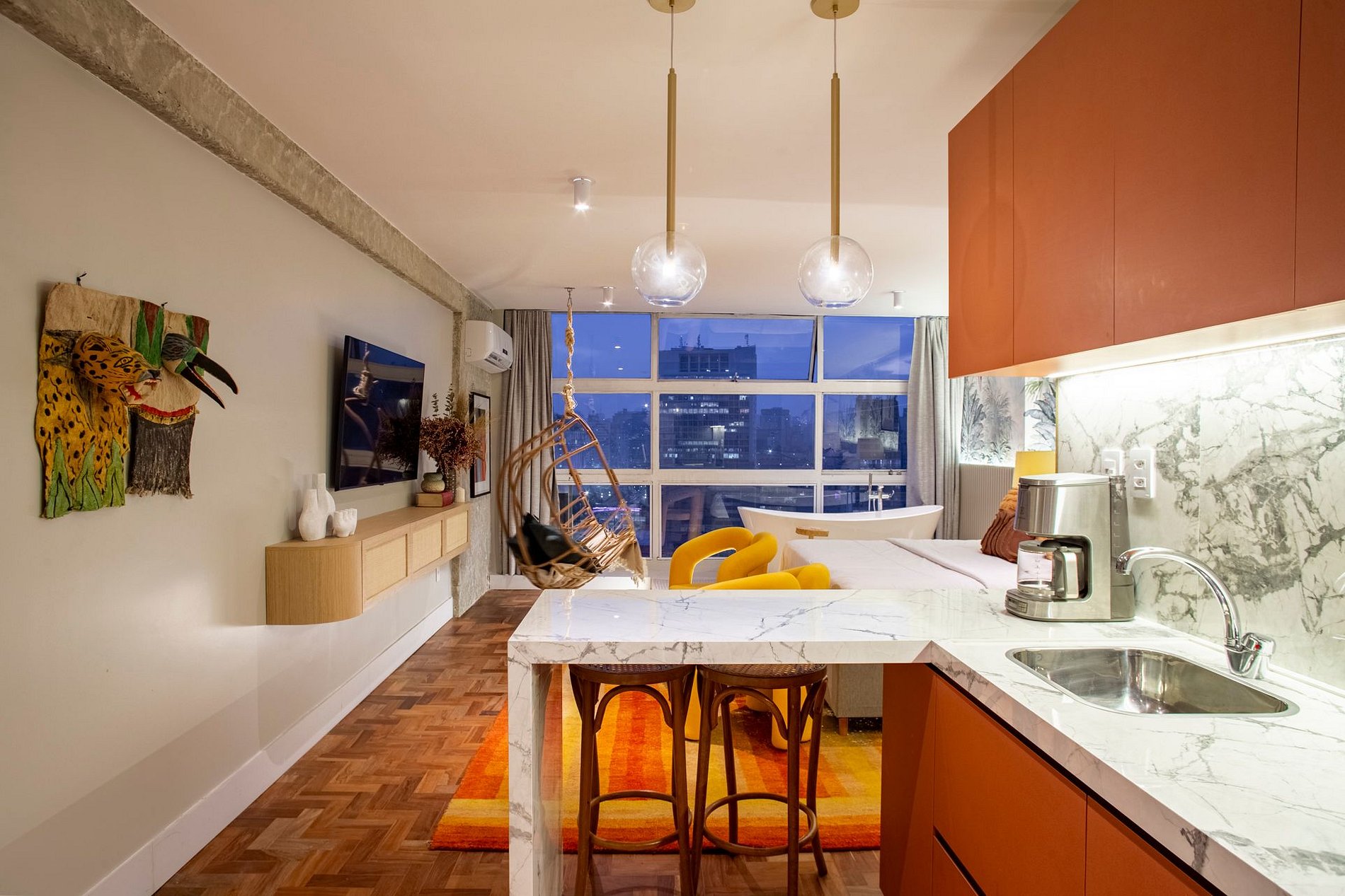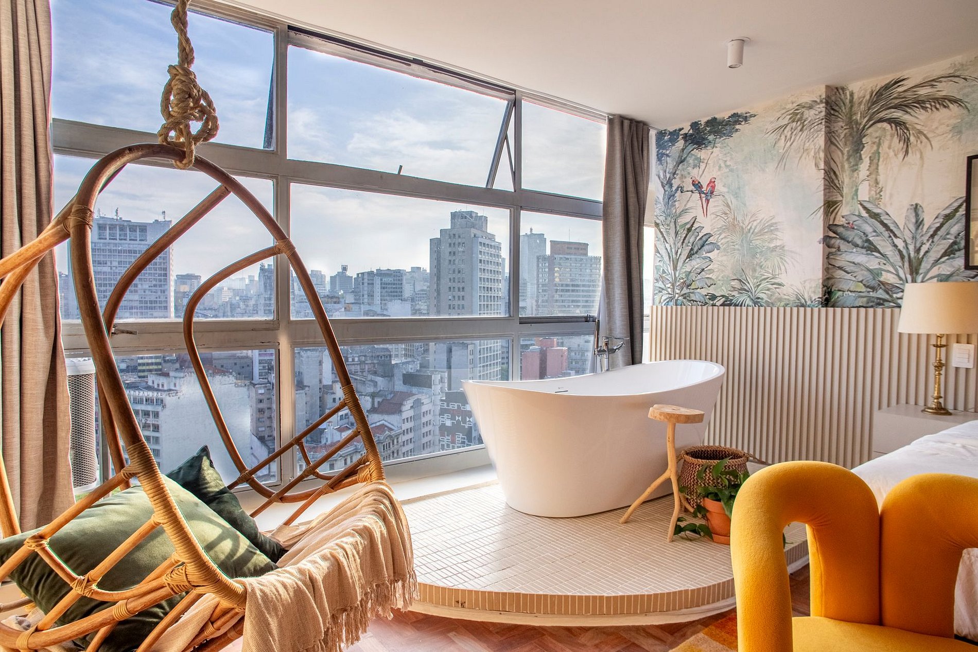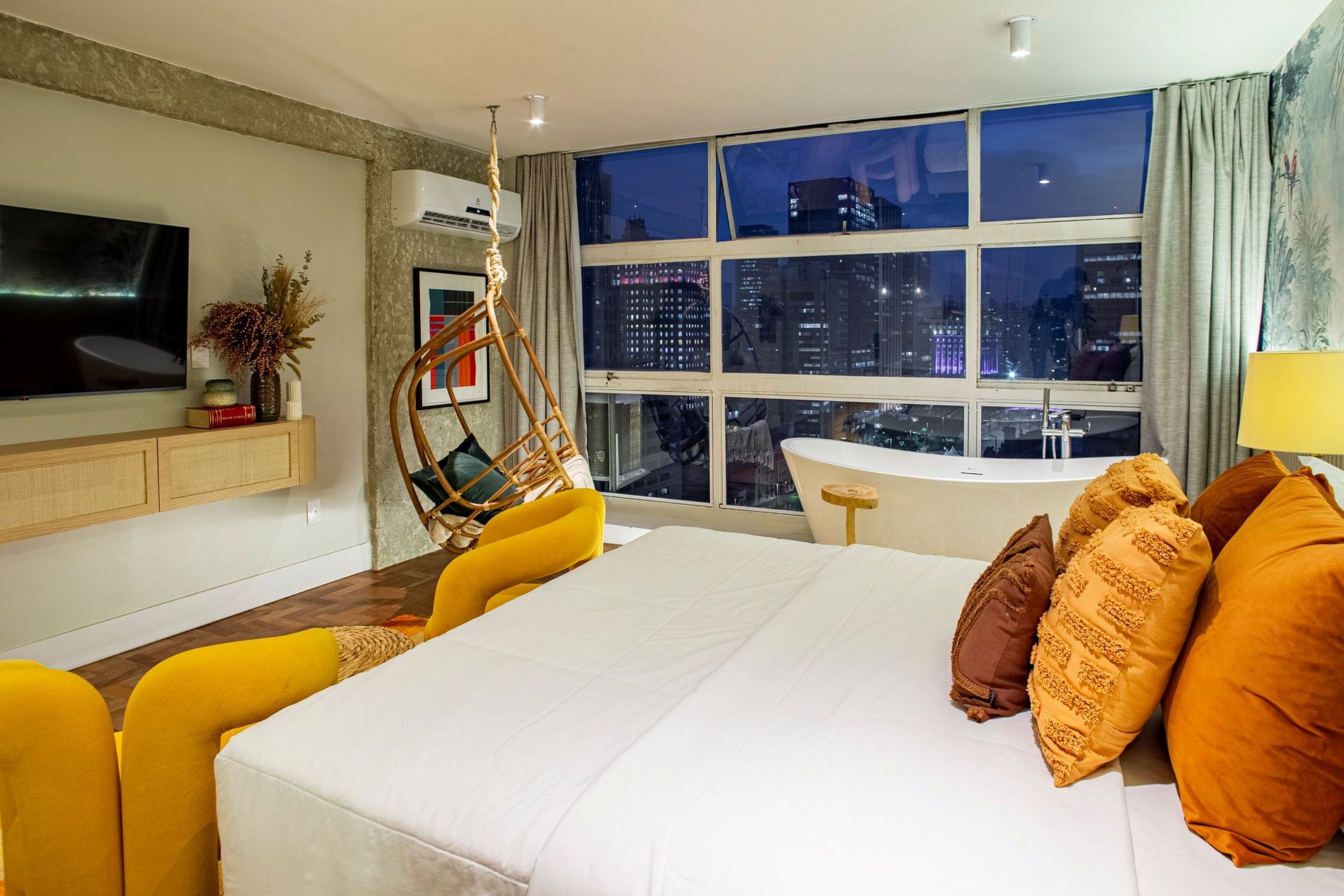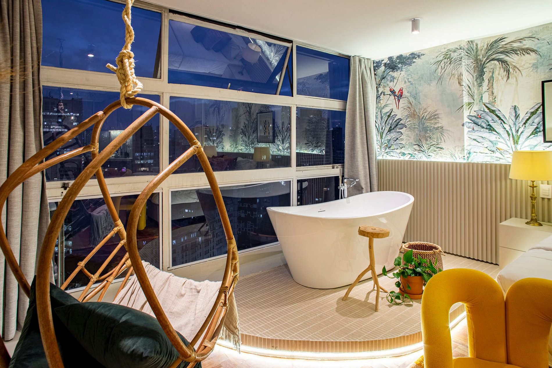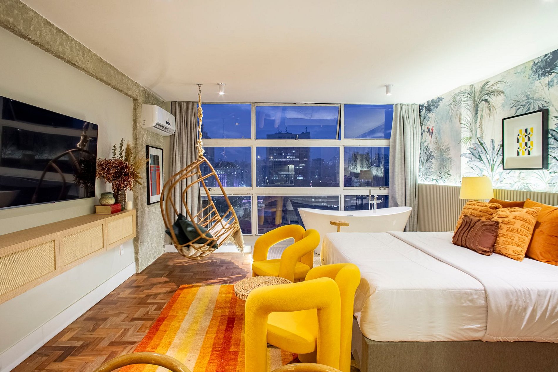 With an incredible location and unique design choices such as a beautiful rattan swing and a bathtub strategically facing the city view, the studio is in front of the new and recently revitalized Vale do Anhangabaú, where it is easy to explore the historic center and the surroundings, from one of the most effervescent points in the heart of the city of São Paulo.