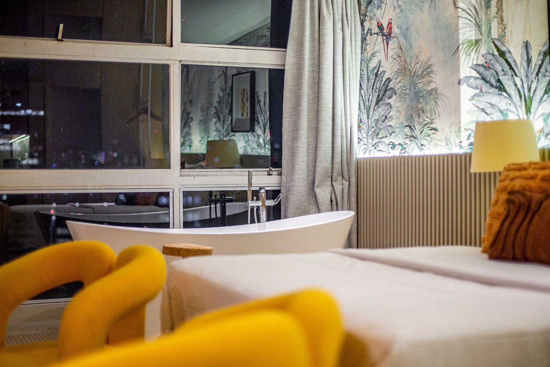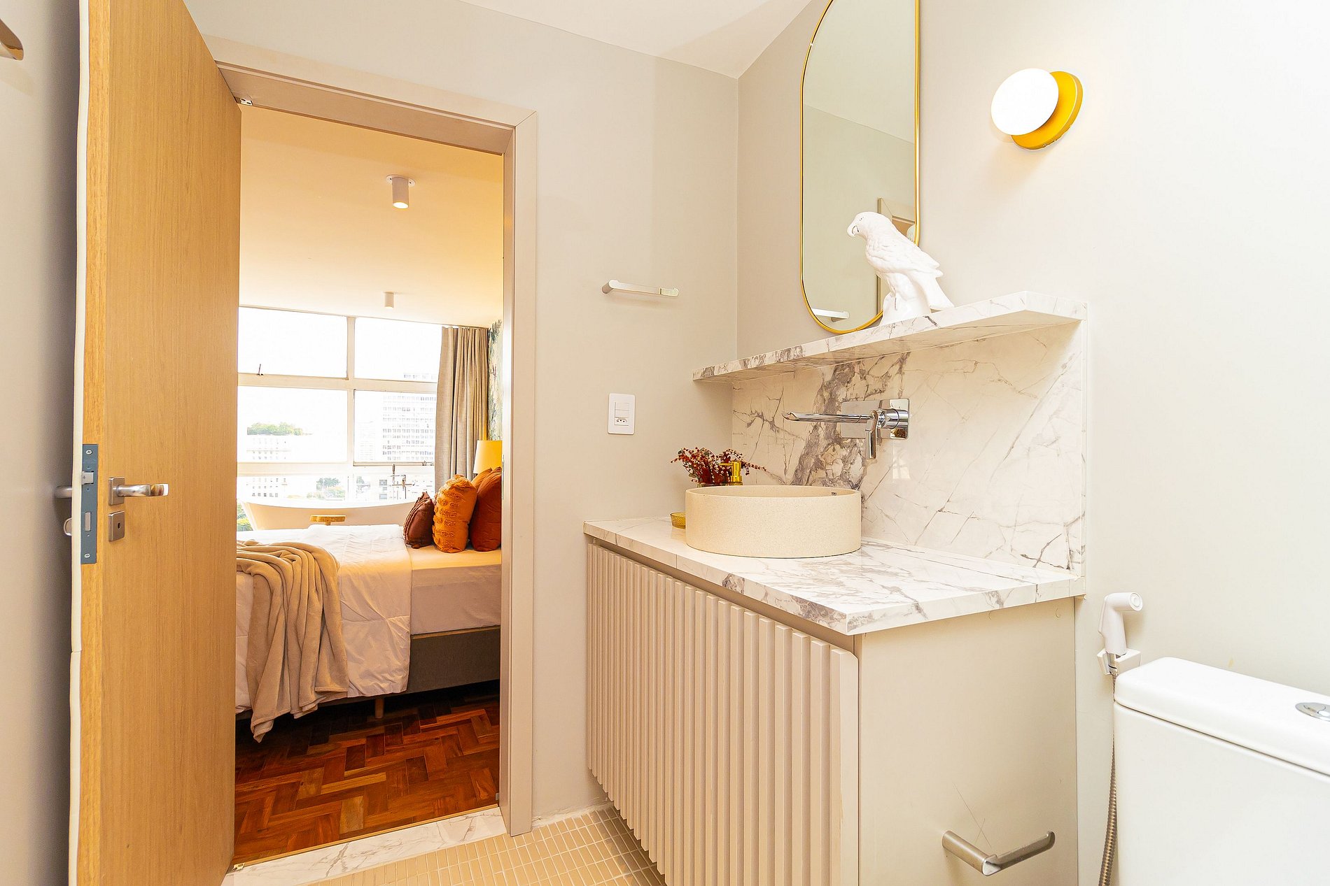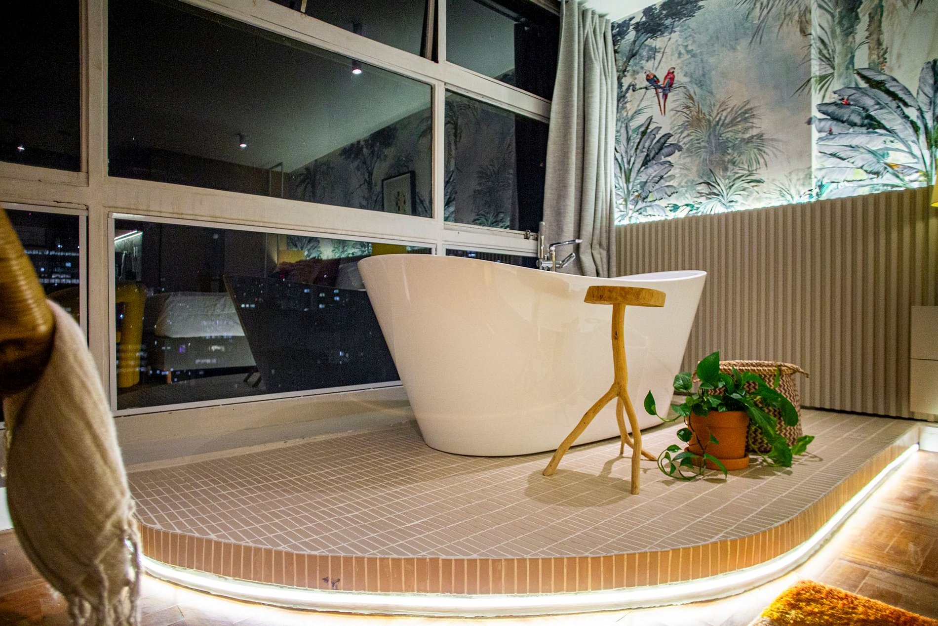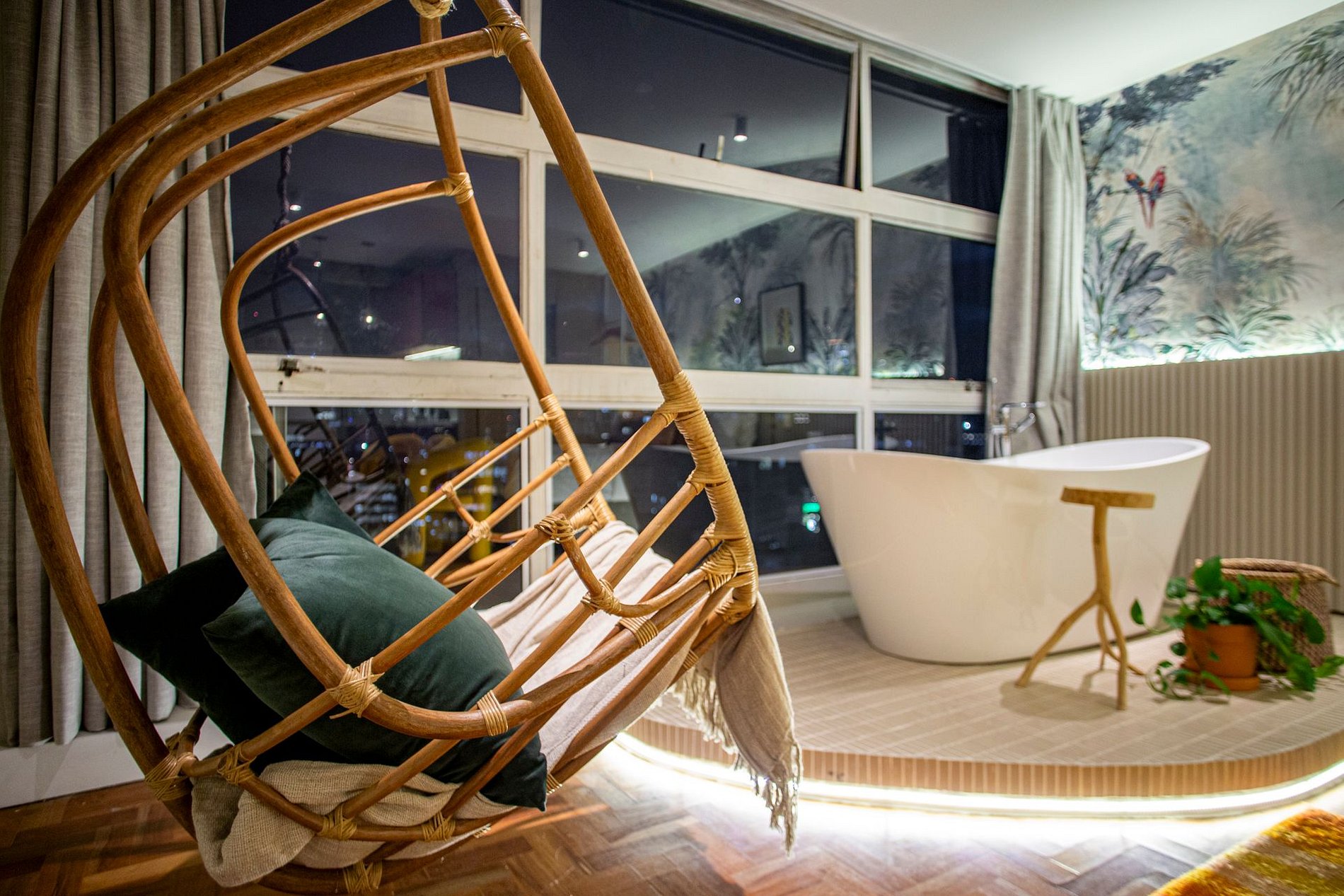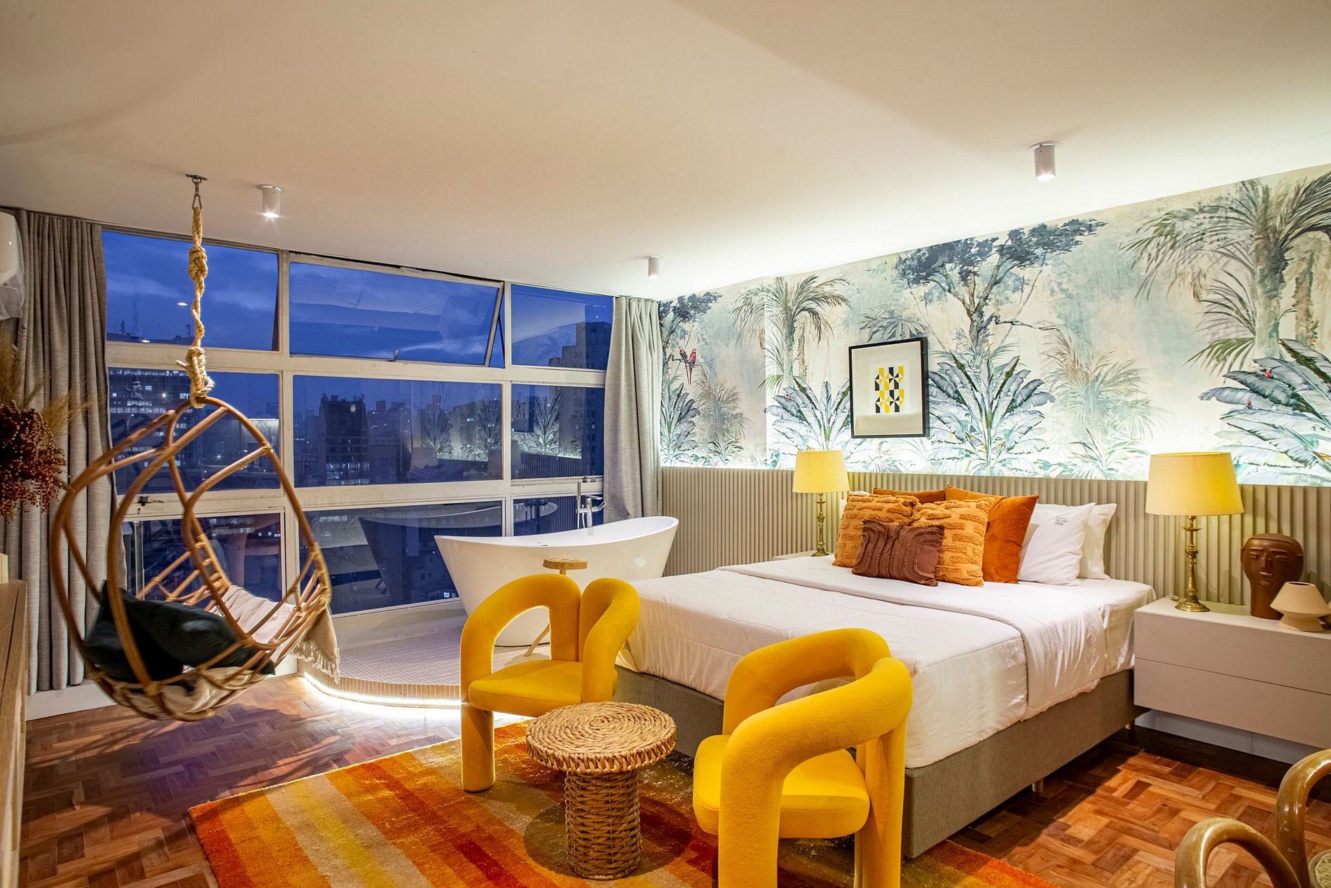 With an incredible location and unique design choices such as a beautiful rattan swing and a bathtub strategically facing the city view, the studio is in front of the new and recently revitalized Vale do Anhangabaú, where it is easy to explore the historic center and the surroundings, from one of the most effervescent points in the heart of the city of São Paulo.