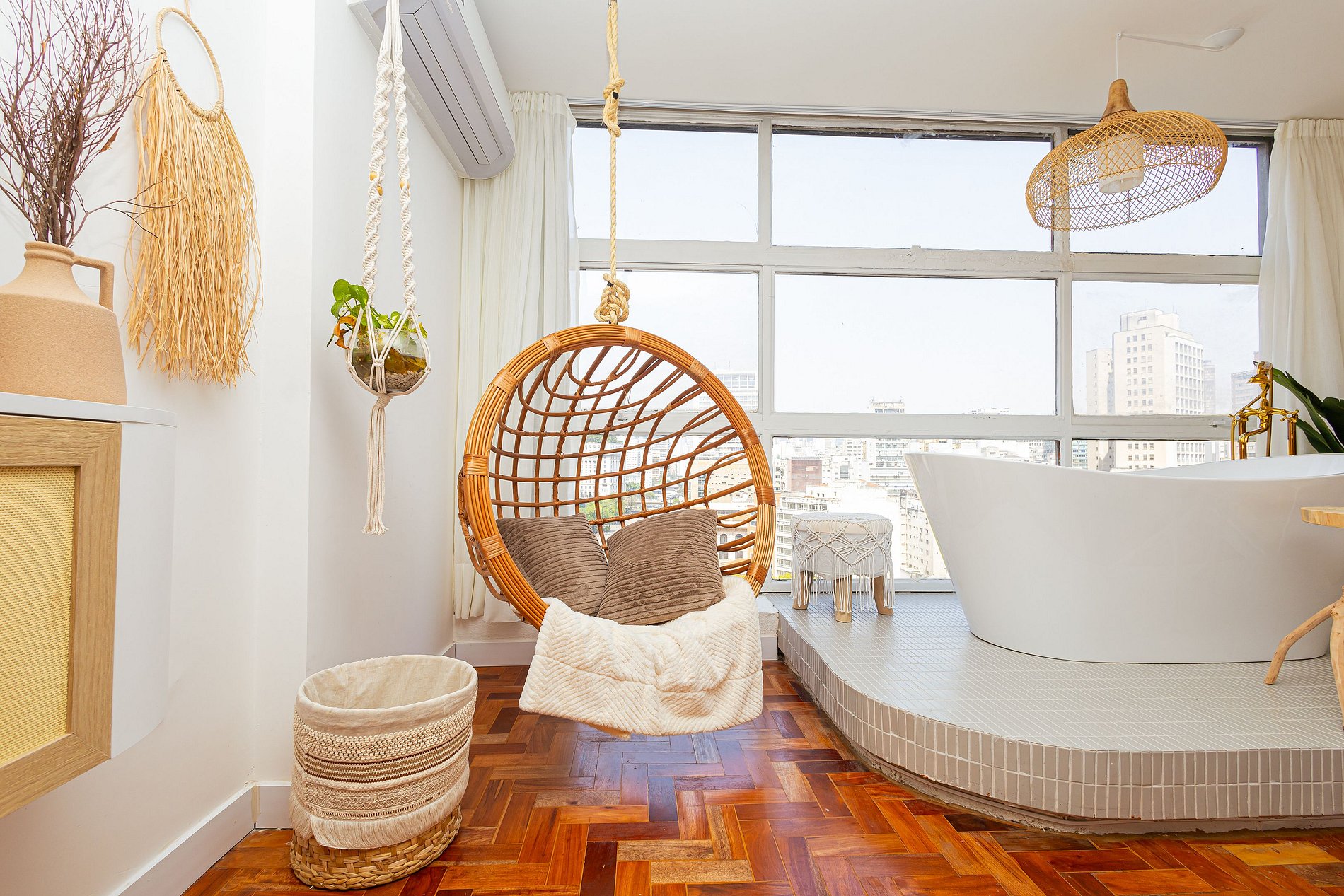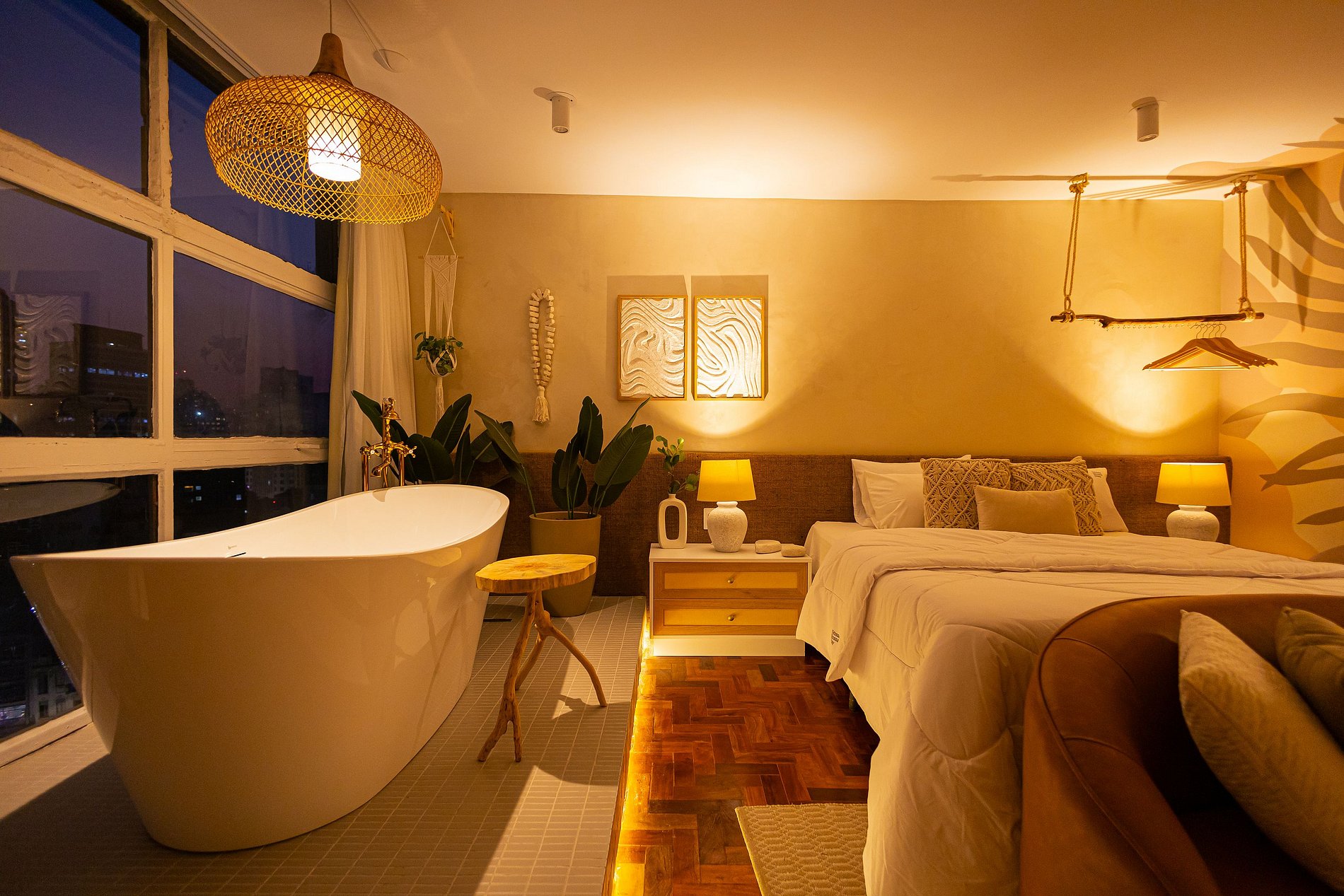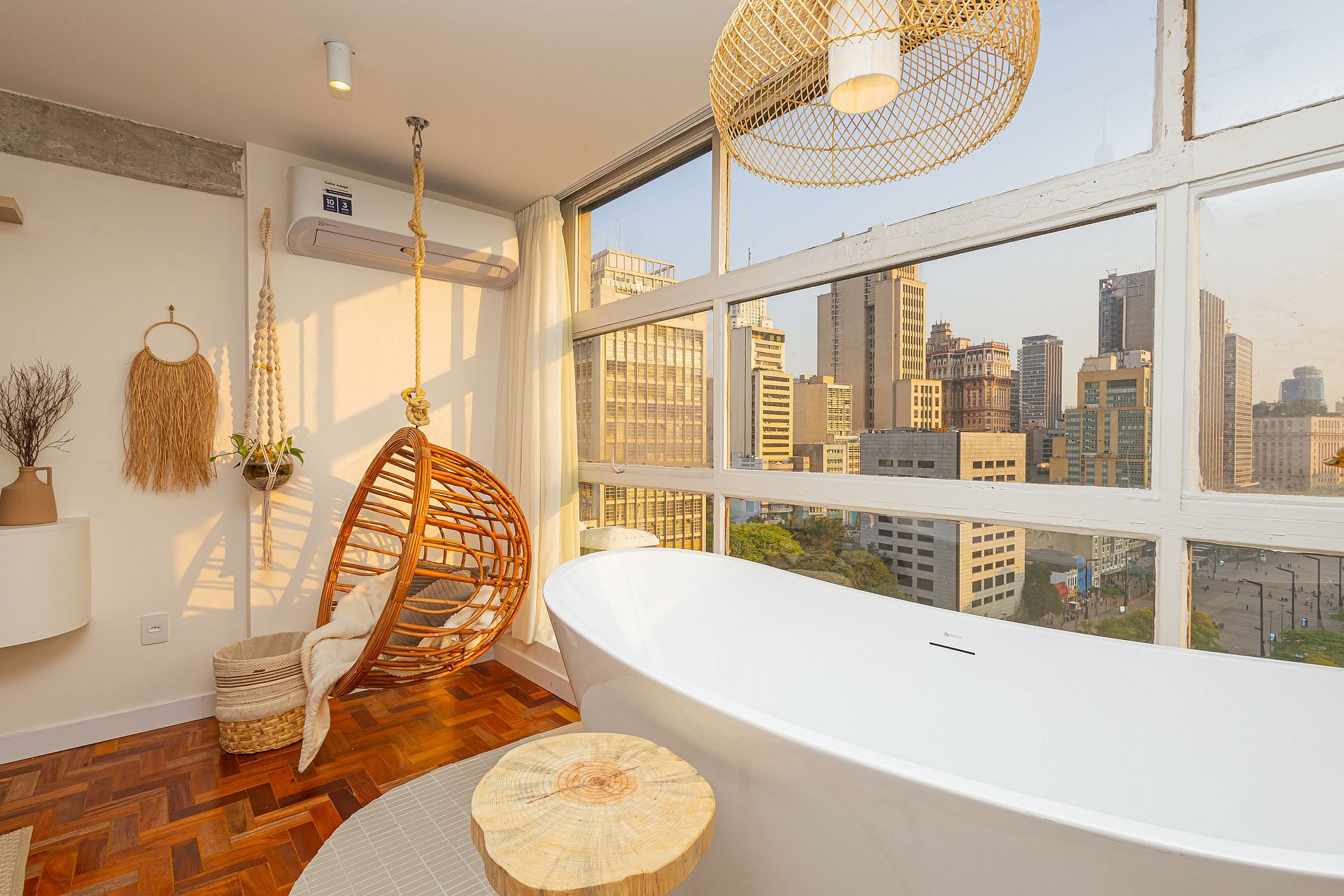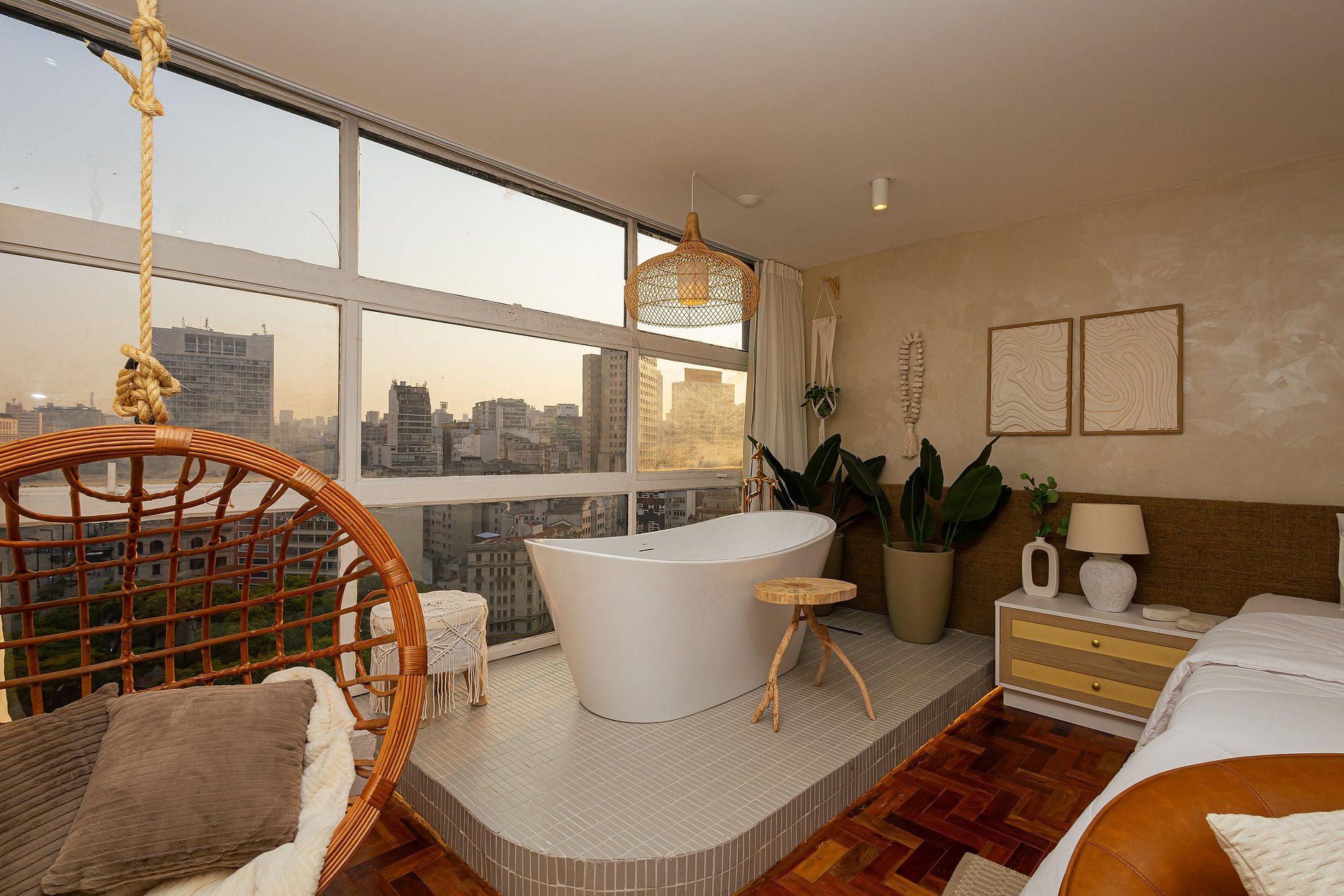 Experience the romance and magic of Ancestral SampaSky, a charming studio on the 19th floor of the historic Edifício Mirante do Vale. Imagine yourself relaxing in an organically designed bathtub, strategically positioned next to a huge window, where the spectacular view of the Santa Ifigênia Viaduct becomes part of your private setting.