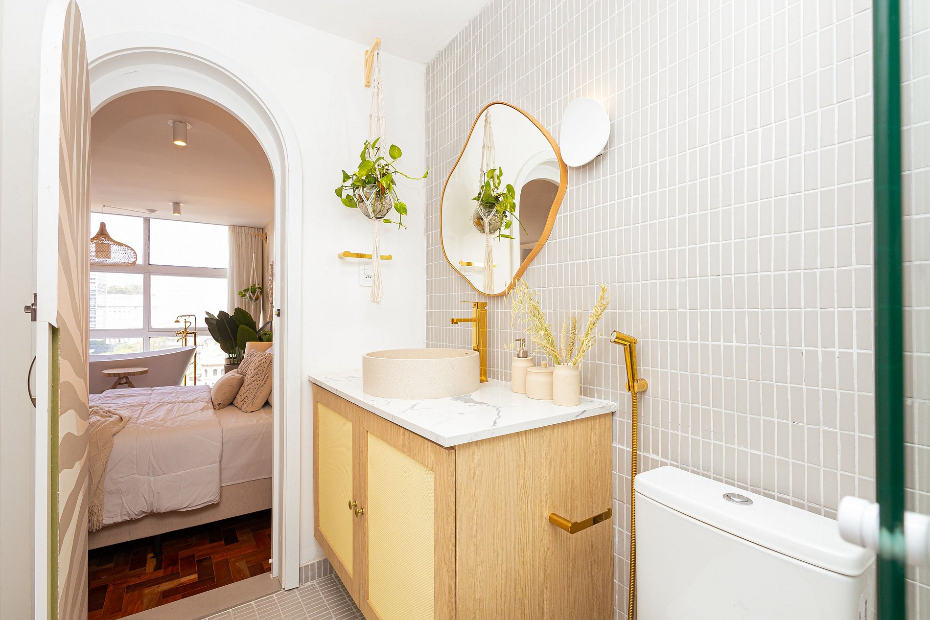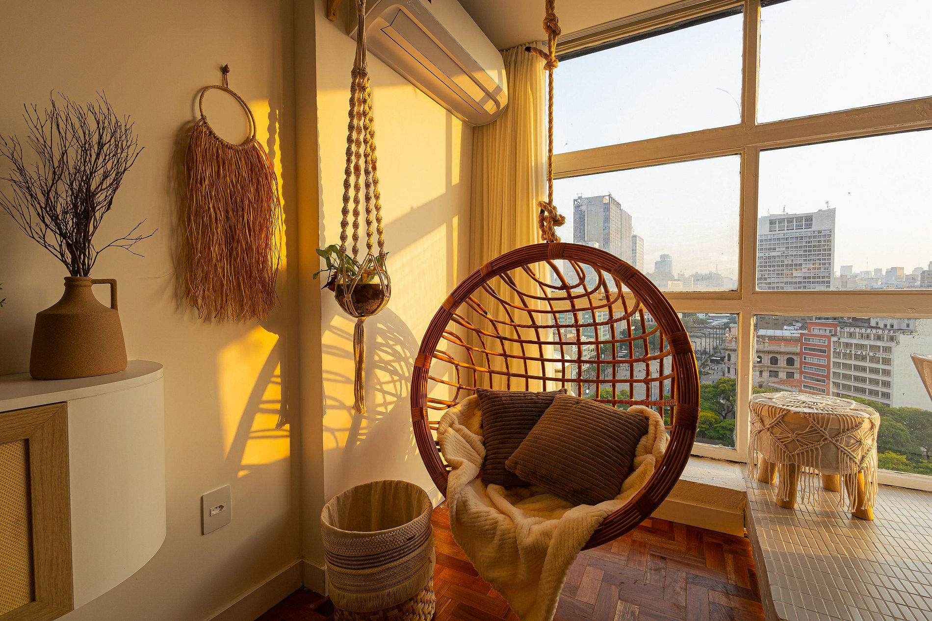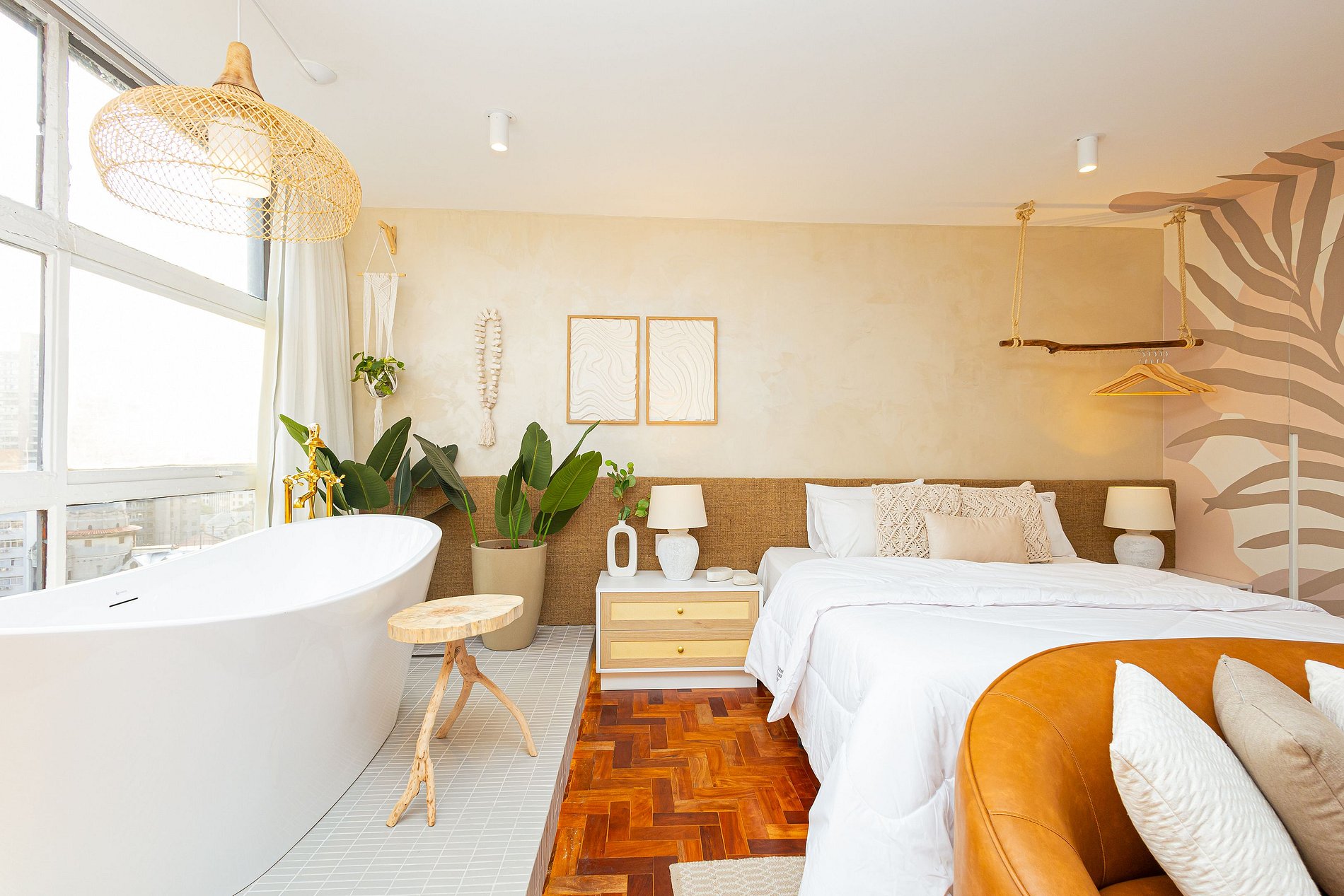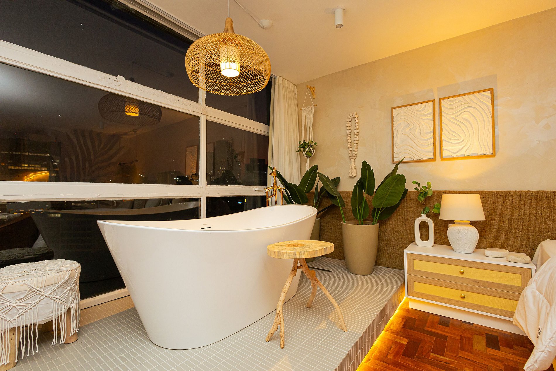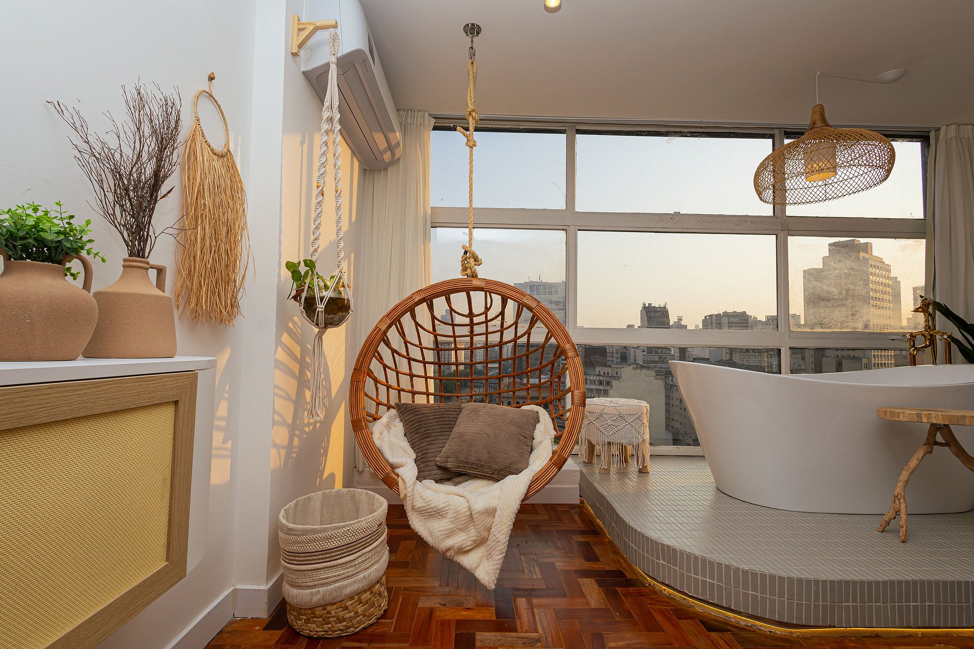 Experience the romance and magic of Ancestral SampaSky, a charming studio on the 19th floor of the historic Edifício Mirante do Vale. Imagine yourself relaxing in an organically designed bathtub, strategically positioned next to a huge window, where the spectacular view of the Santa Ifigênia Viaduct becomes part of your private setting.