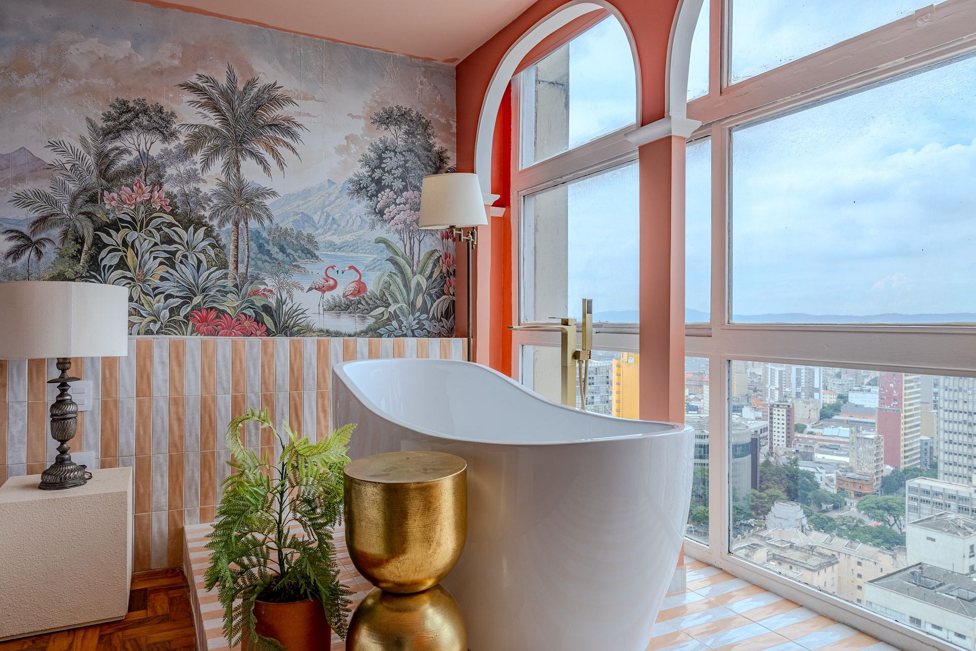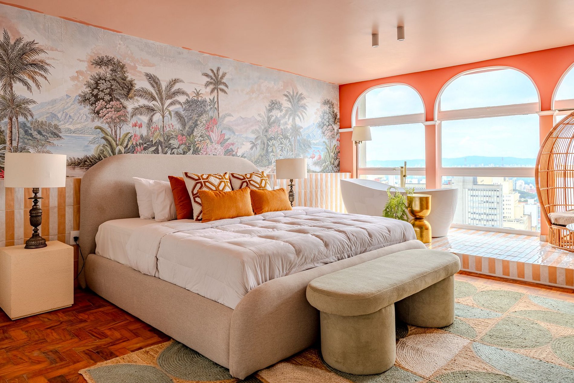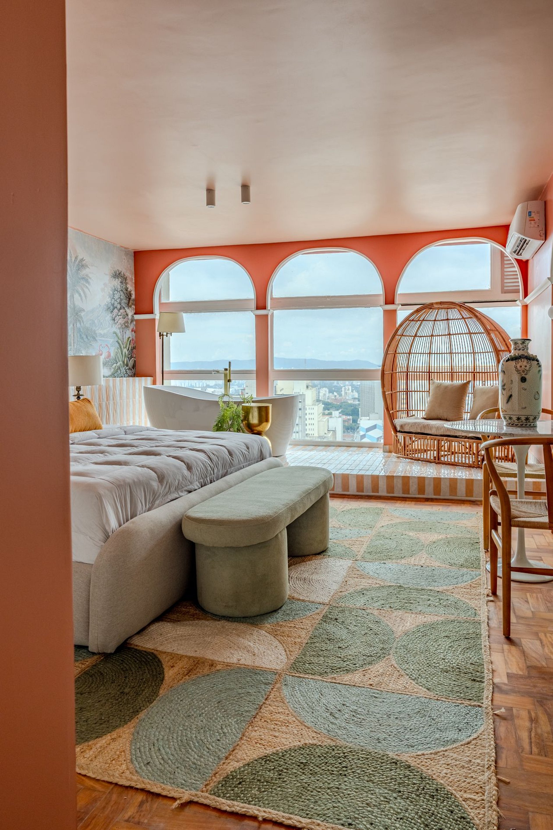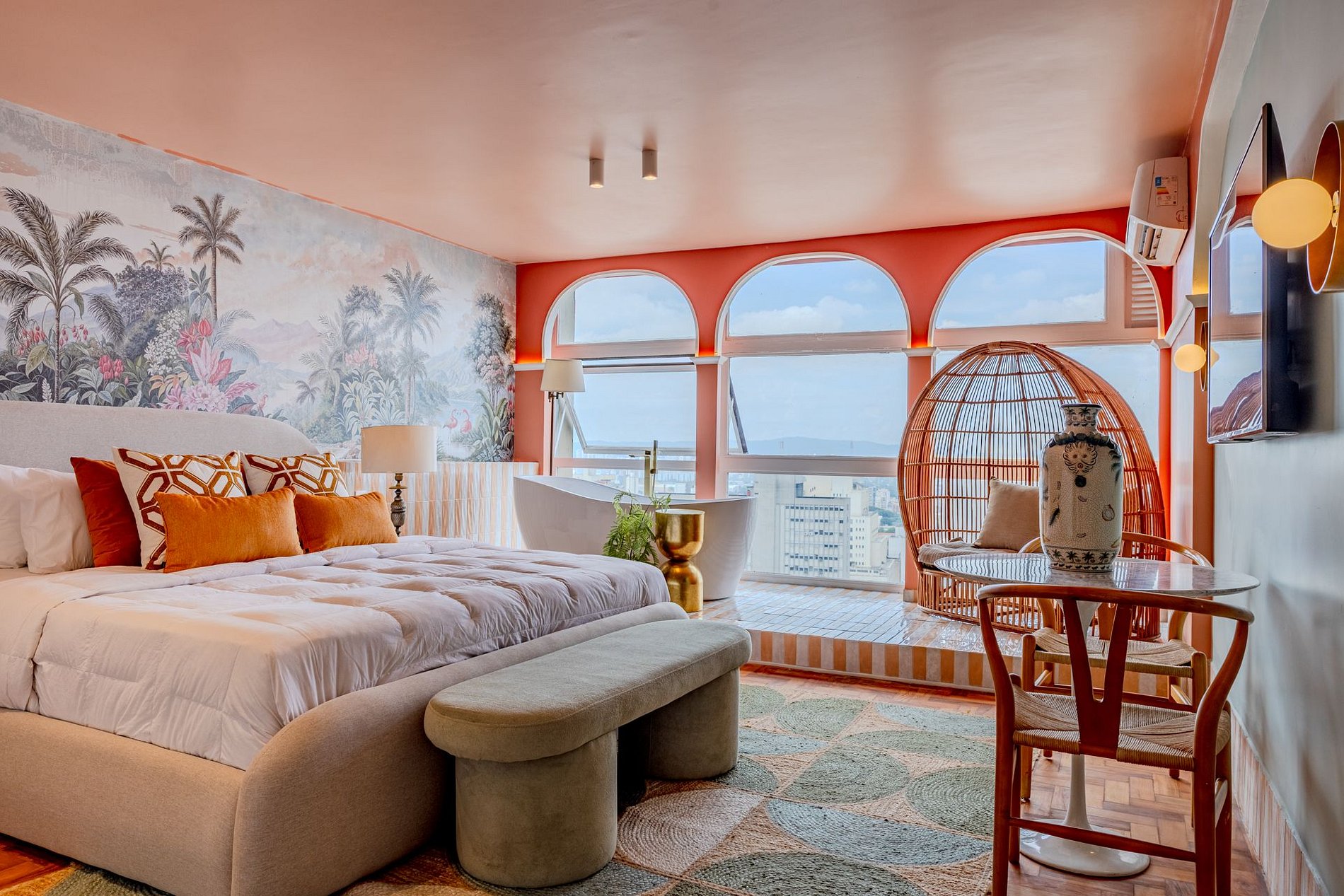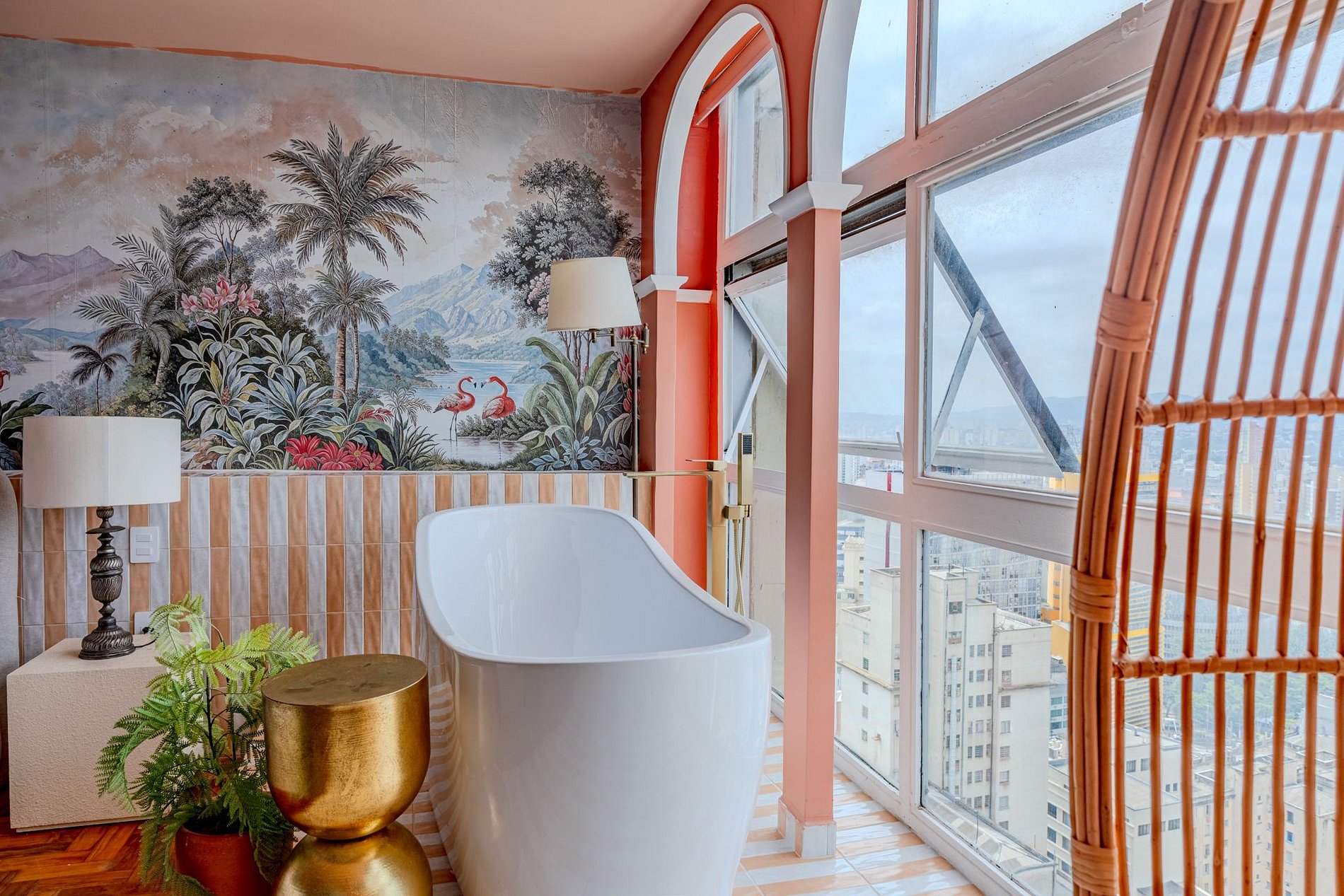 The design blends tropical elegance with bold coral tones, creating a warm and memorable atmosphere. A large artistic mural brings personality and charm, while the beautiful arched windows frame a breathtaking panoramic skyline stretching from Downtown São Paulo all the way to the Cantareira mountains.