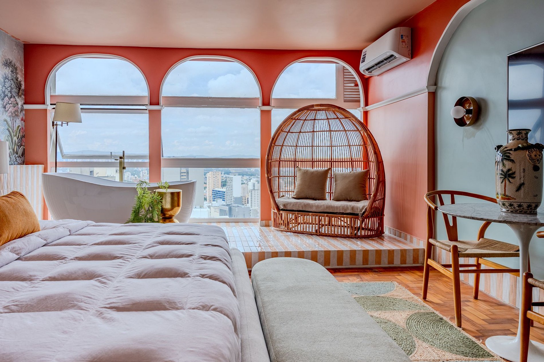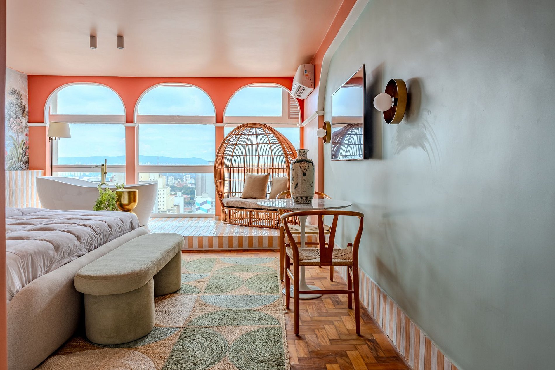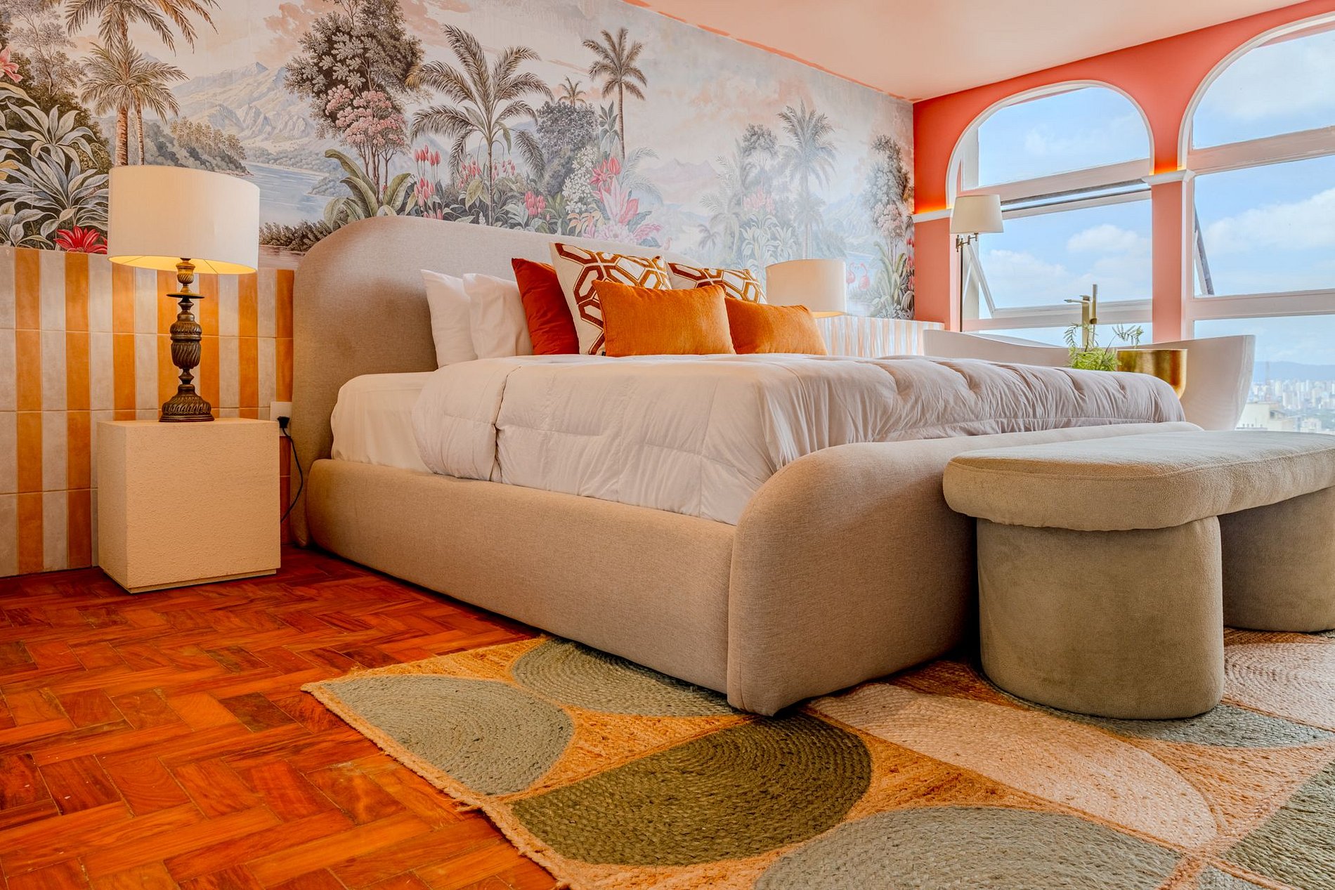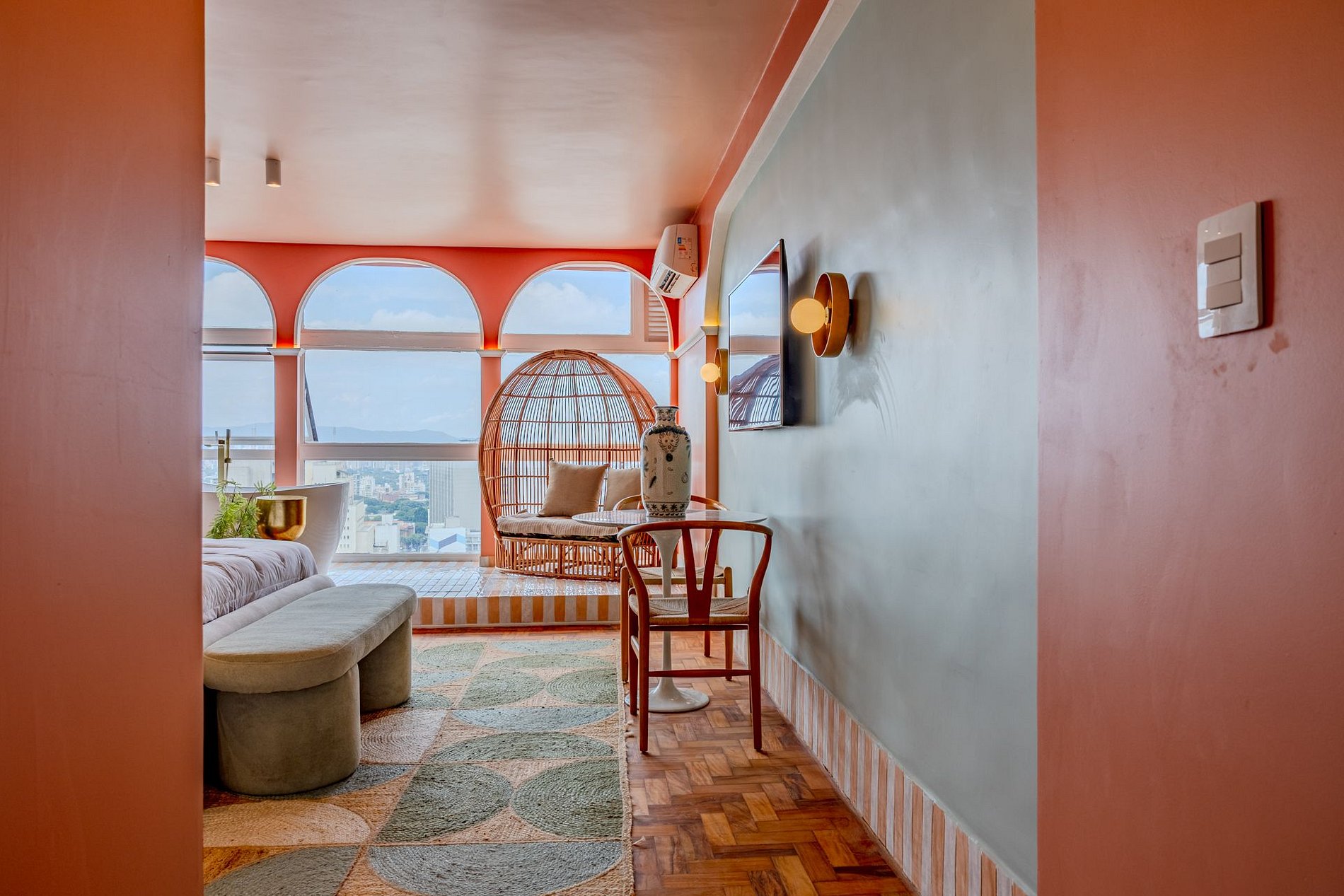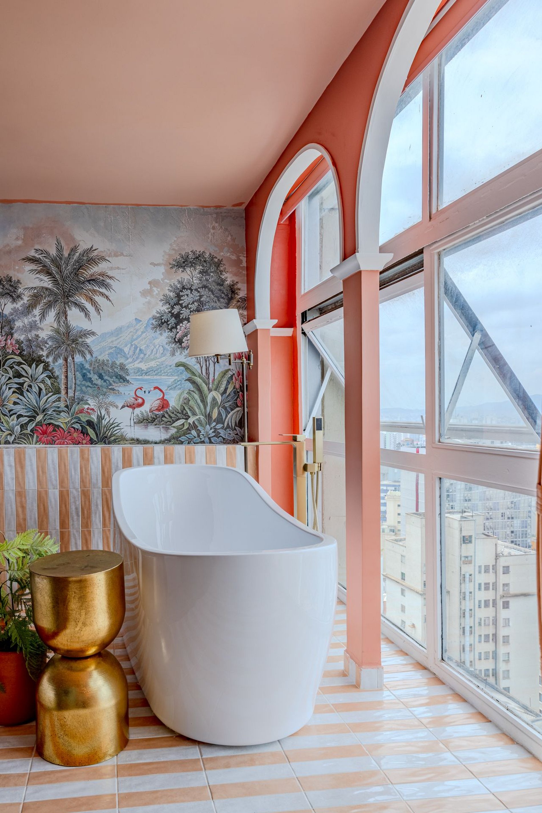 The design blends tropical elegance with bold coral tones, creating a warm and memorable atmosphere. A large artistic mural brings personality and charm, while the beautiful arched windows frame a breathtaking panoramic skyline stretching from Downtown São Paulo all the way to the Cantareira mountains.