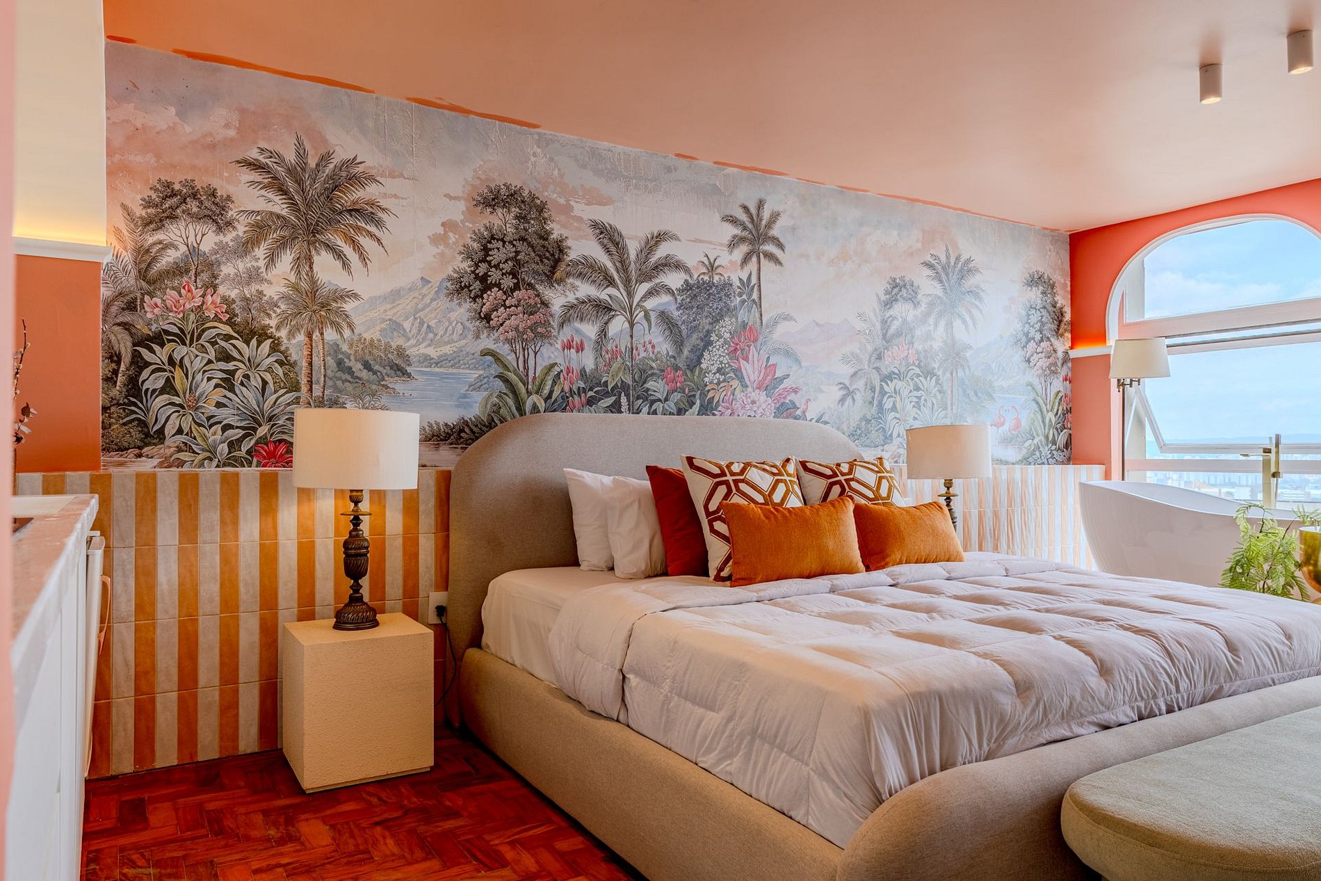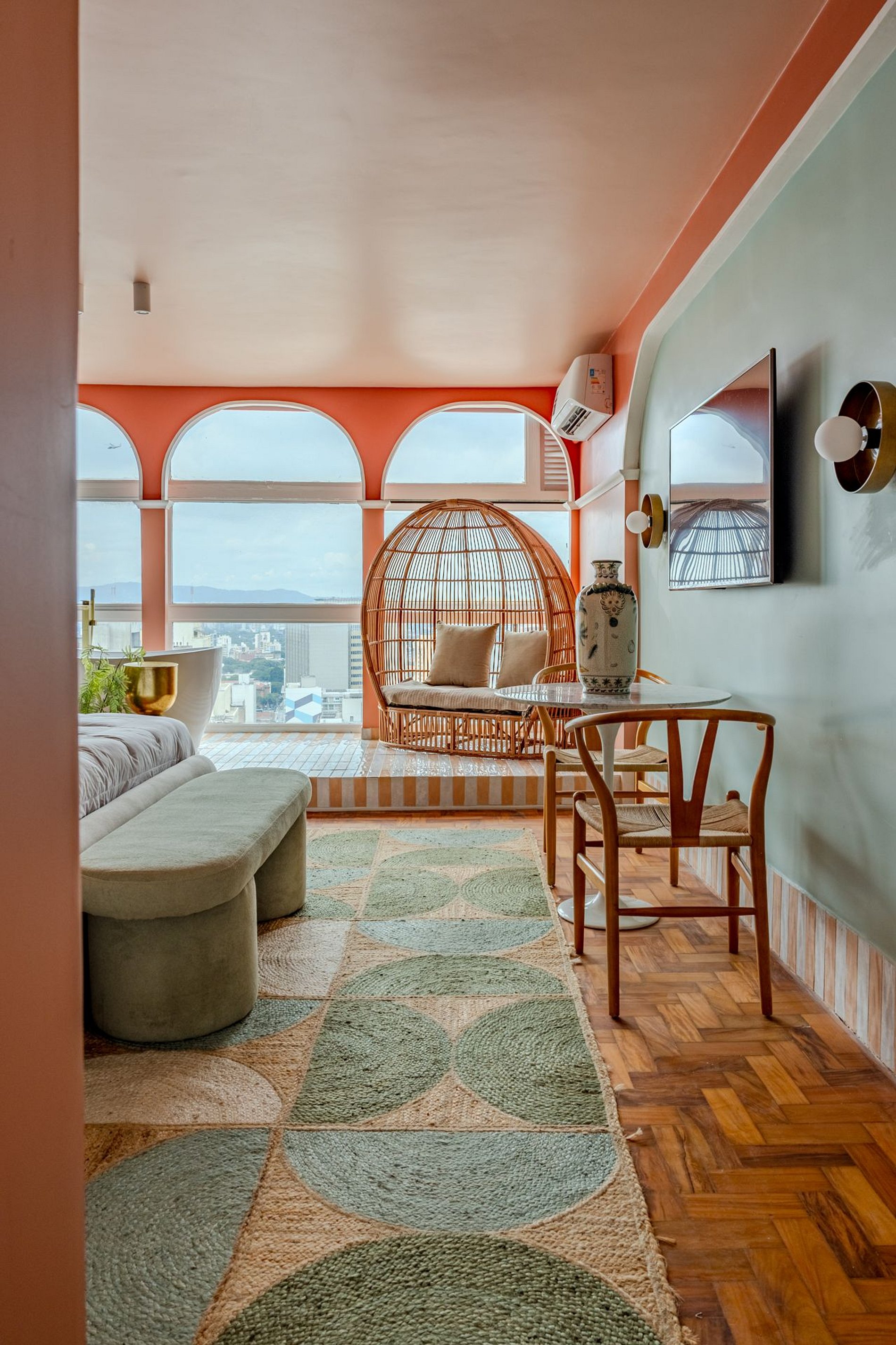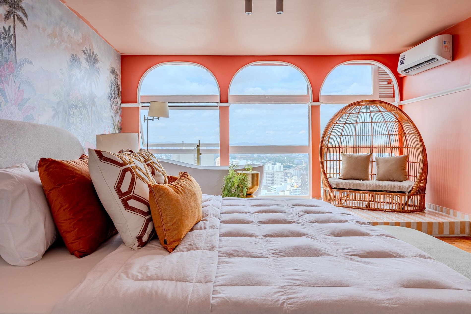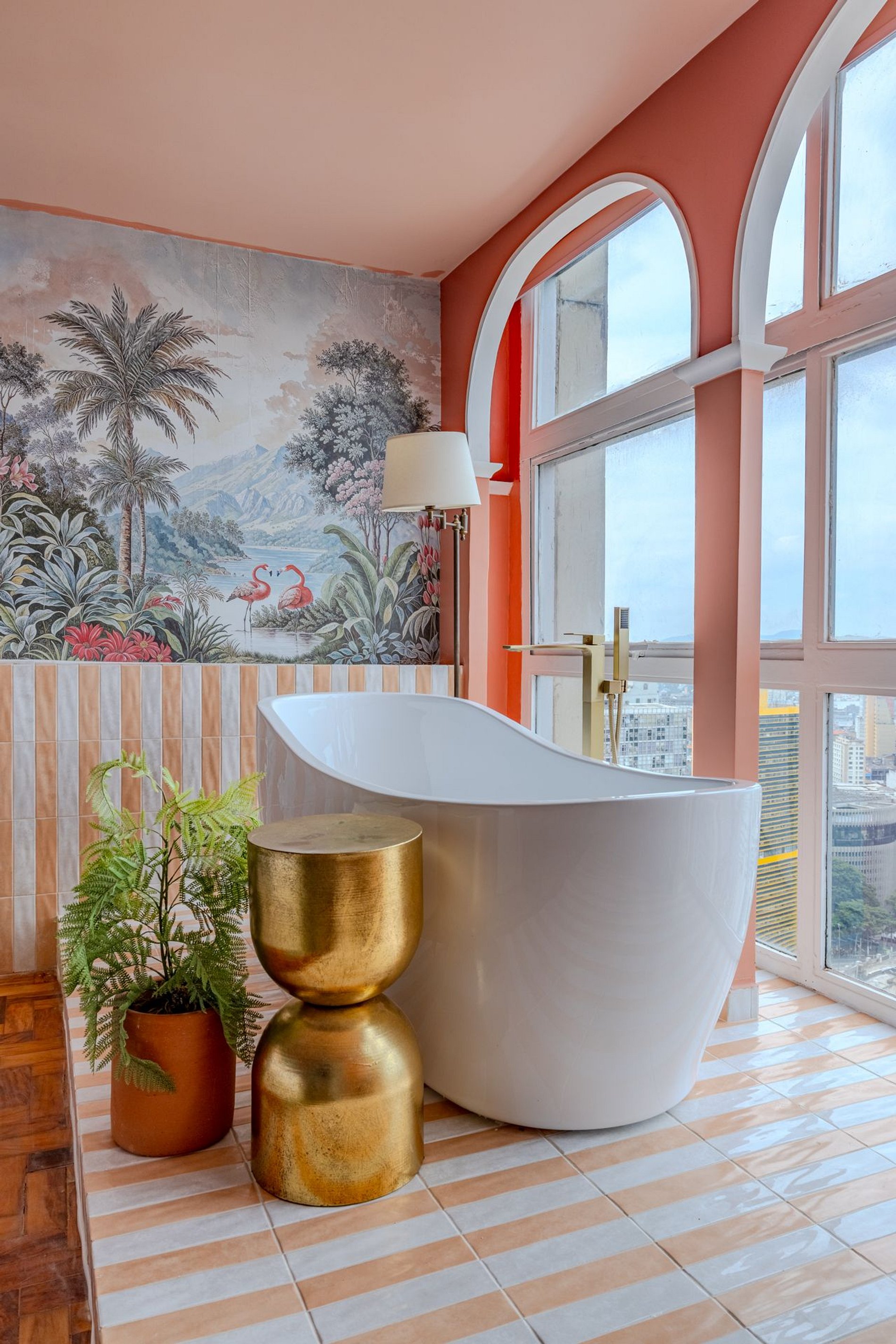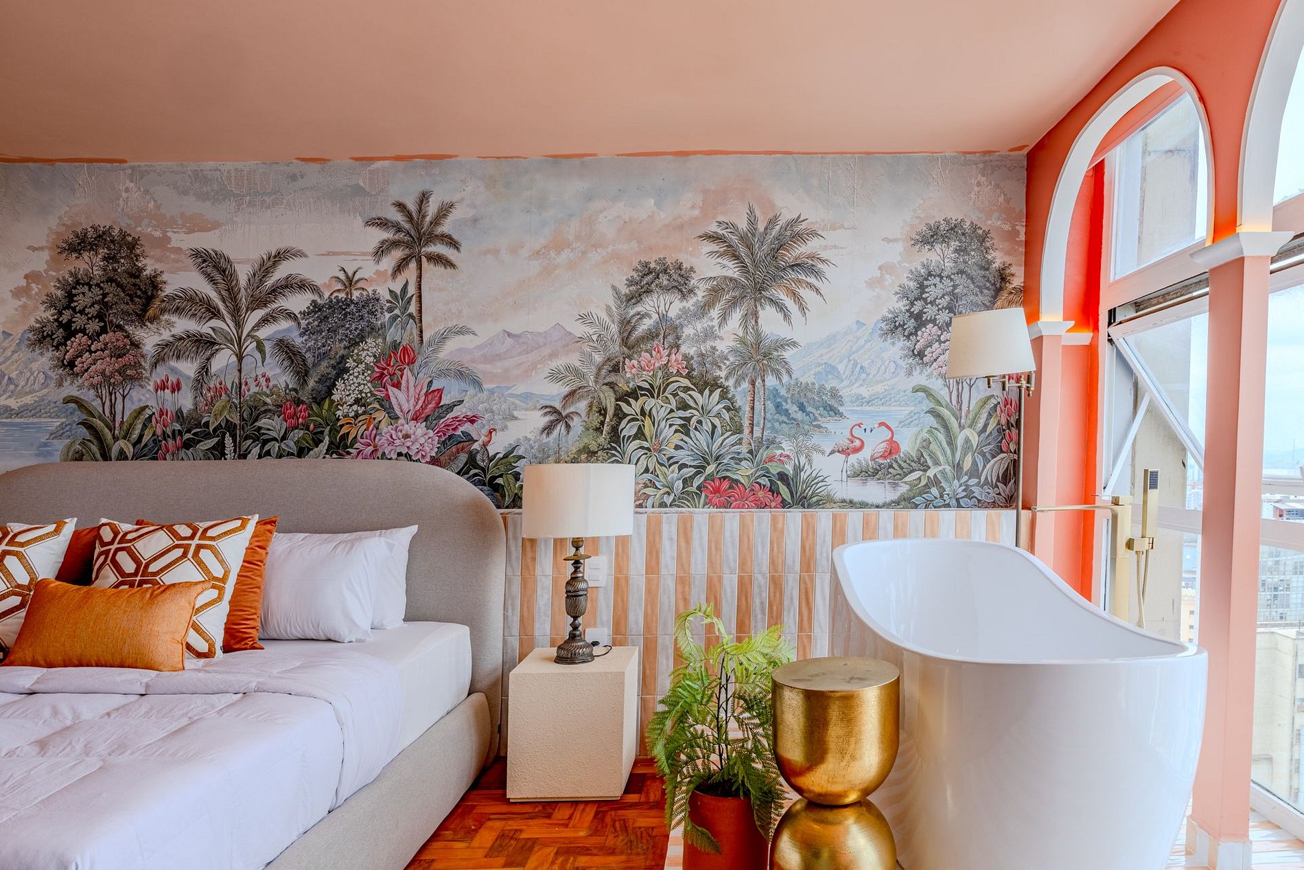 The design blends tropical elegance with bold coral tones, creating a warm and memorable atmosphere. A large artistic mural brings personality and charm, while the beautiful arched windows frame a breathtaking panoramic skyline stretching from Downtown São Paulo all the way to the Cantareira mountains.