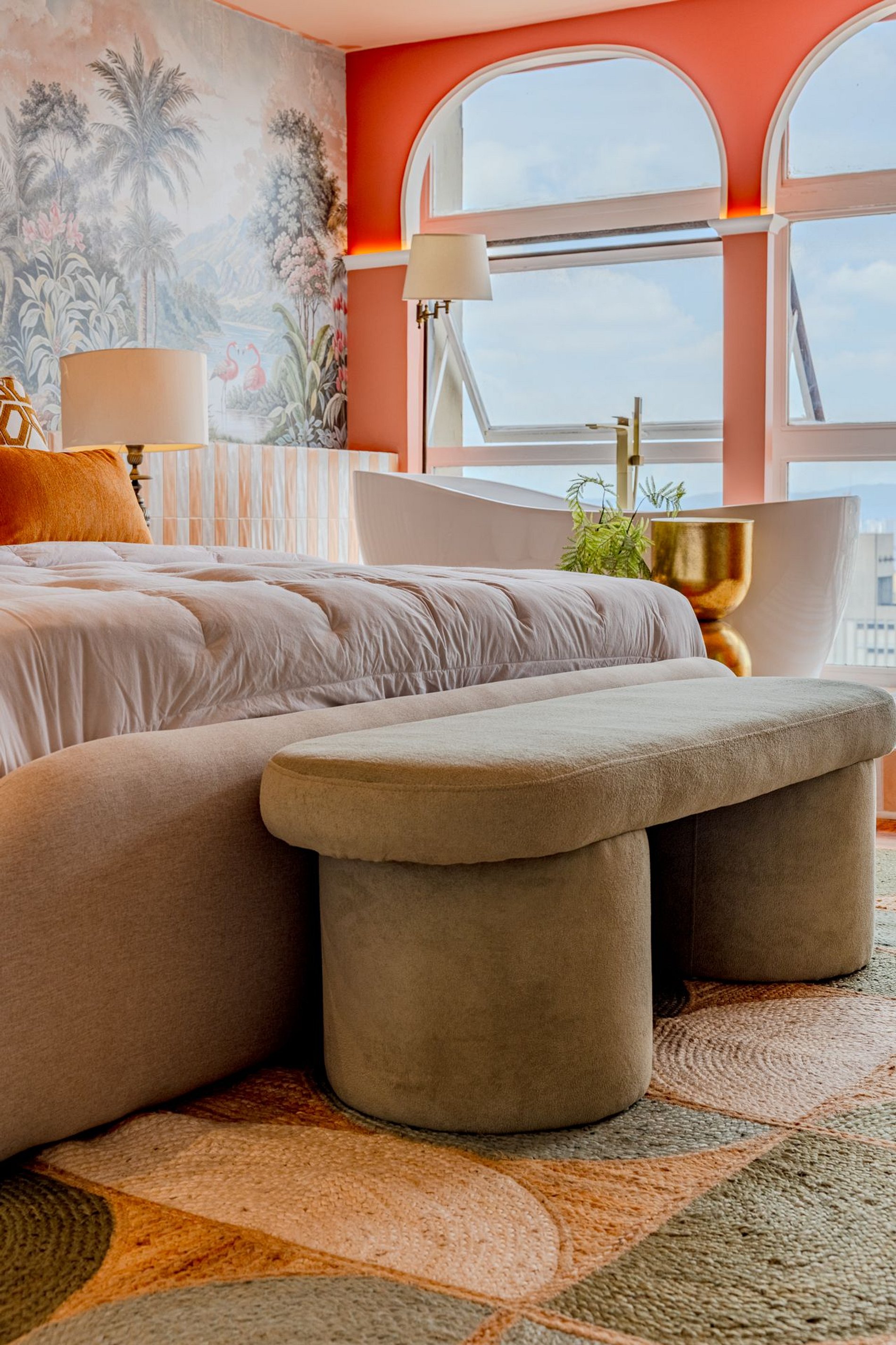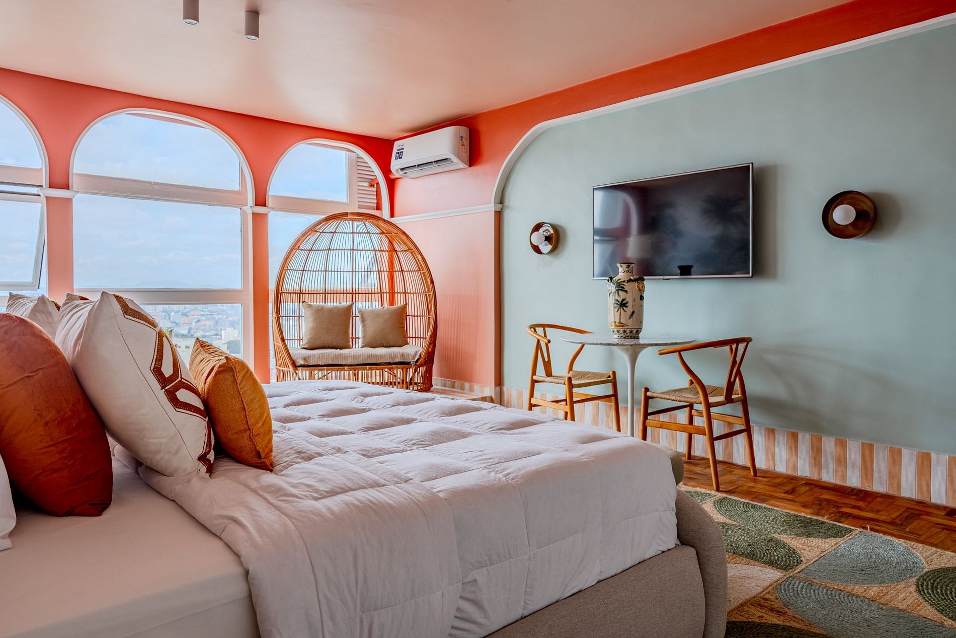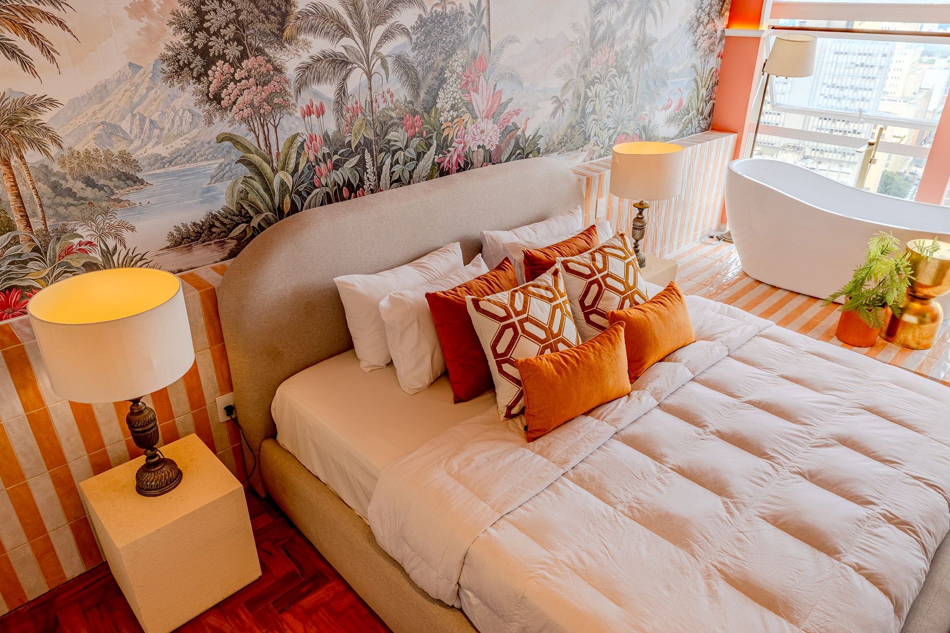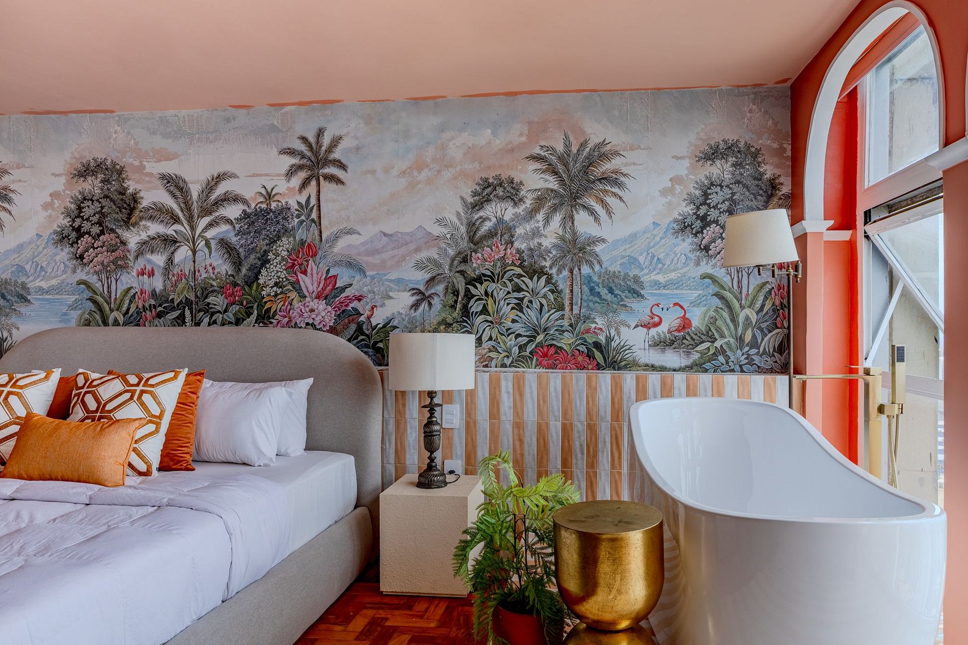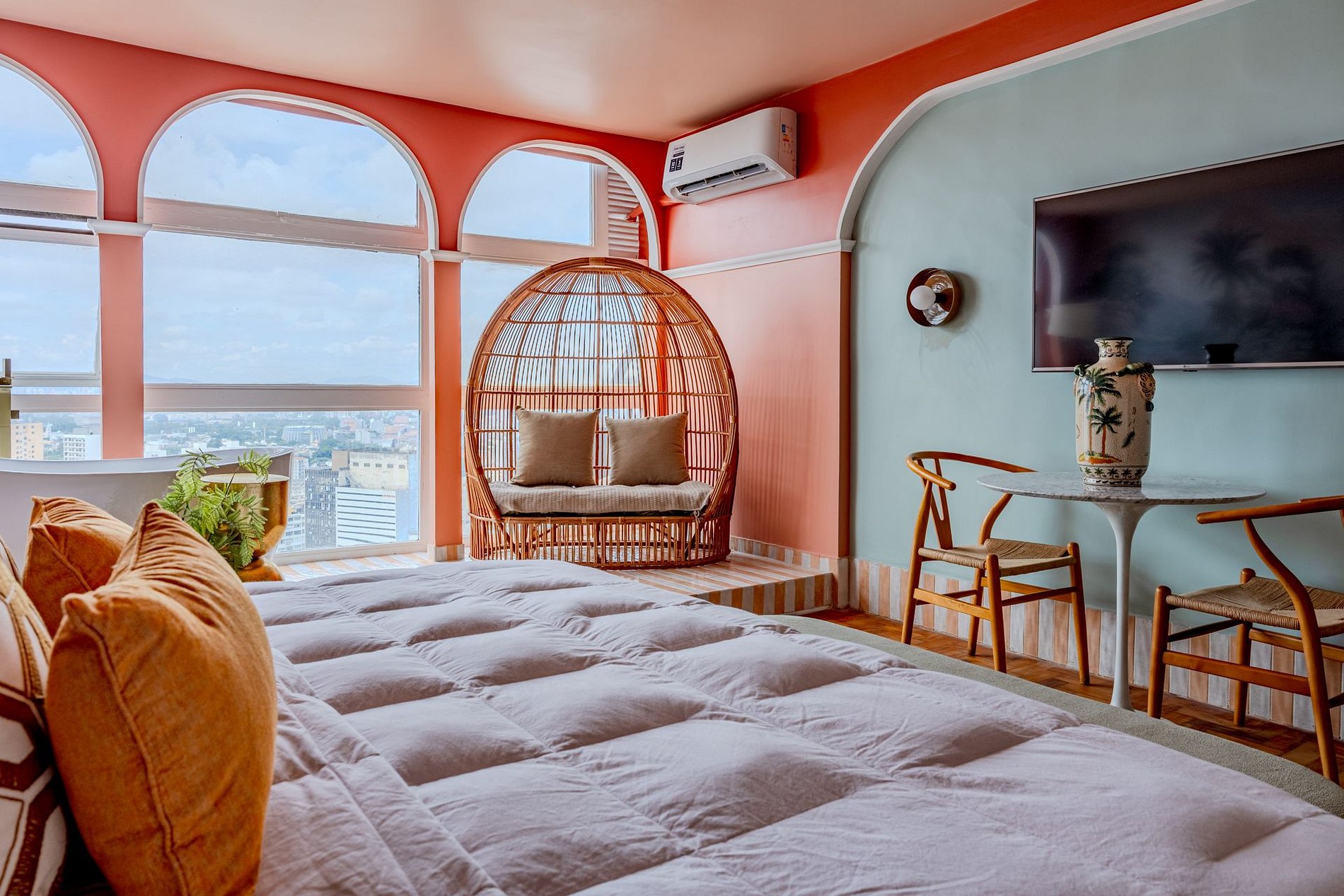 The design blends tropical elegance with bold coral tones, creating a warm and memorable atmosphere. A large artistic mural brings personality and charm, while the beautiful arched windows frame a breathtaking panoramic skyline stretching from Downtown São Paulo all the way to the Cantareira mountains.