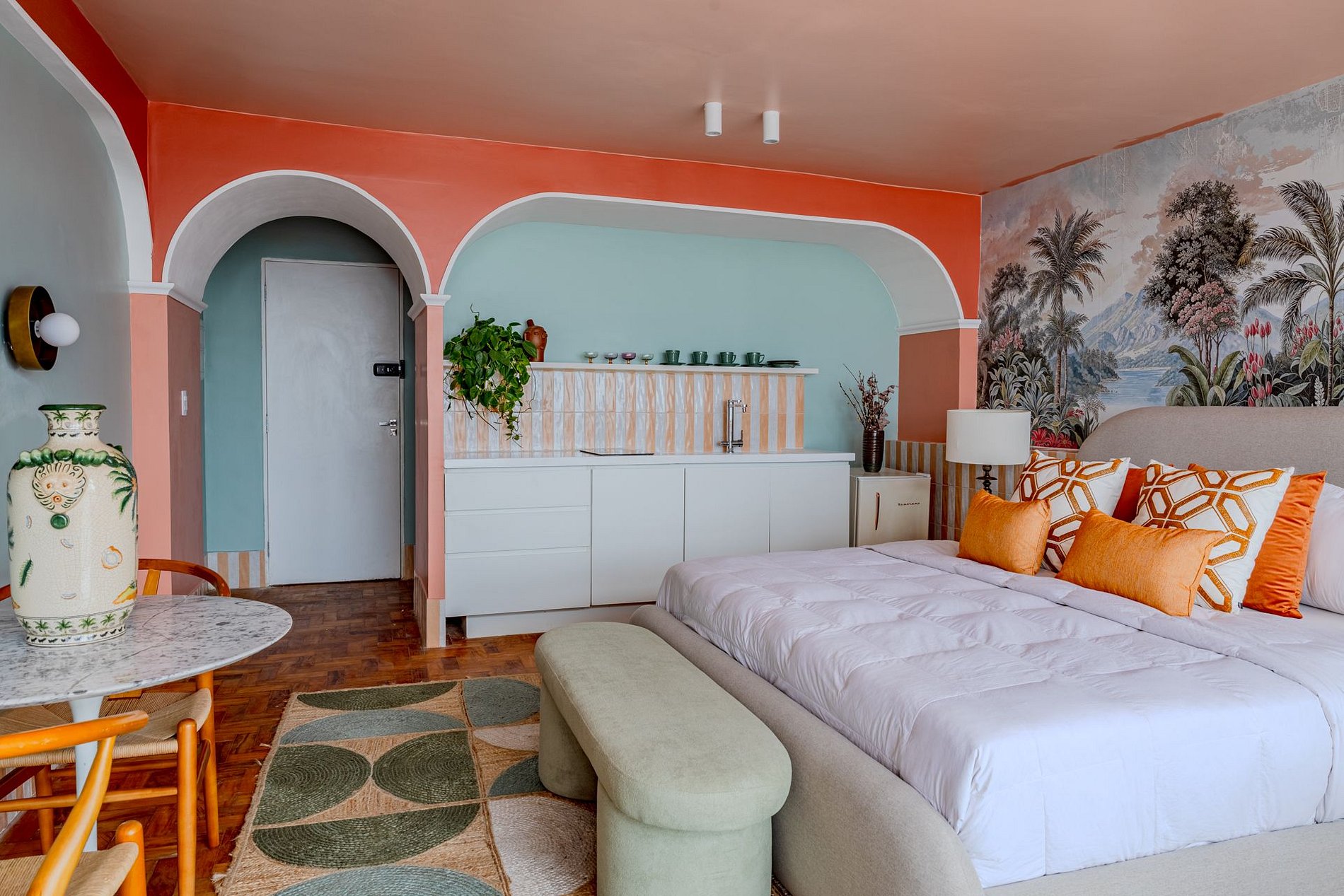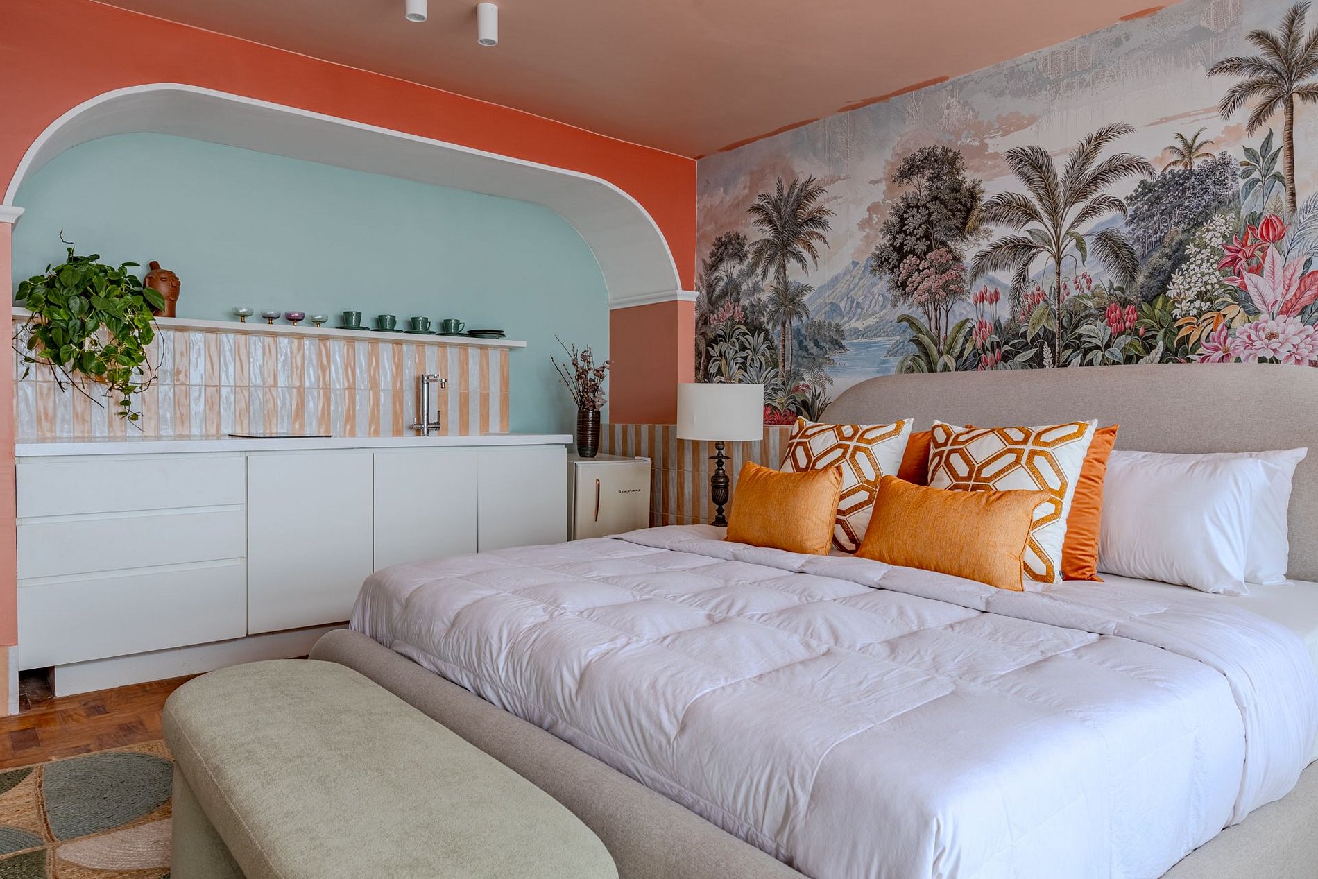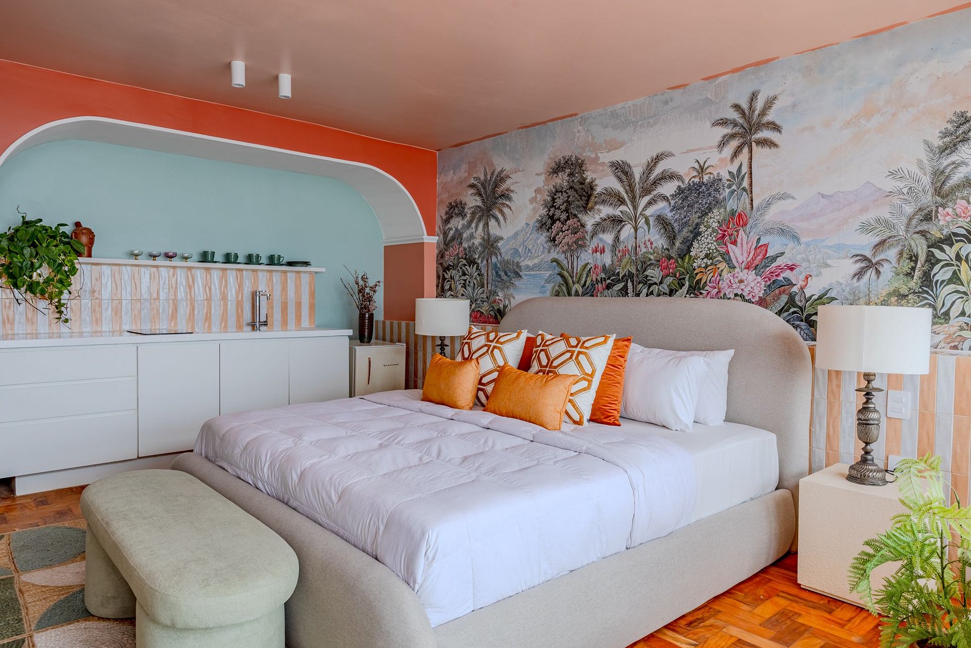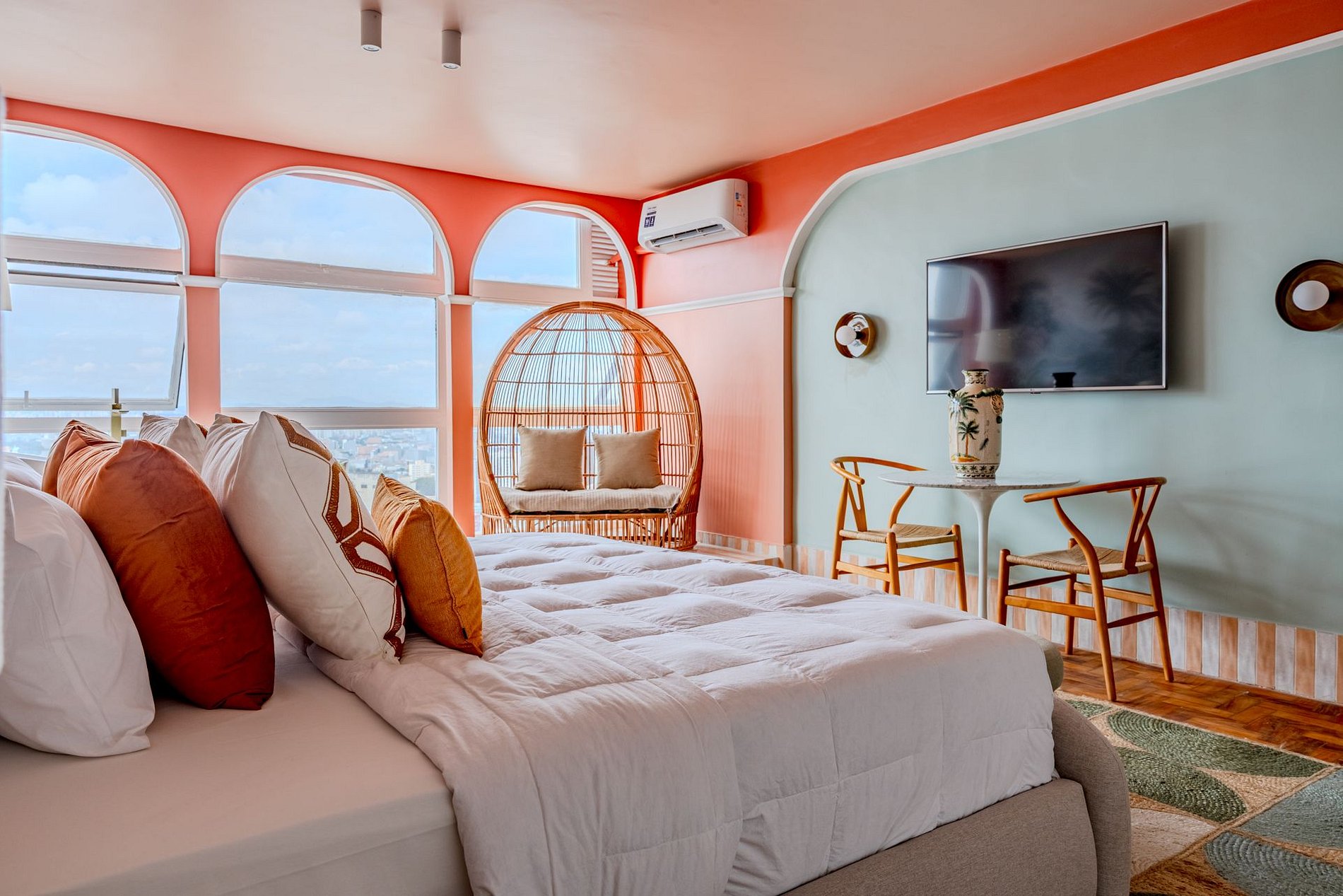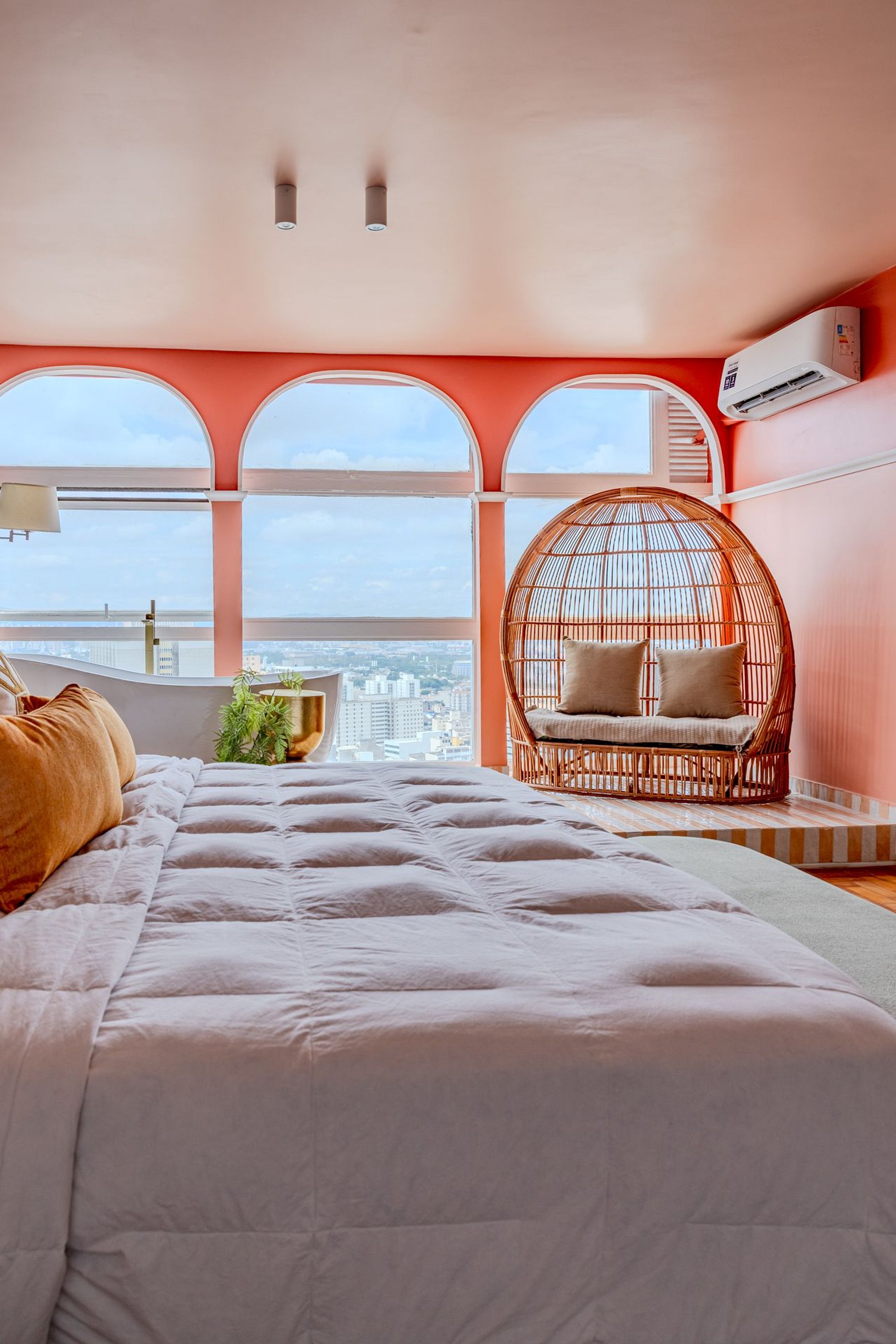 The design blends tropical elegance with bold coral tones, creating a warm and memorable atmosphere. A large artistic mural brings personality and charm, while the beautiful arched windows frame a breathtaking panoramic skyline stretching from Downtown São Paulo all the way to the Cantareira mountains.