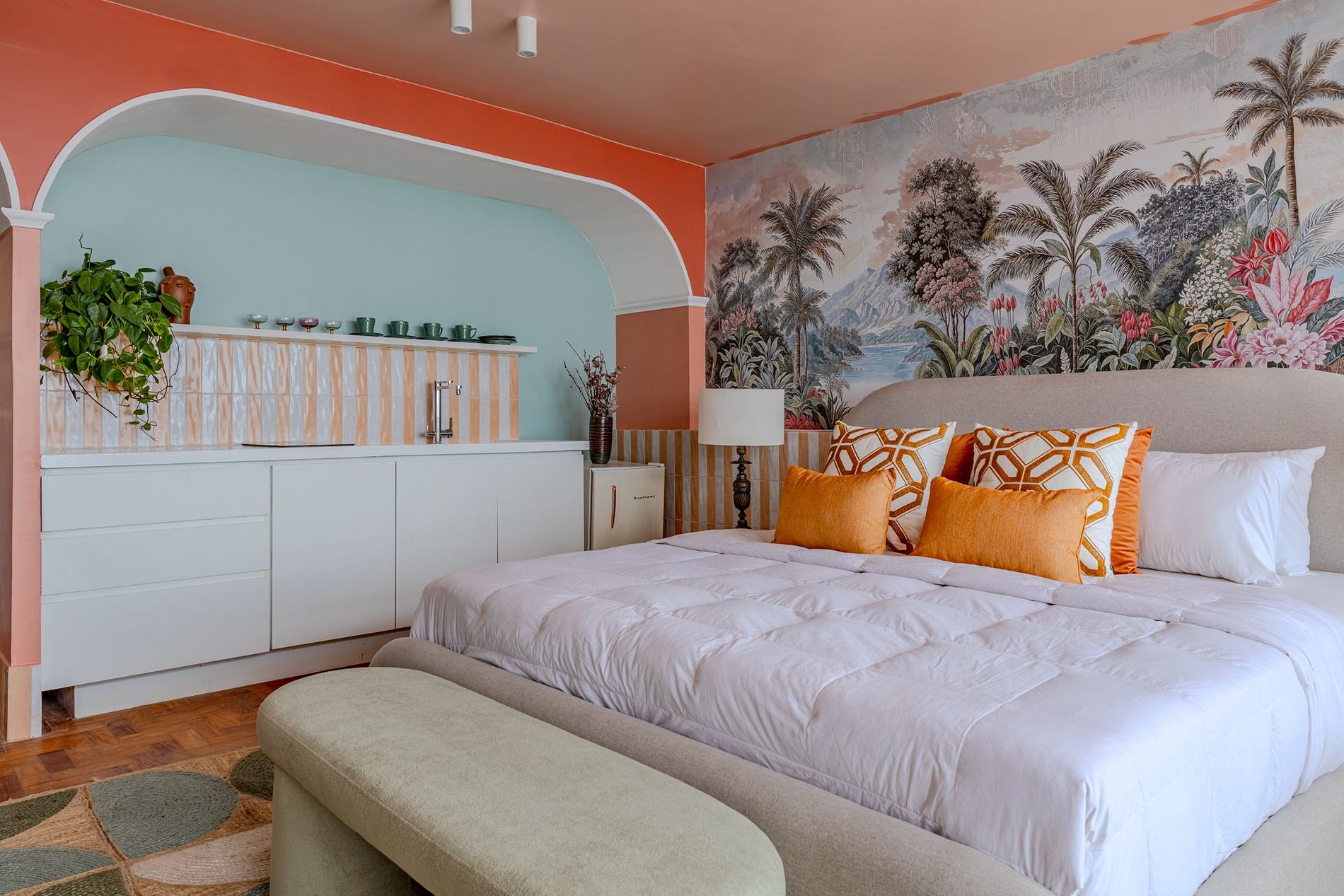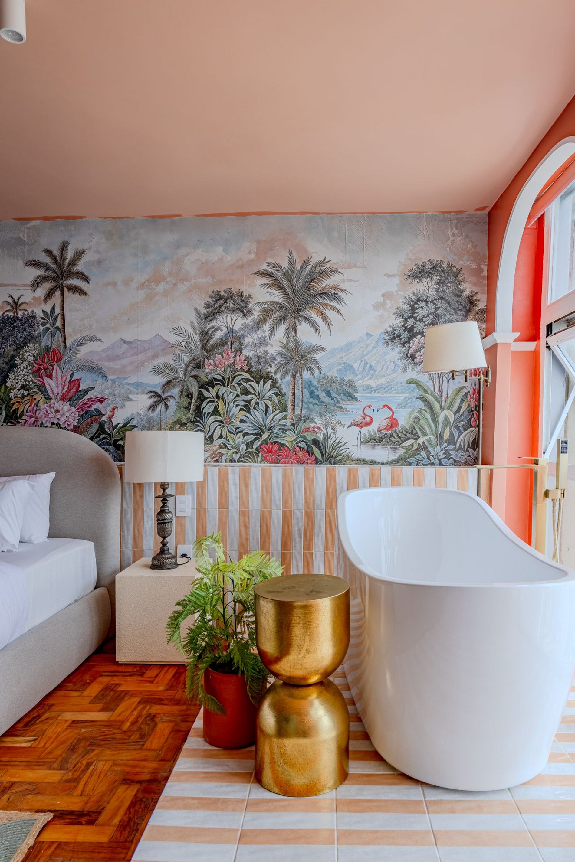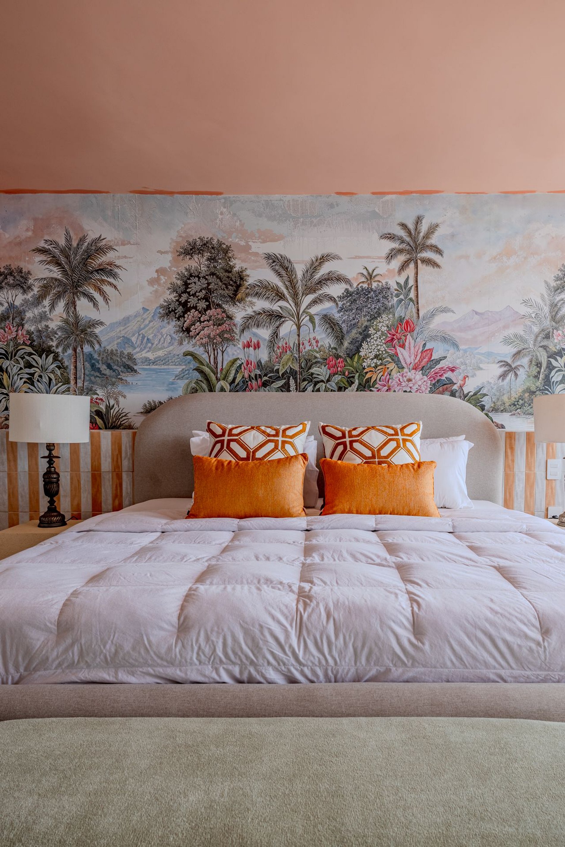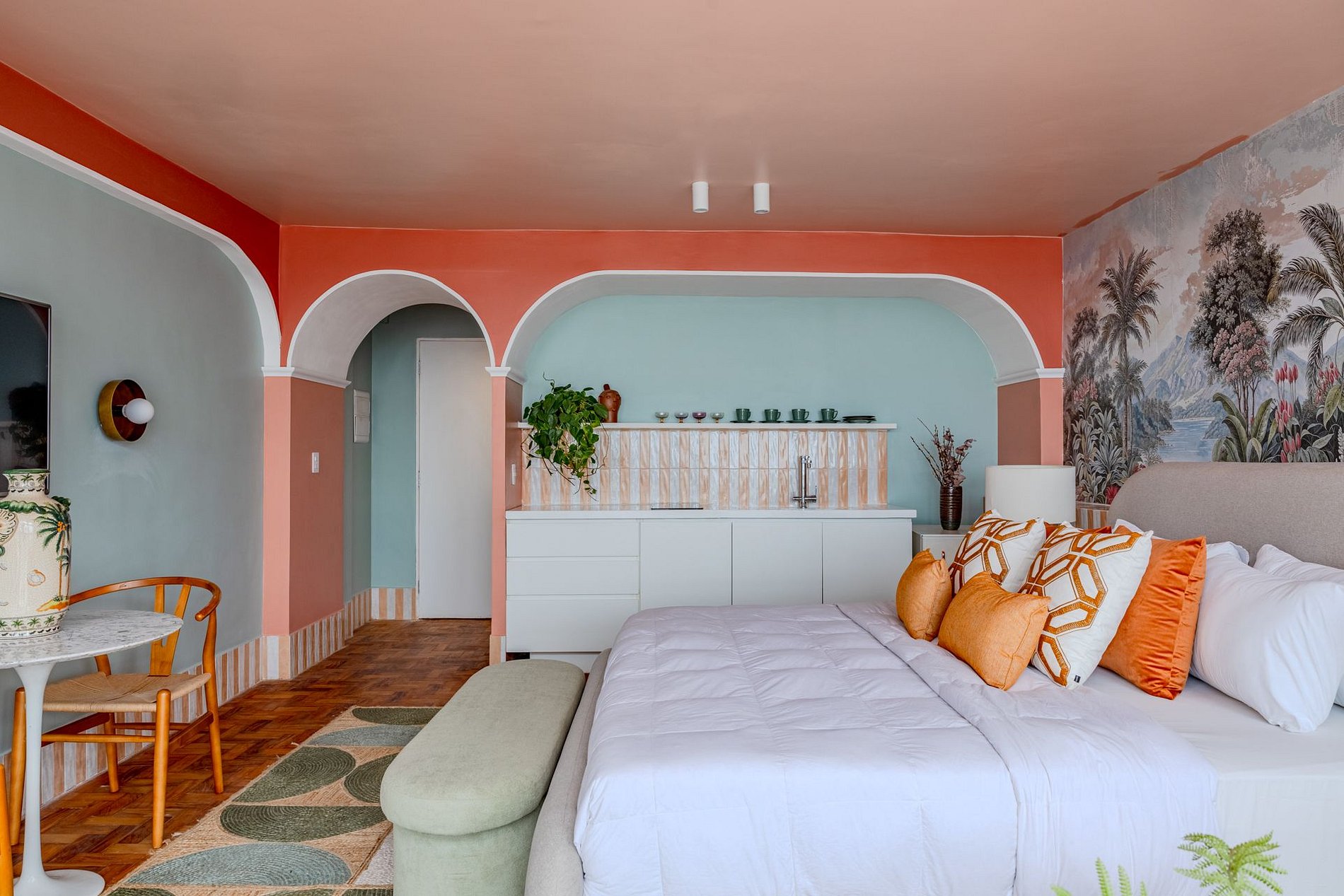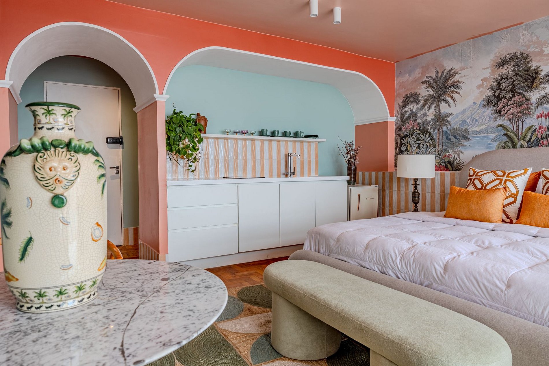 The design blends tropical elegance with bold coral tones, creating a warm and memorable atmosphere. A large artistic mural brings personality and charm, while the beautiful arched windows frame a breathtaking panoramic skyline stretching from Downtown São Paulo all the way to the Cantareira mountains.