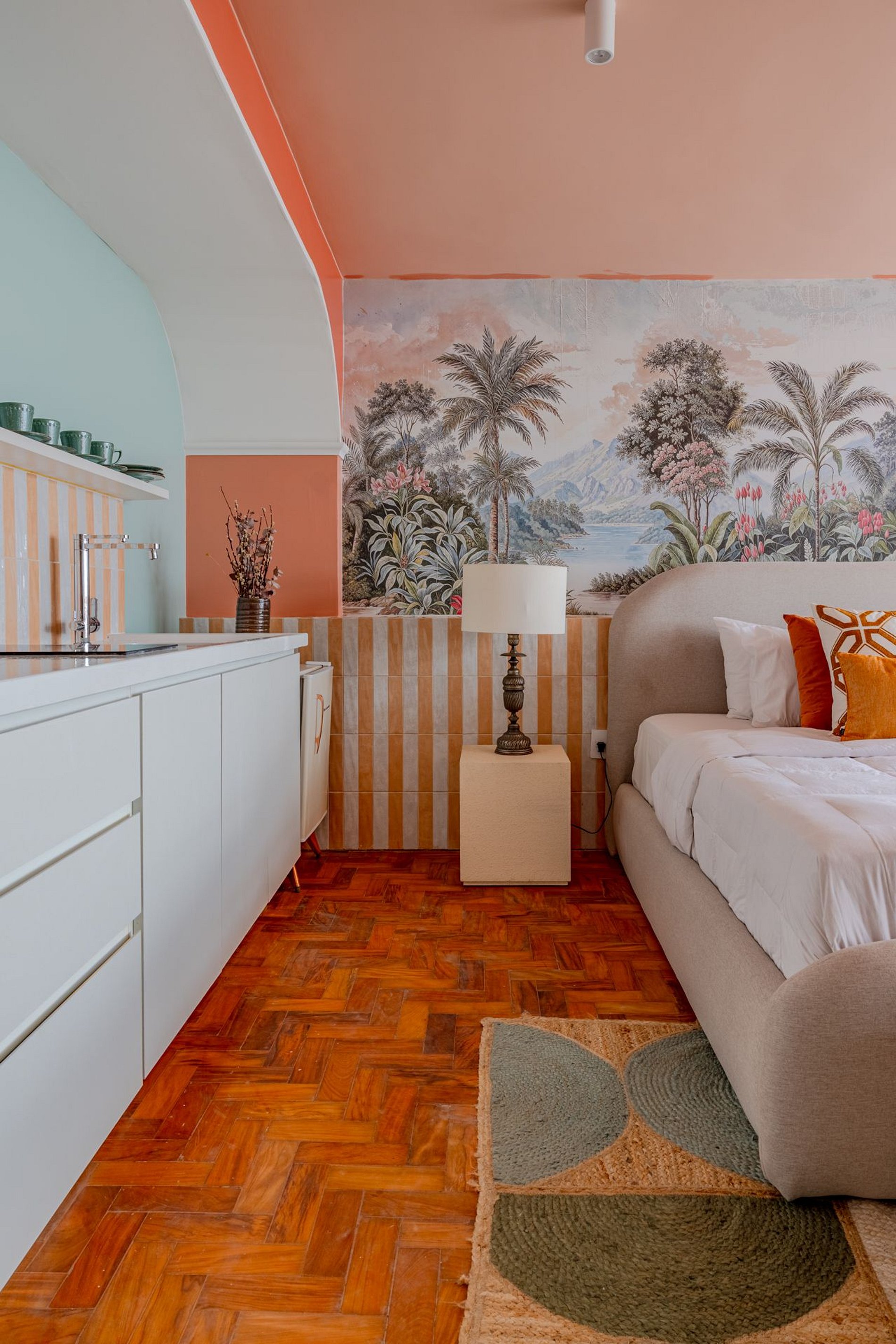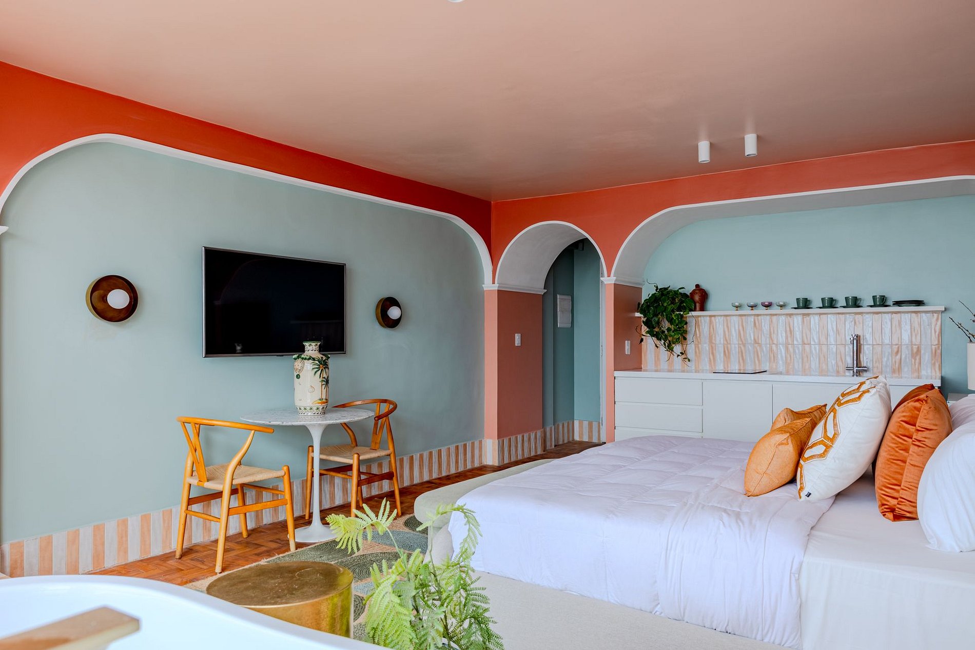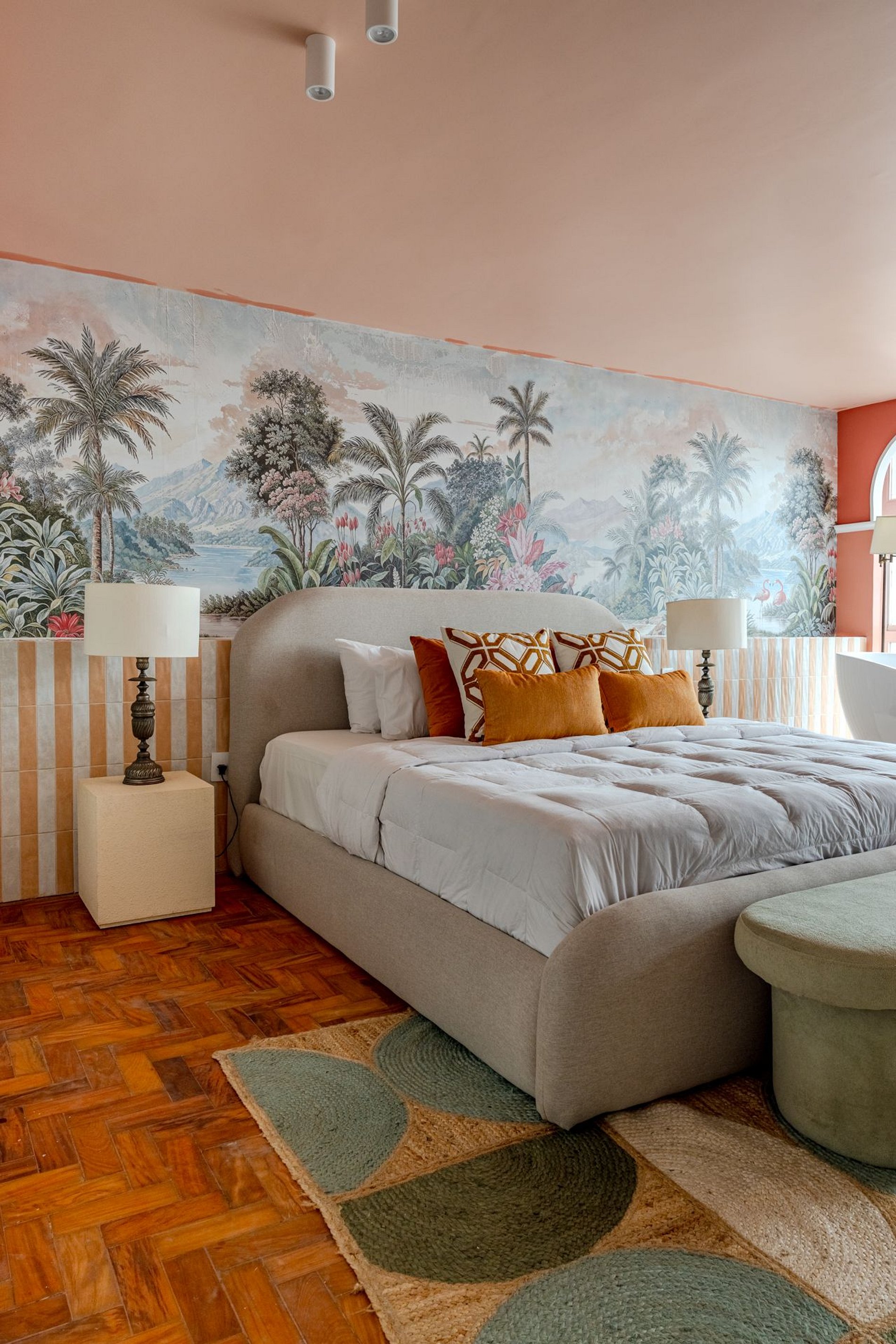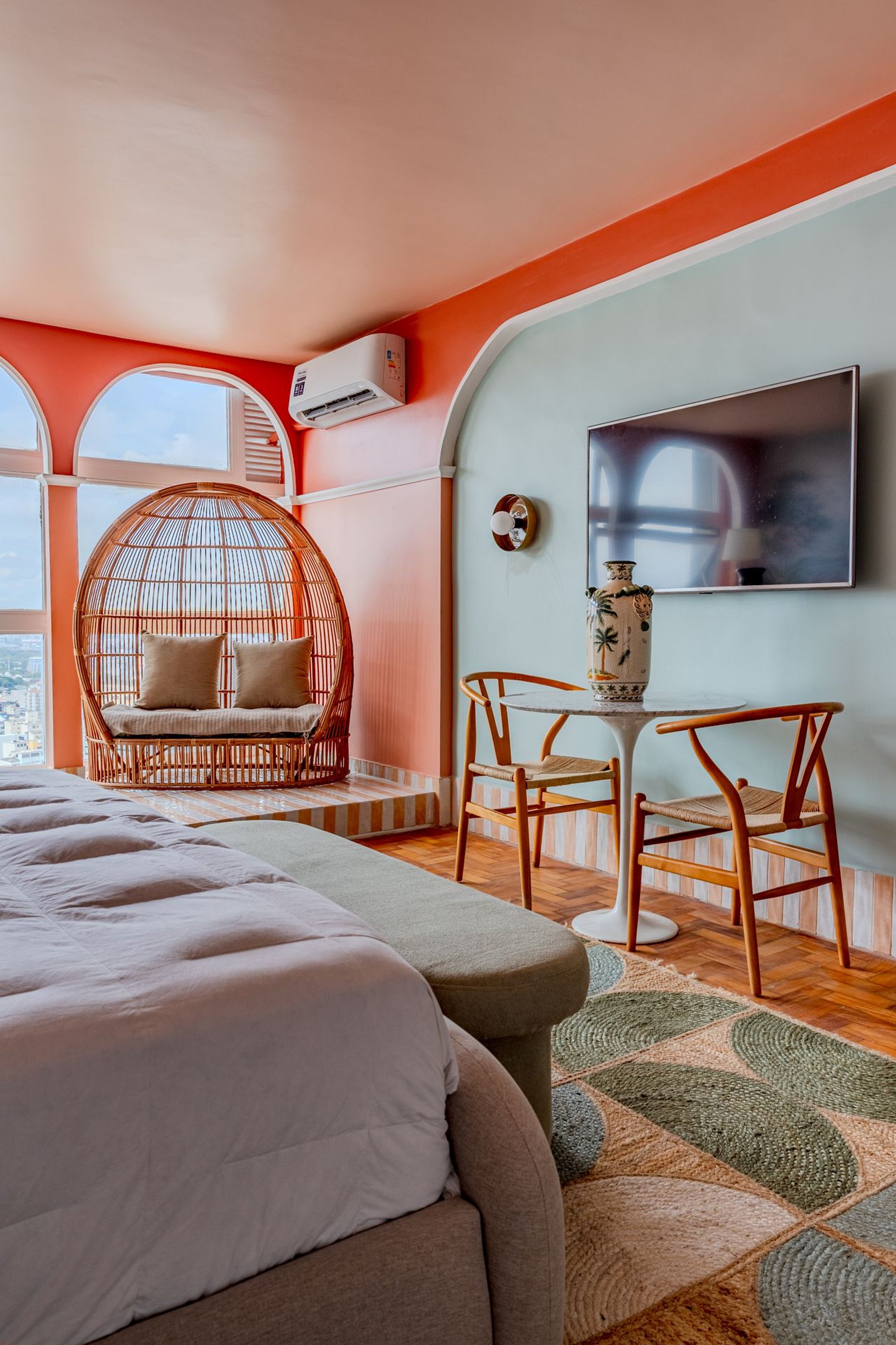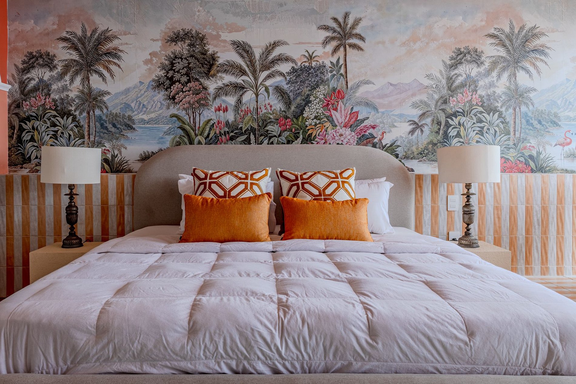 The design blends tropical elegance with bold coral tones, creating a warm and memorable atmosphere. A large artistic mural brings personality and charm, while the beautiful arched windows frame a breathtaking panoramic skyline stretching from Downtown São Paulo all the way to the Cantareira mountains.