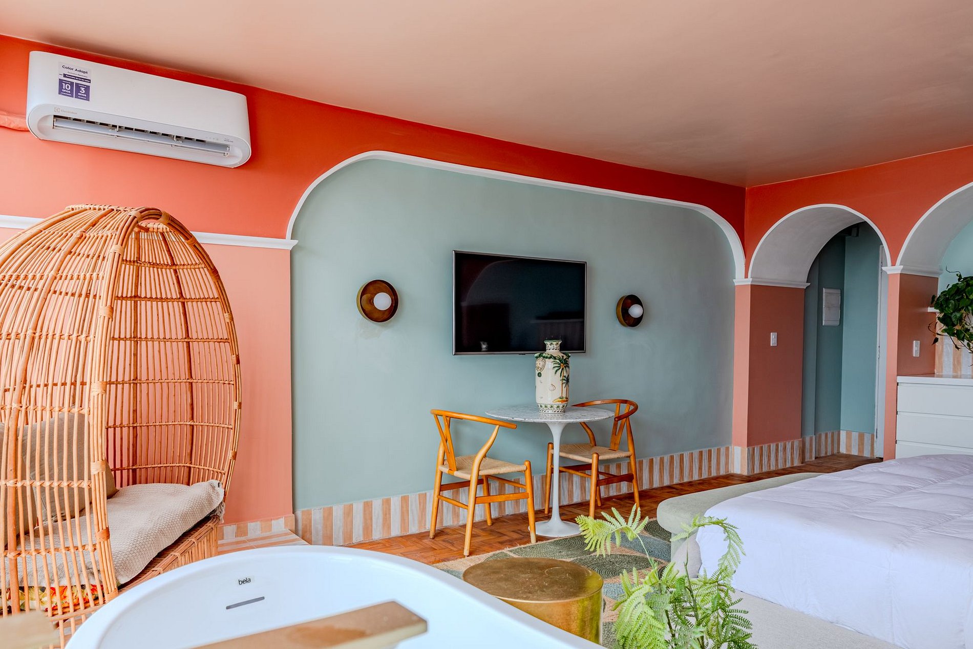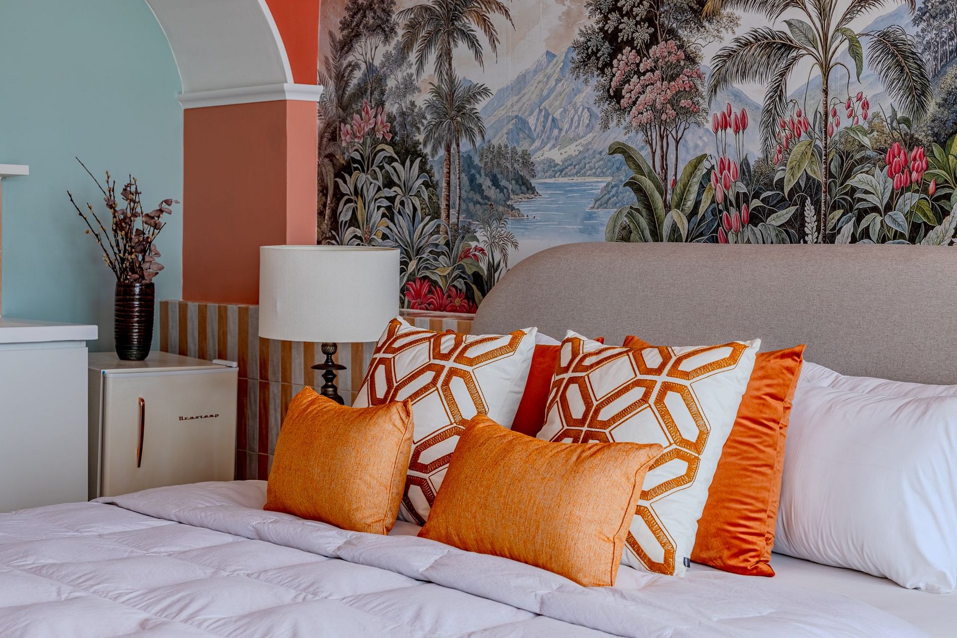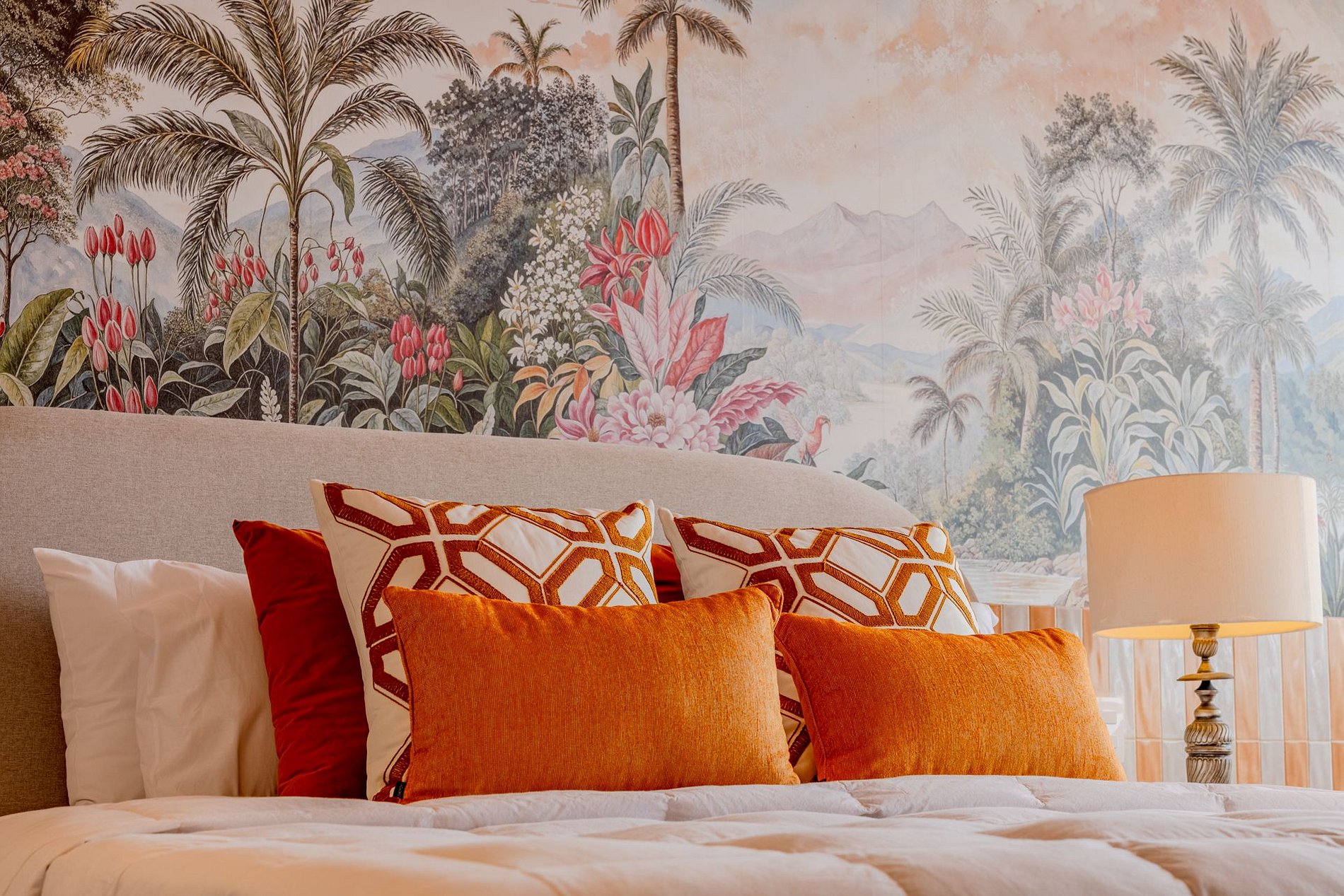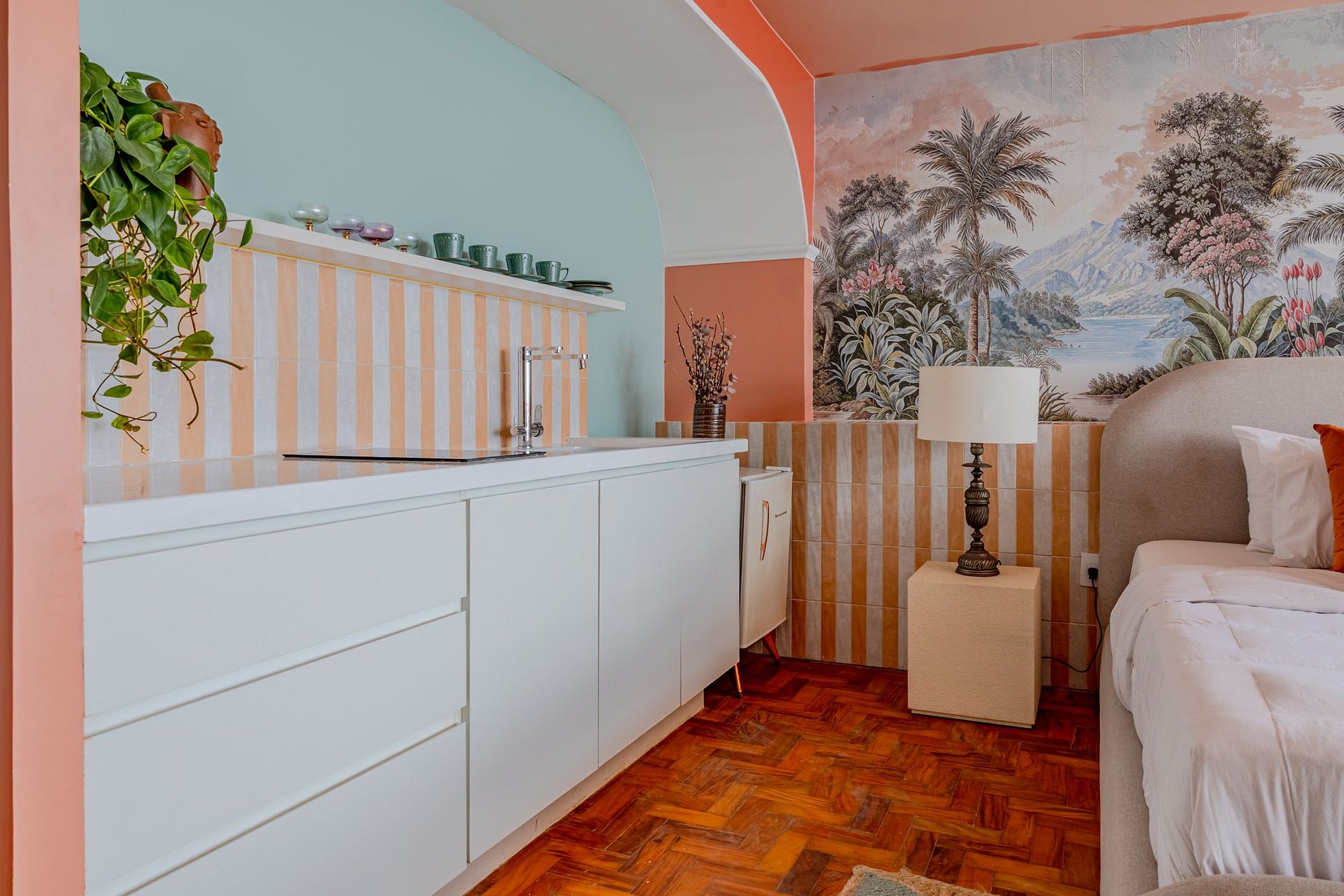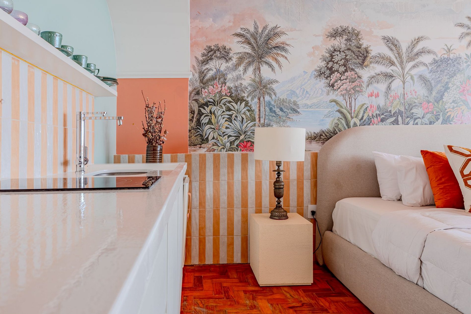The design blends tropical elegance with bold coral tones, creating a warm and memorable atmosphere. A large artistic mural brings personality and charm, while the beautiful arched windows frame a breathtaking panoramic skyline stretching from Downtown São Paulo all the way to the Cantareira mountains.
