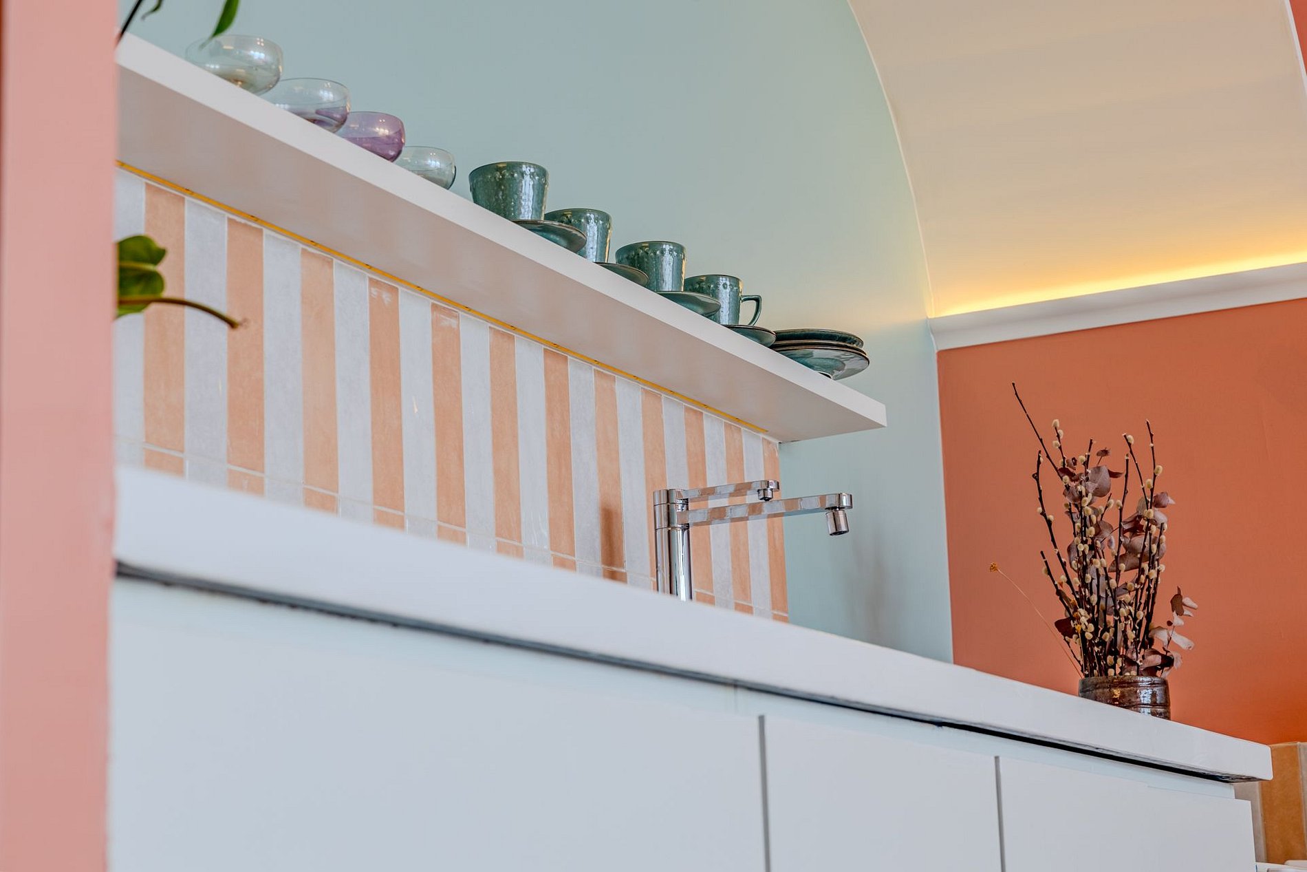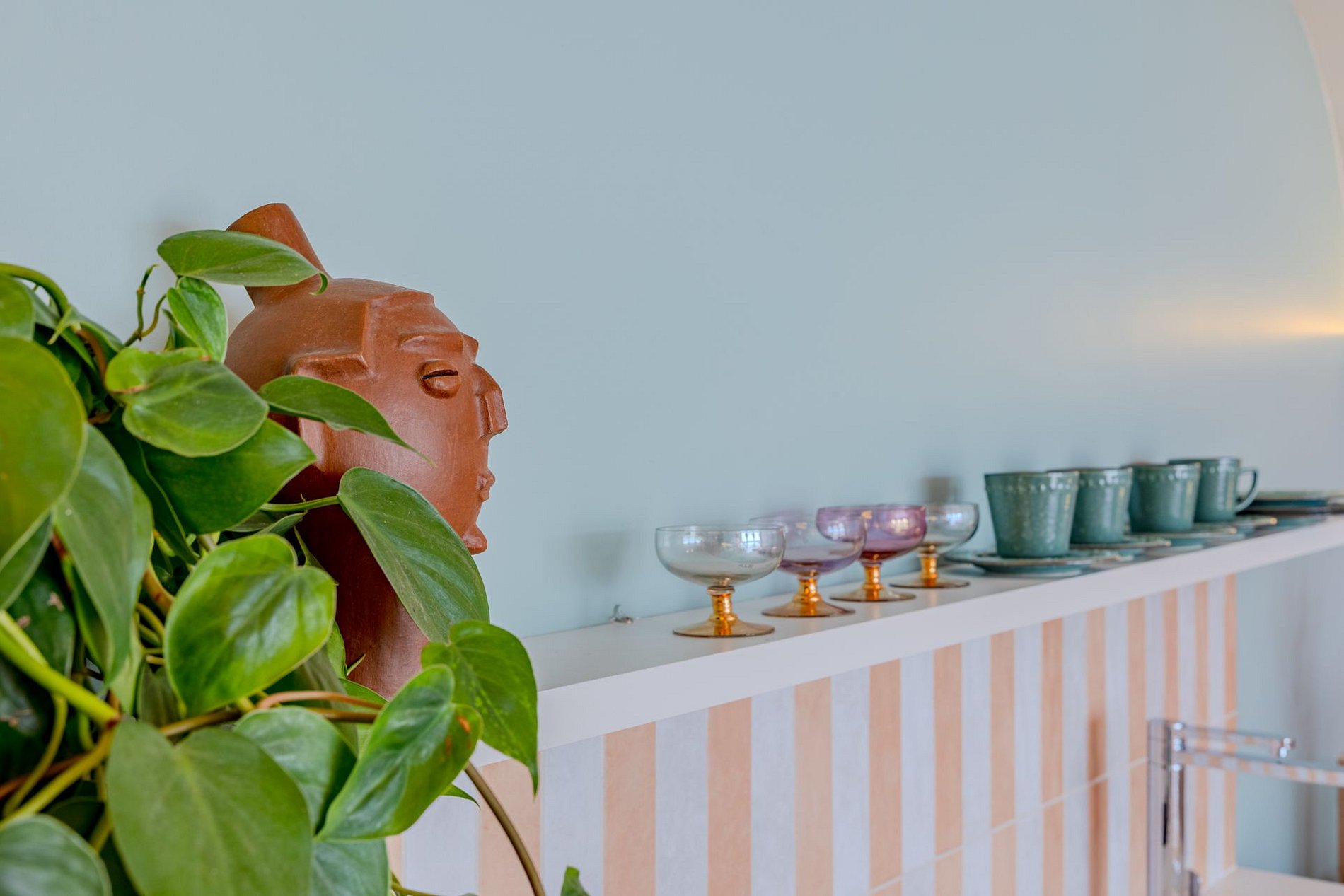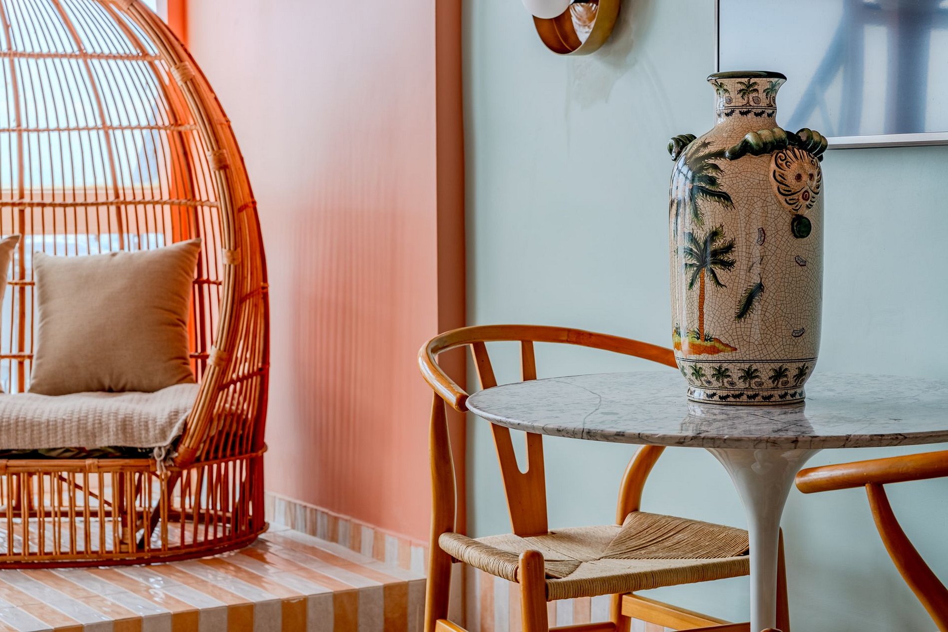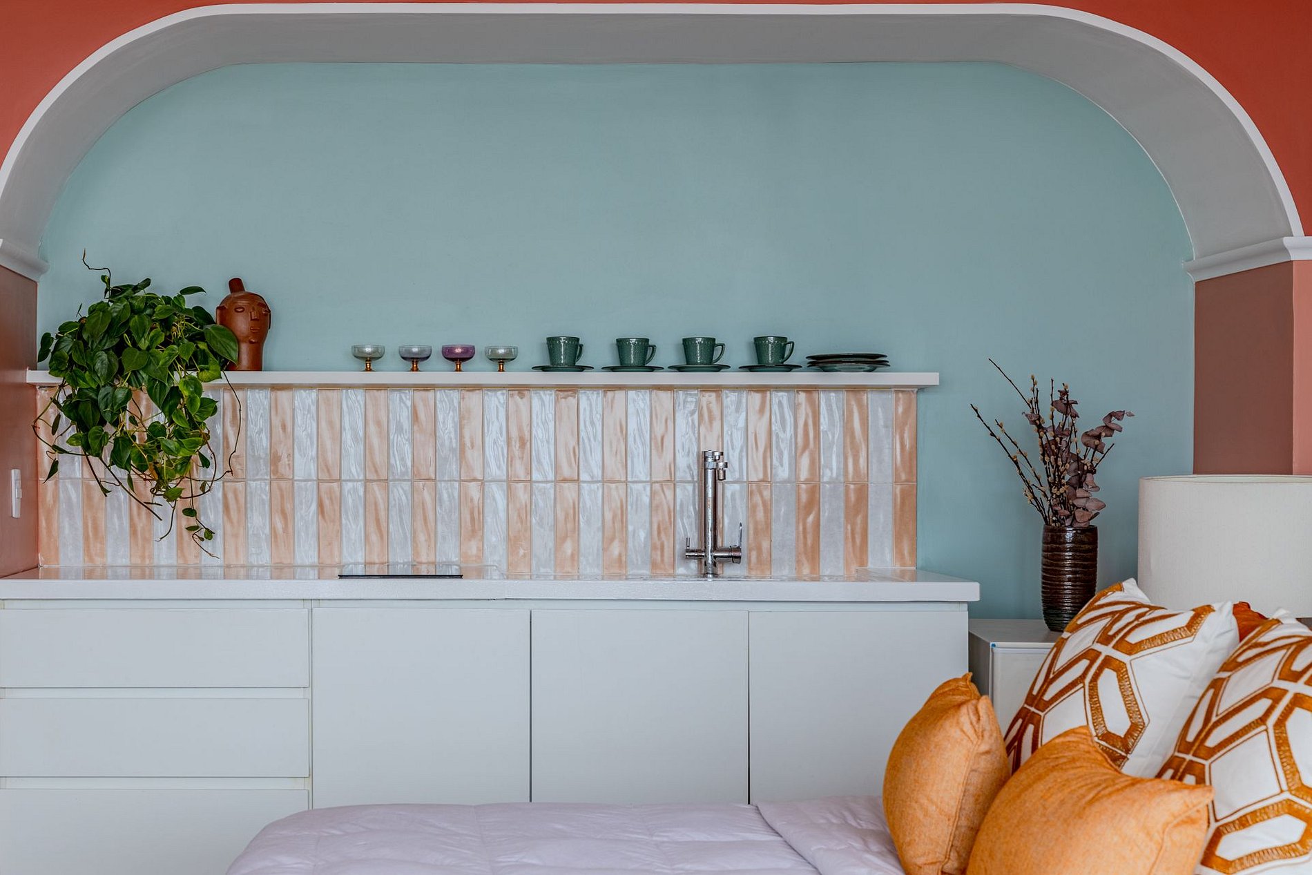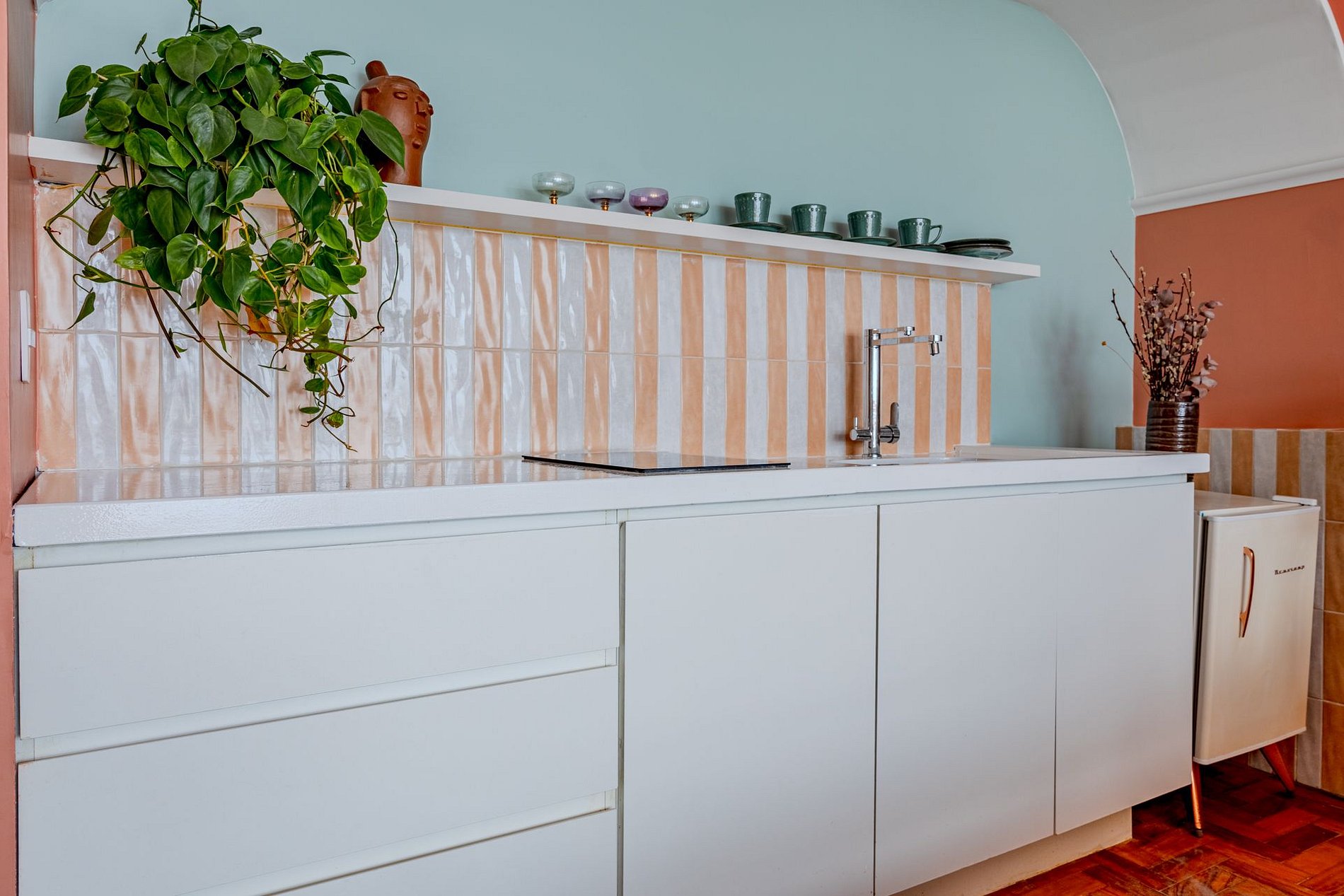 The design blends tropical elegance with bold coral tones, creating a warm and memorable atmosphere. A large artistic mural brings personality and charm, while the beautiful arched windows frame a breathtaking panoramic skyline stretching from Downtown São Paulo all the way to the Cantareira mountains.