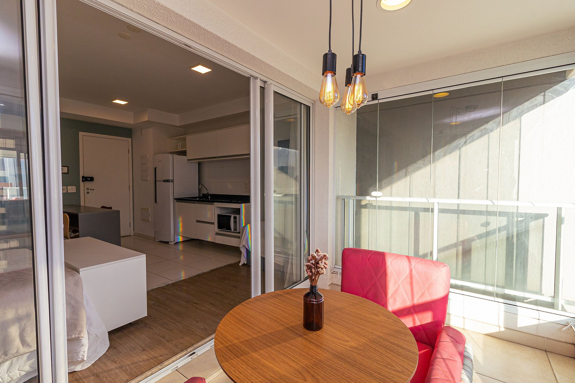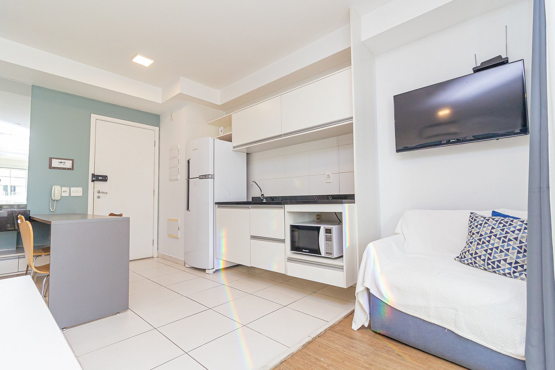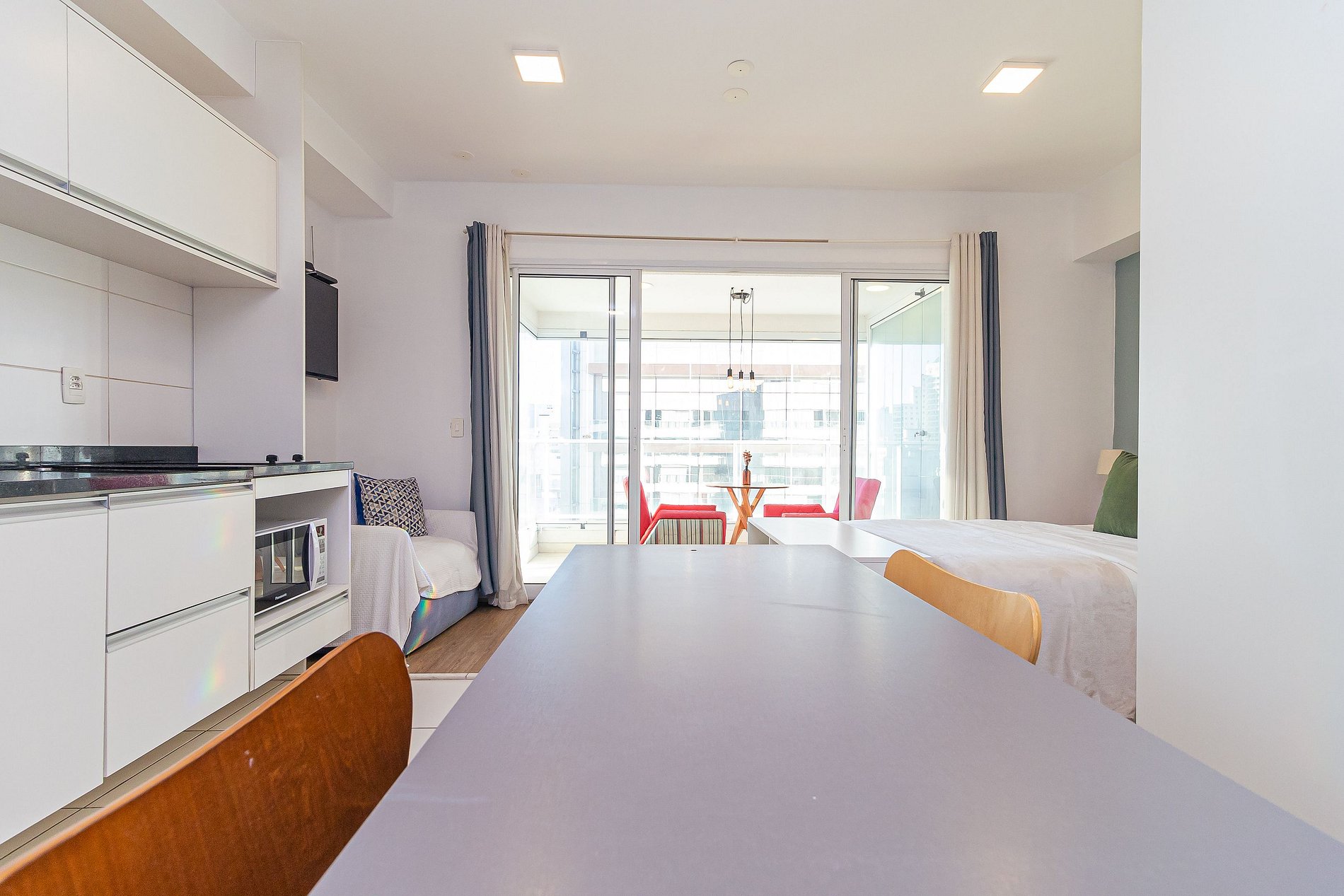 The studio was recently renovated and is located on the 20th floor, offering a wide view of the city, in addition to having a decoration all thought out to make the space cozy, in addition to having an optimized environment, with a complete kitchen, balcony with dining area, a super comfortable sofa. The Building has an excellent structure: having the largest suspended swimming pool in Latin America, gym, garage, laundry (paid separately) and is just 10 minutes walking from Avenida Paulista.