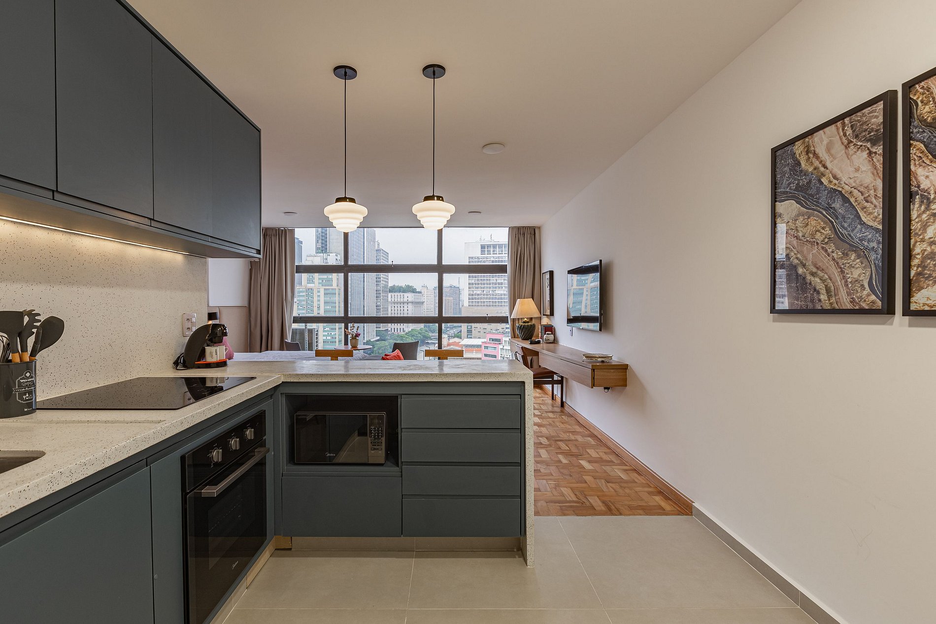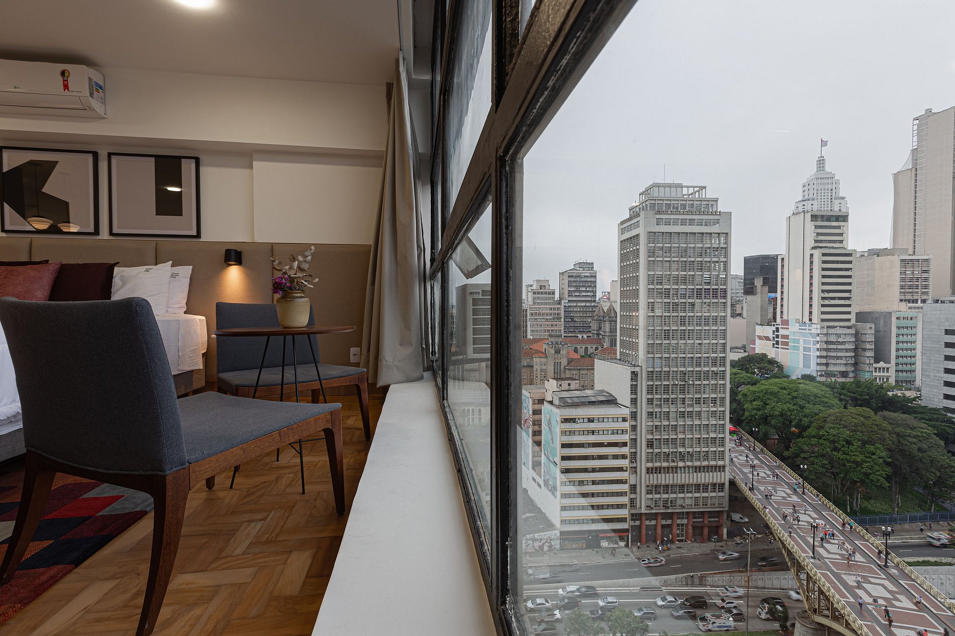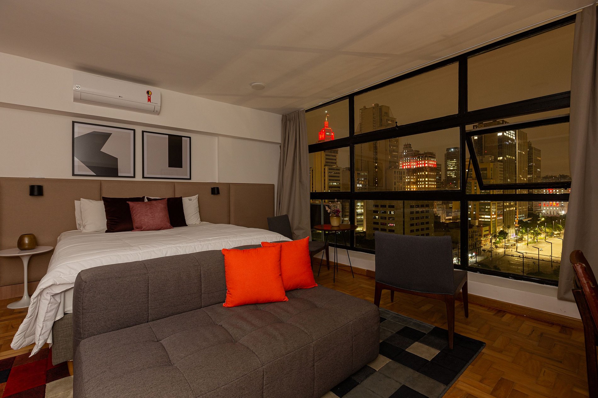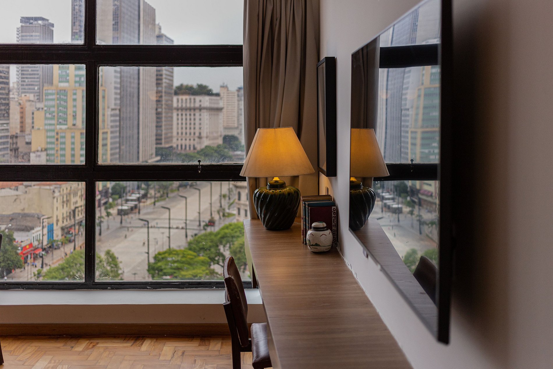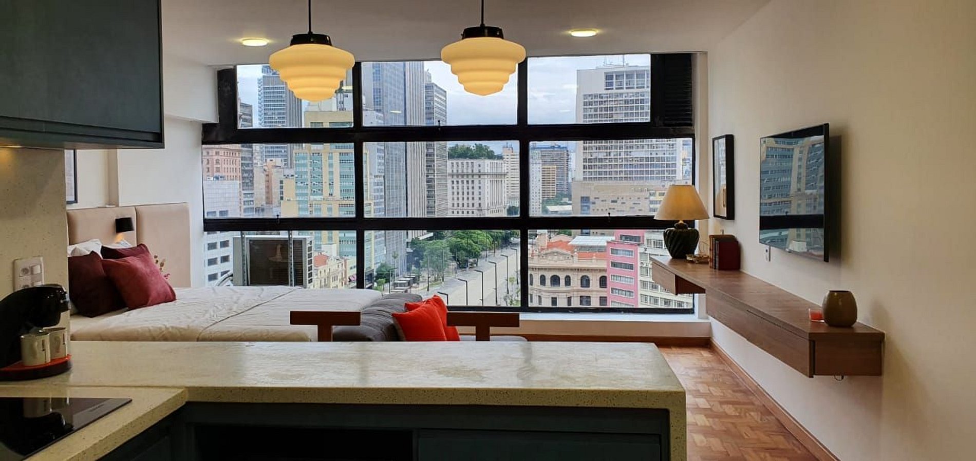 Newly renovated studio with an incredible view from the window on the 20th floor of one of the tallest buildings in the city, the Mirante do Vale, where you can see almost the entire city and at the end of the horizon, overlooking the Vale do Anhangabaú.