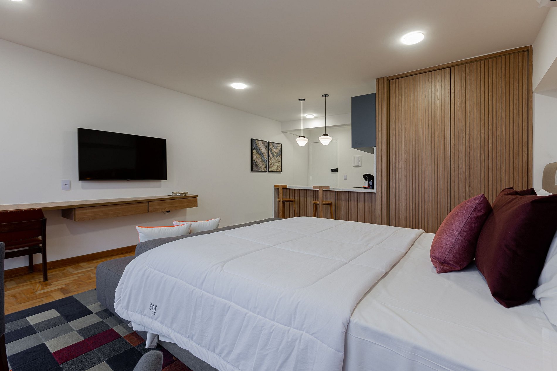 Nossos apartamentos são projetados para receber hóspedes com todo o conforto e possuem vistas lindas da cidade. Eles são entregues com enxoval completo e higienizado, toalhas, xampu e condicionador etc.