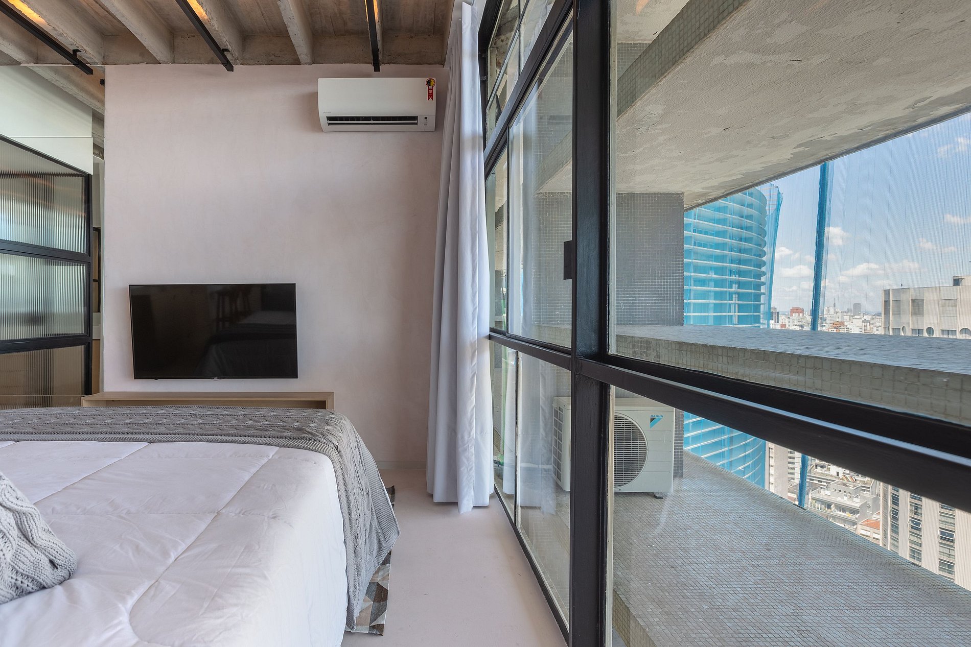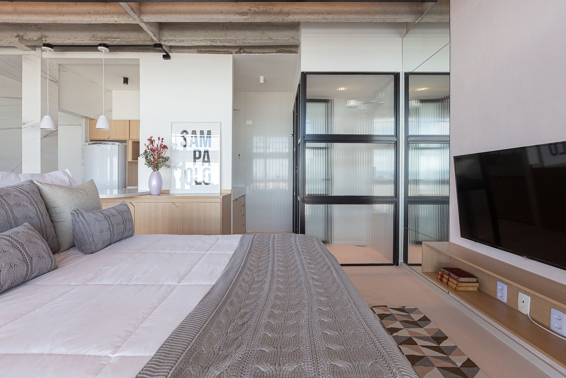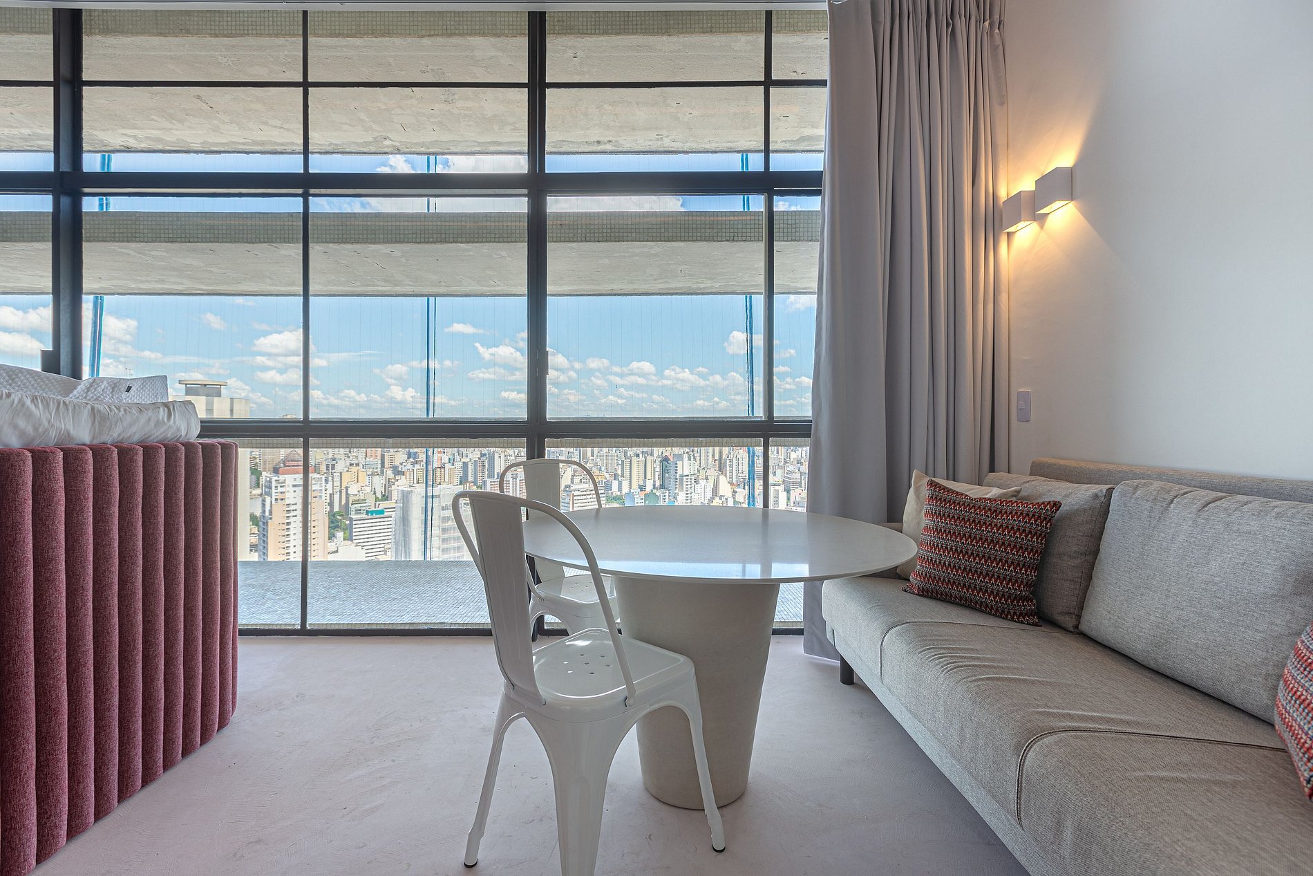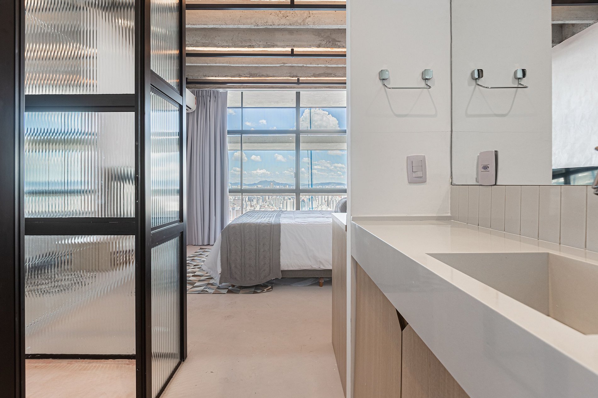 Área de banho com vidro canelado, sala de estar e uma cozinha equipada aliados a uma internet de alta velocidade fazem desse apartamento uma experiência perfeita no Copan.