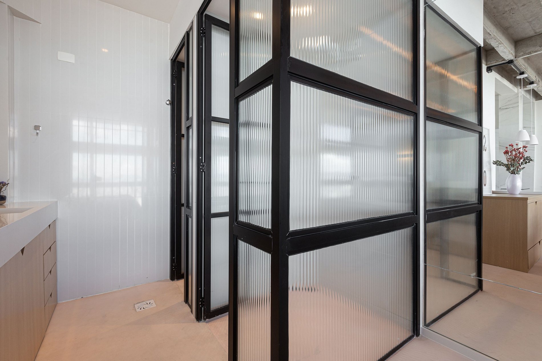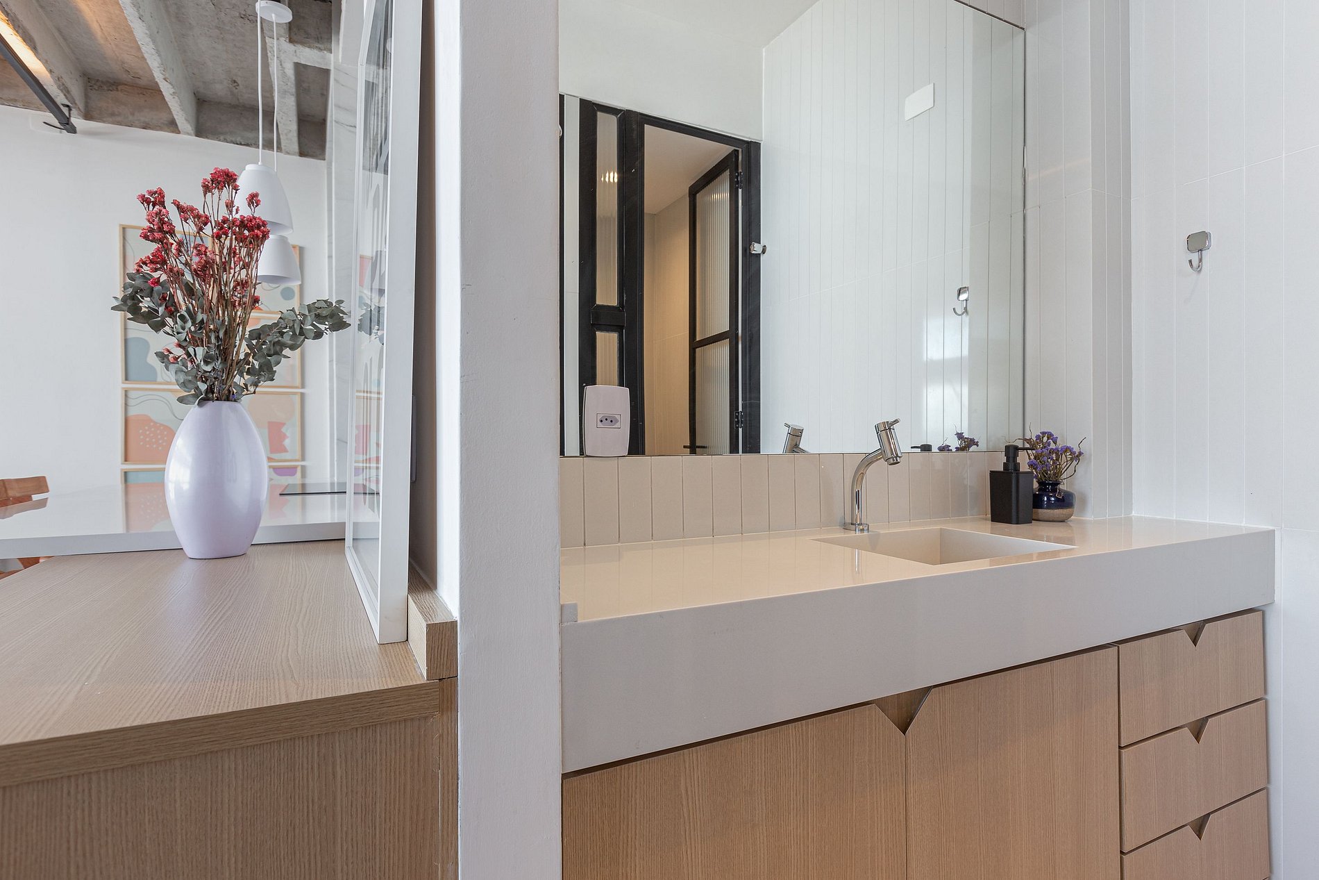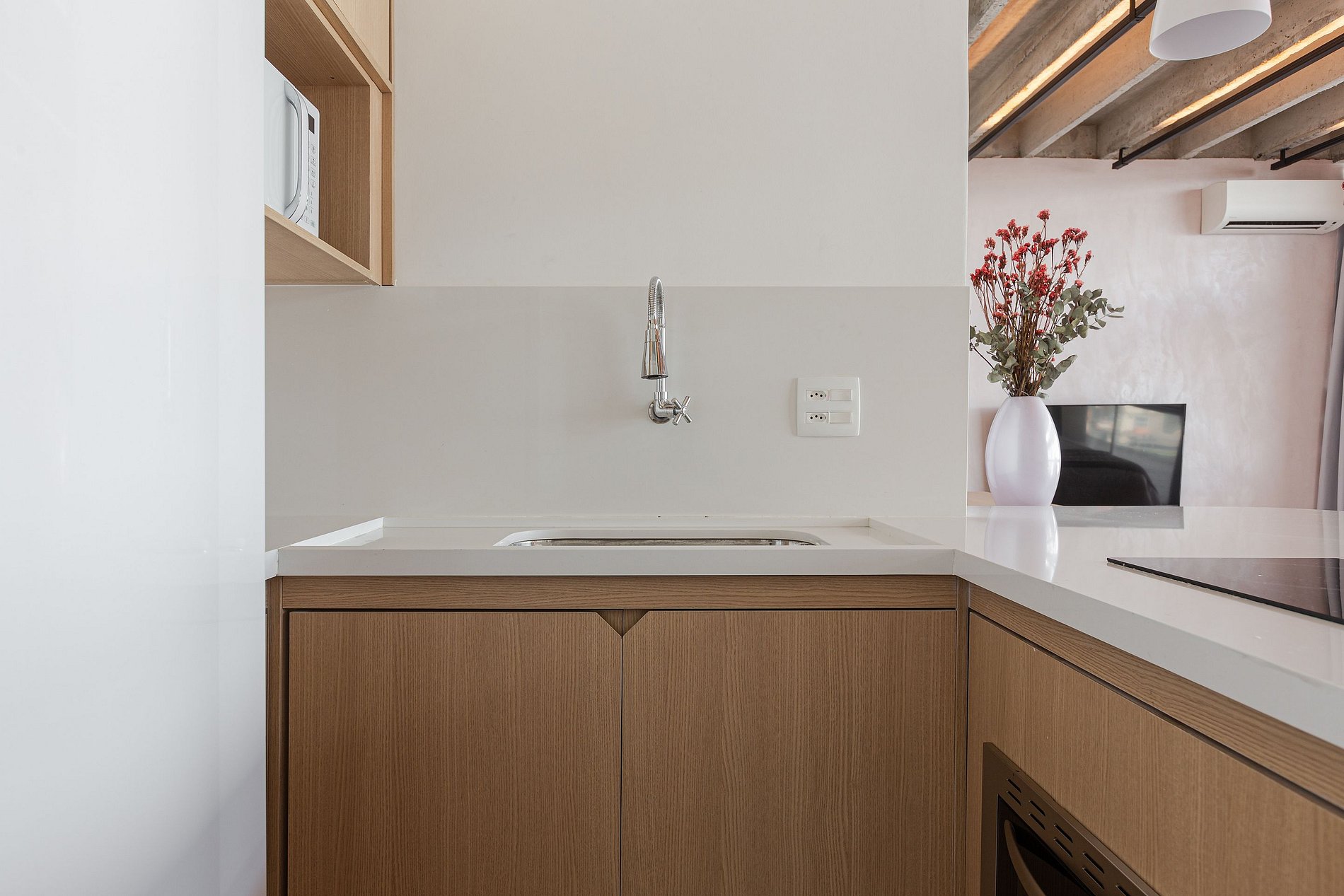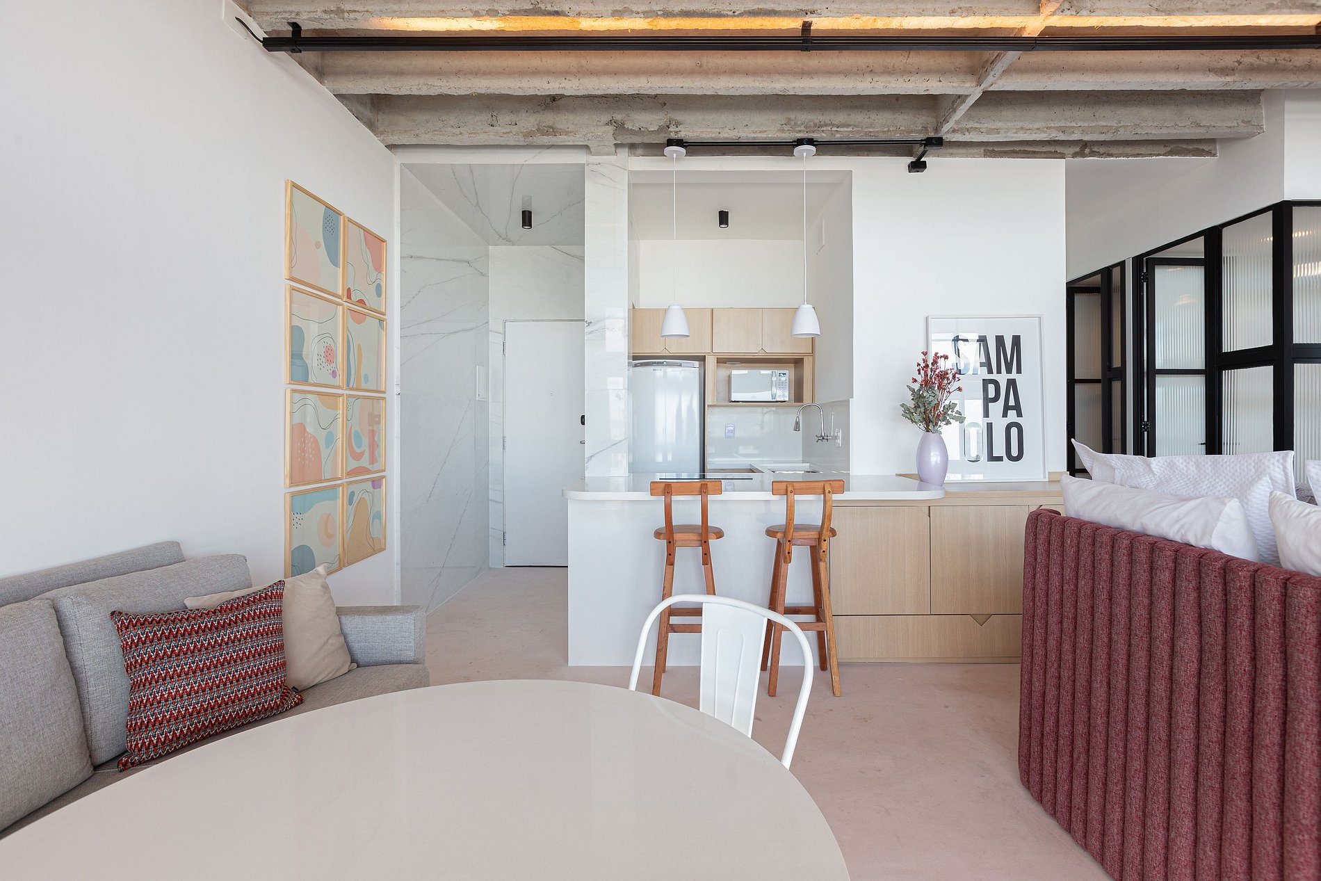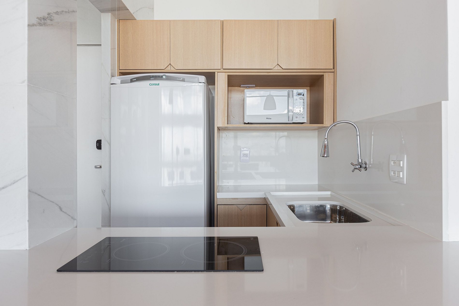 Área de banho com vidro canelado, sala de estar e uma cozinha equipada aliados a uma internet de alta velocidade fazem desse apartamento uma experiência perfeita no Copan.