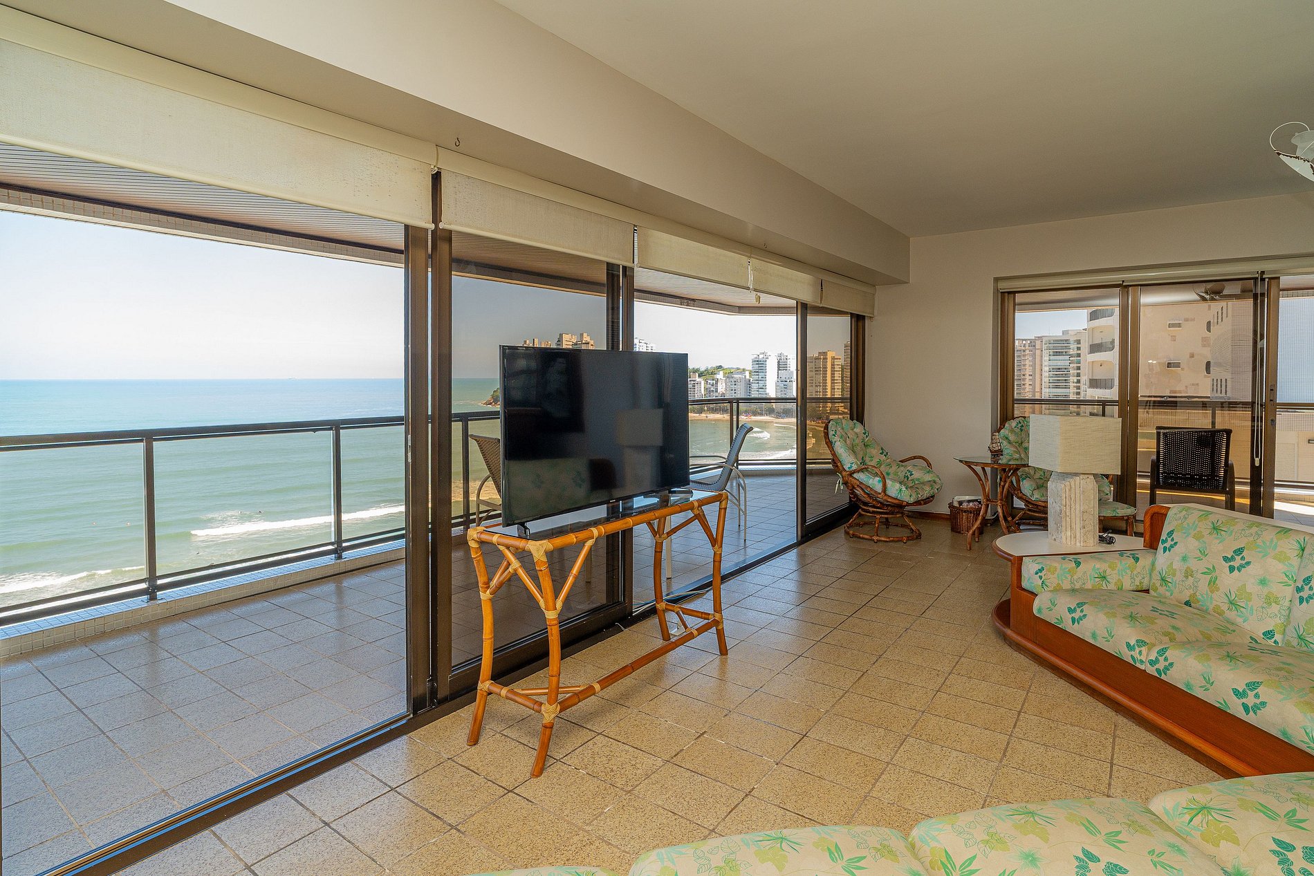 A sala é ampla e integrada, com grandes aberturas que deixam a brisa do mar entrar e iluminam todo o ambiente. A varanda é um espetáculo à parte: espaçosa, com vista direta para o oceano, perfeita para refeições ao ar livre, leitura ou simplesmente contemplar o horizonte.