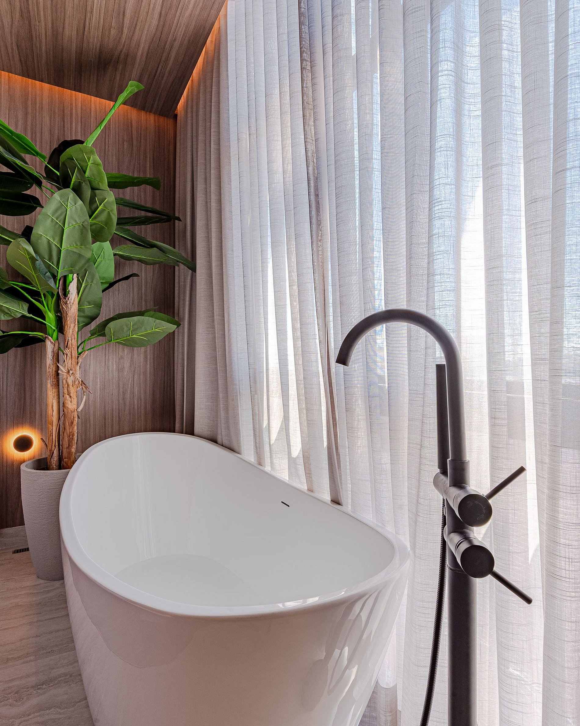 Banheira de Imersão: Para momentos de relaxamento, o apartamento dispõe de uma banheira aconchegante, onde você pode se desligar da rotina e desfrutar de um banho tranquilo com vista para a cidade.