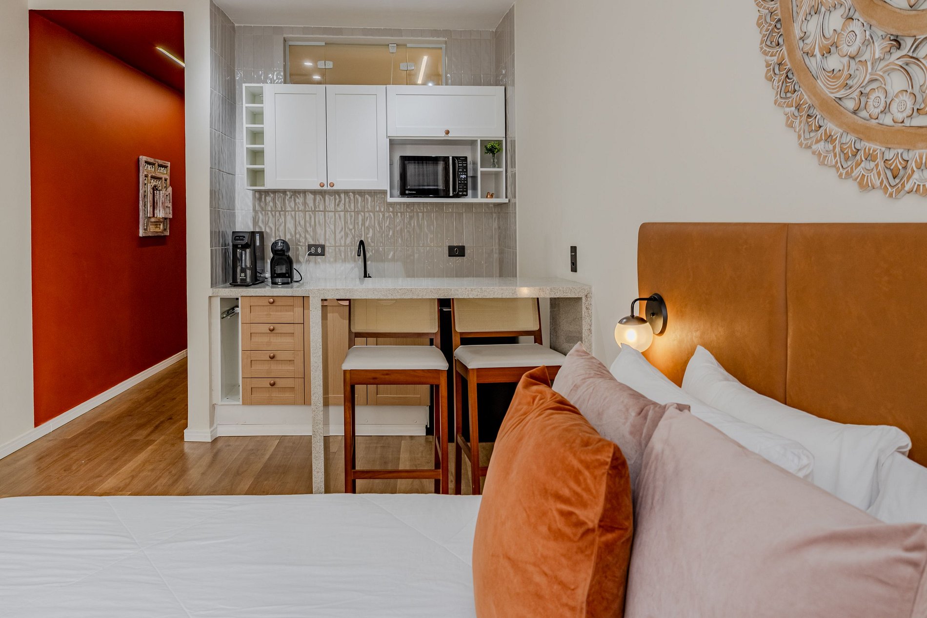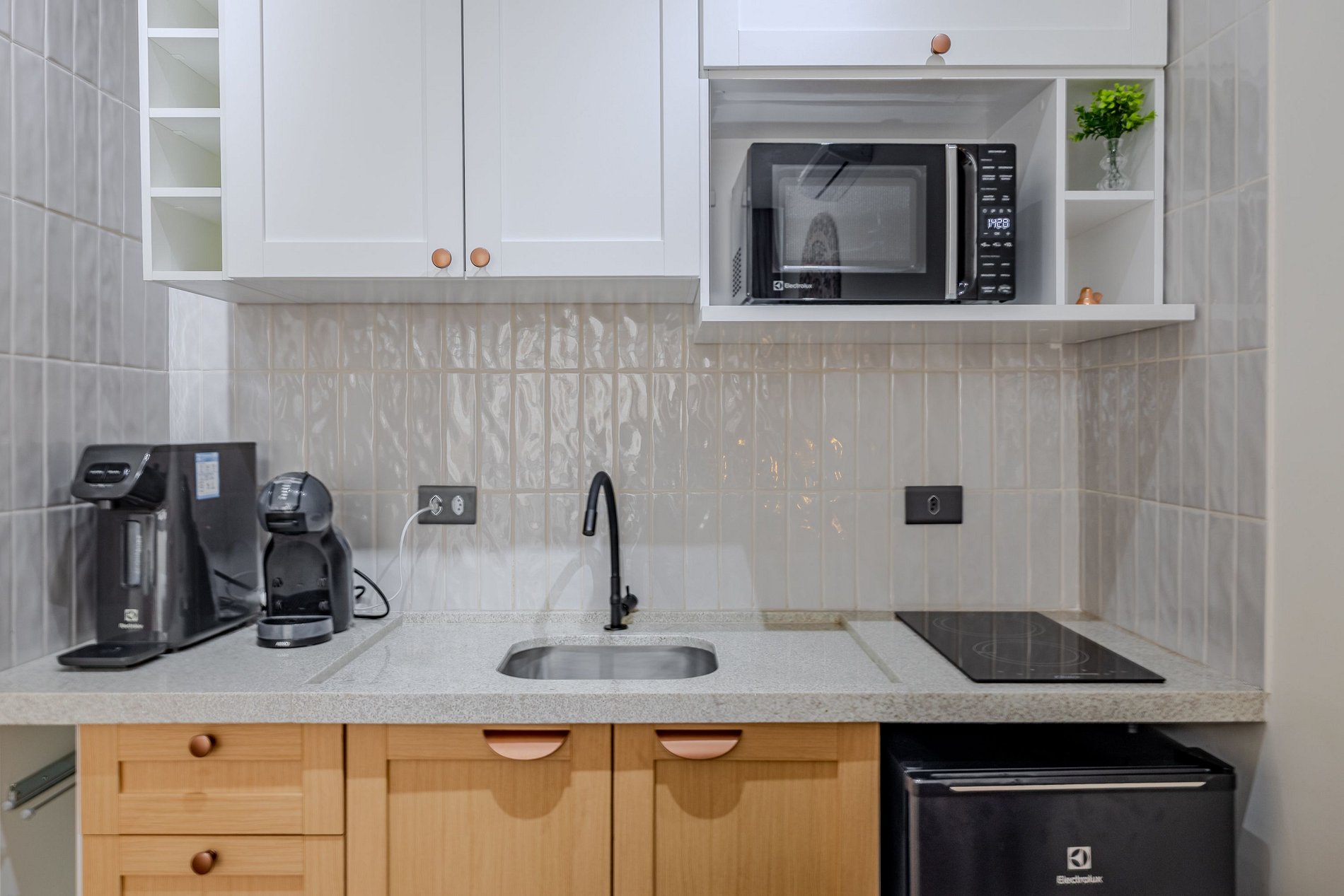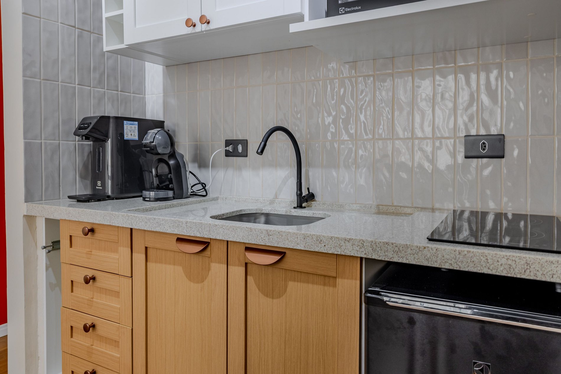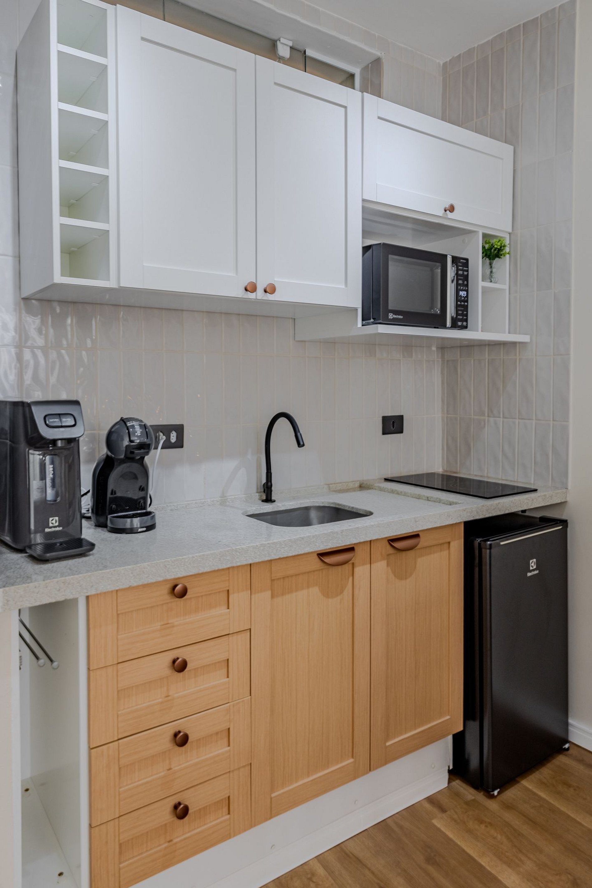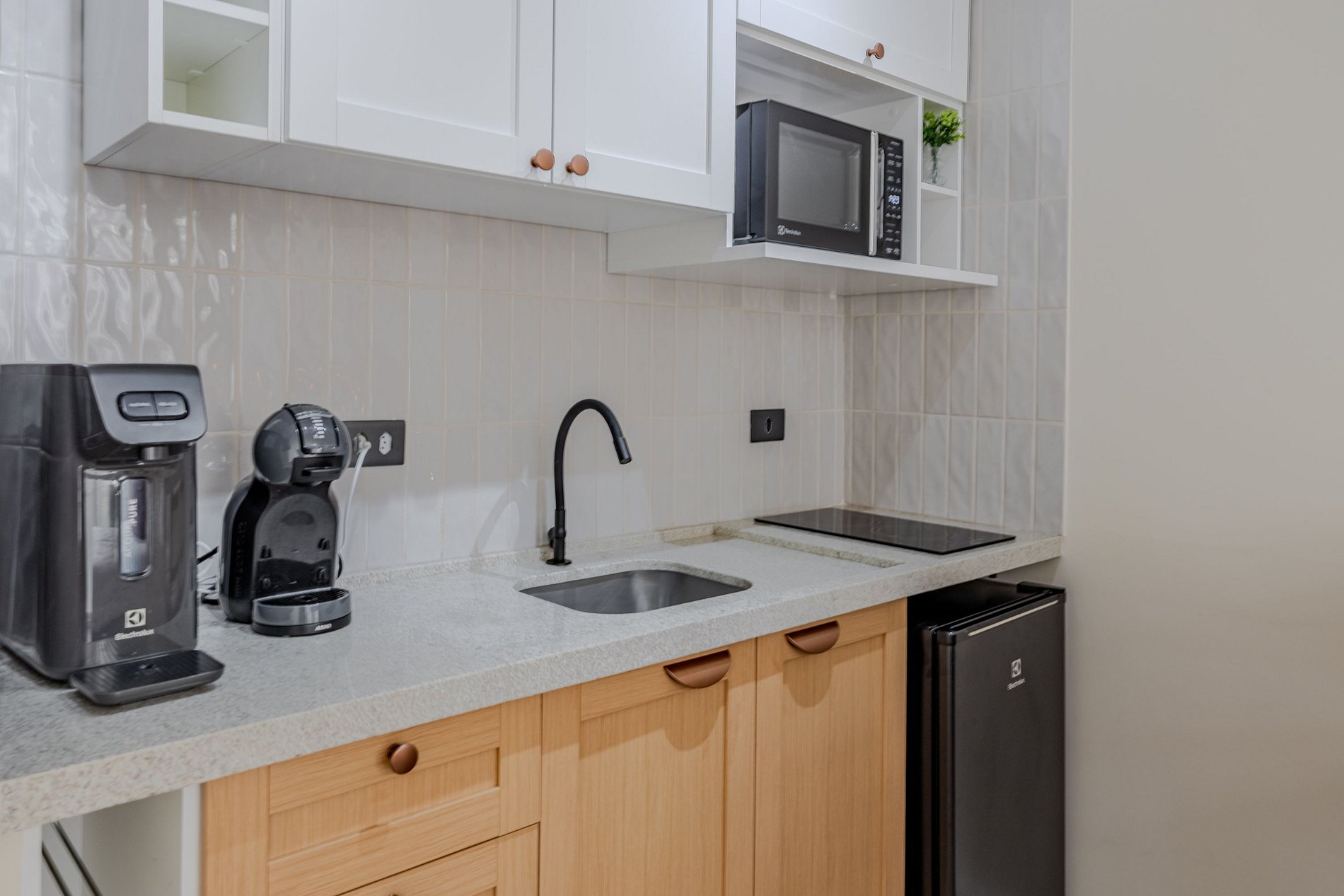 A cozinha compacta é equipada com cooktop, micro-ondas, filtro de água, utensílios básicos e cafeteira, ideal para preparar refeições simples ou um bom café antes de sair para explorar a cidade.