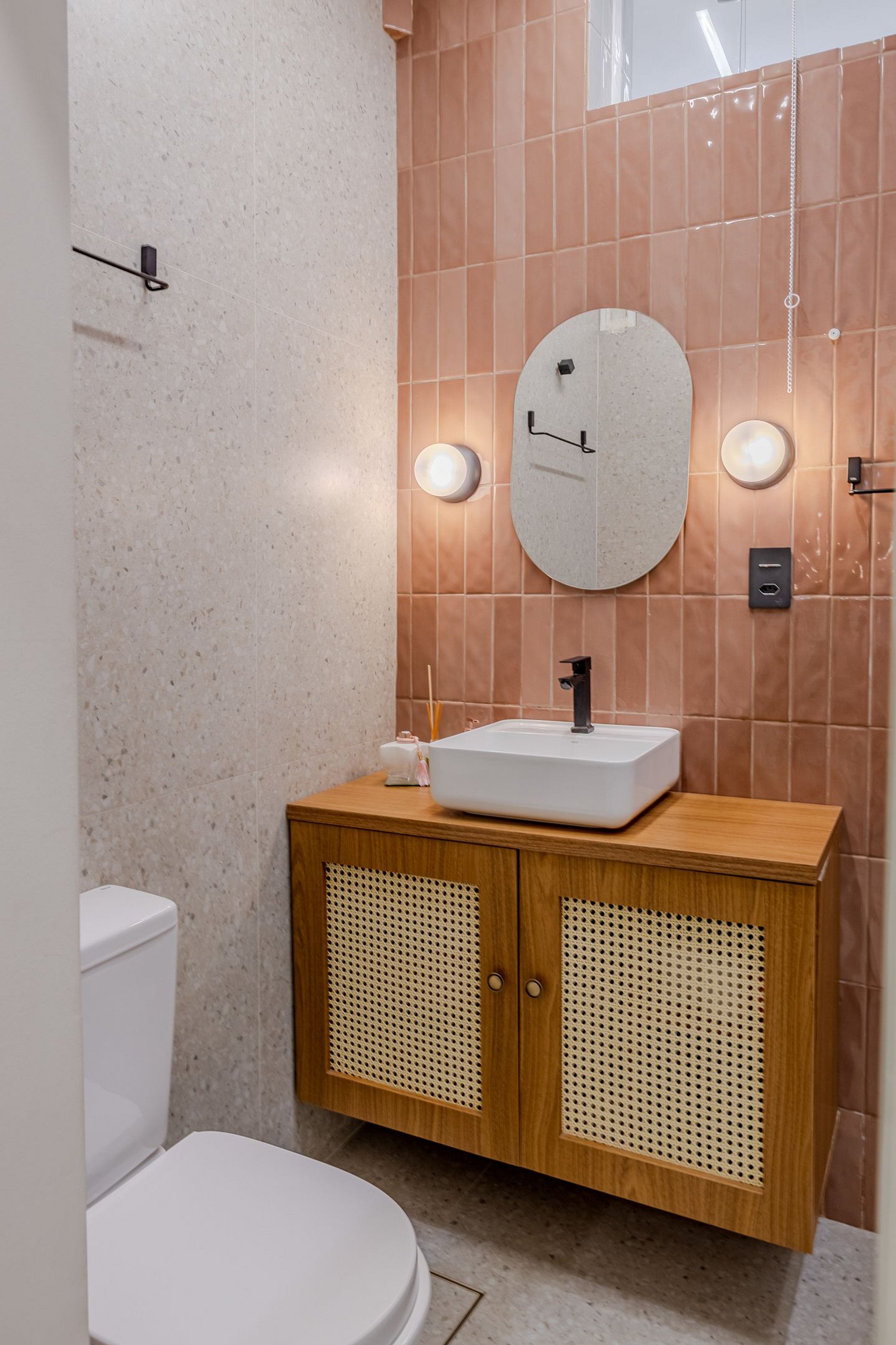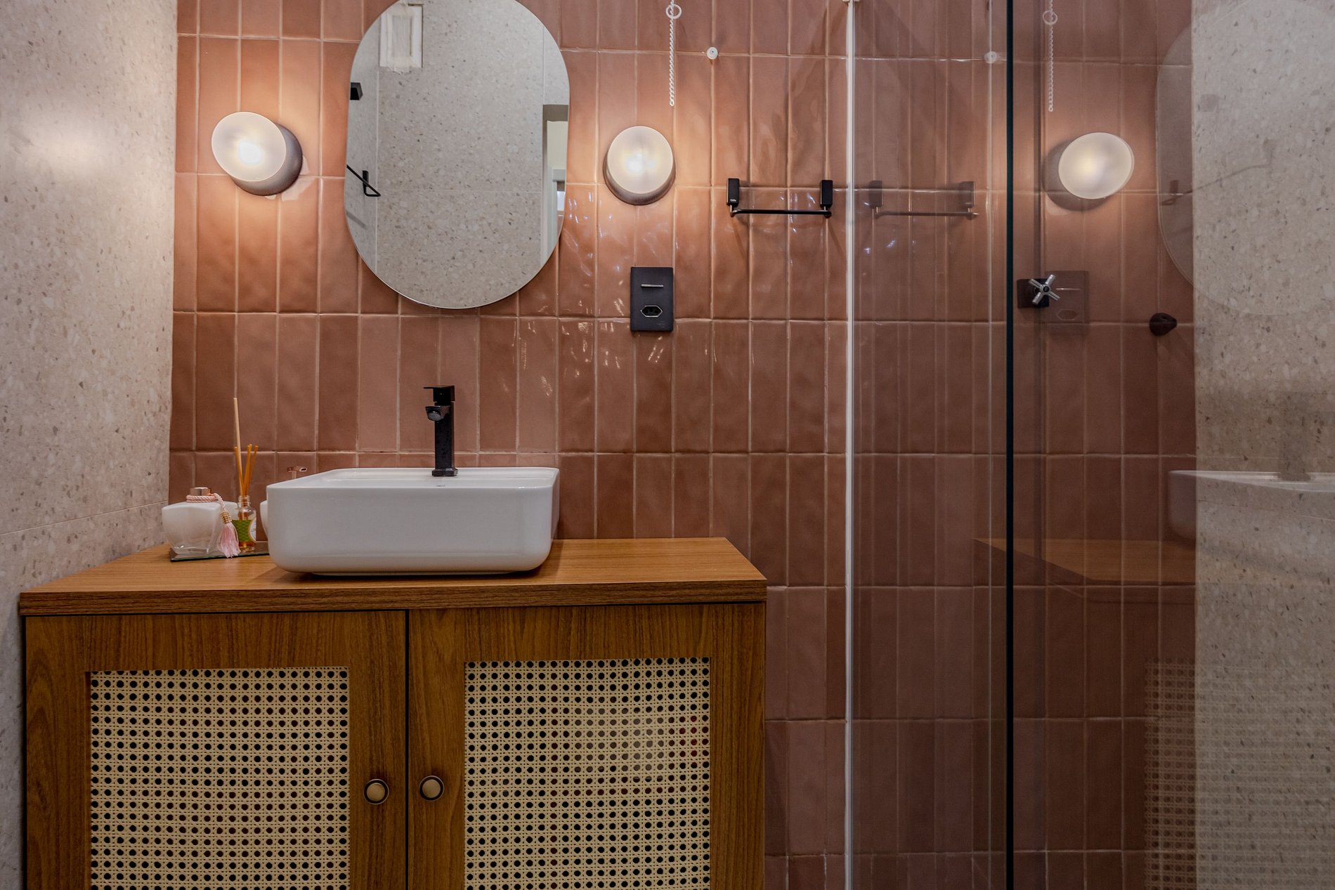 O banheiro tem design moderno, box de vidro e enxoval de qualidade, proporcionando praticidade e conforto durante toda a estadia.