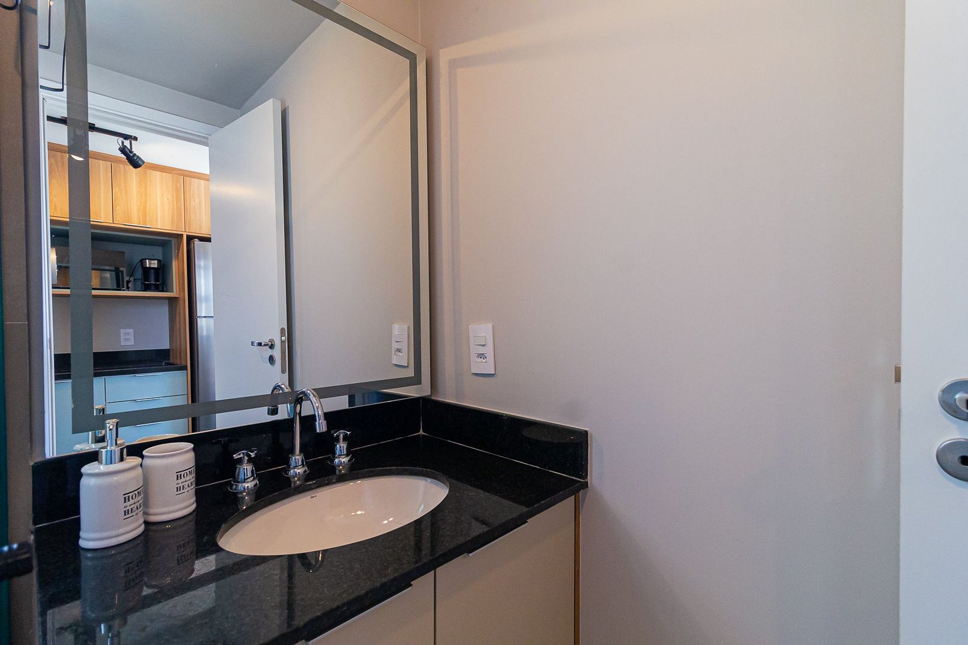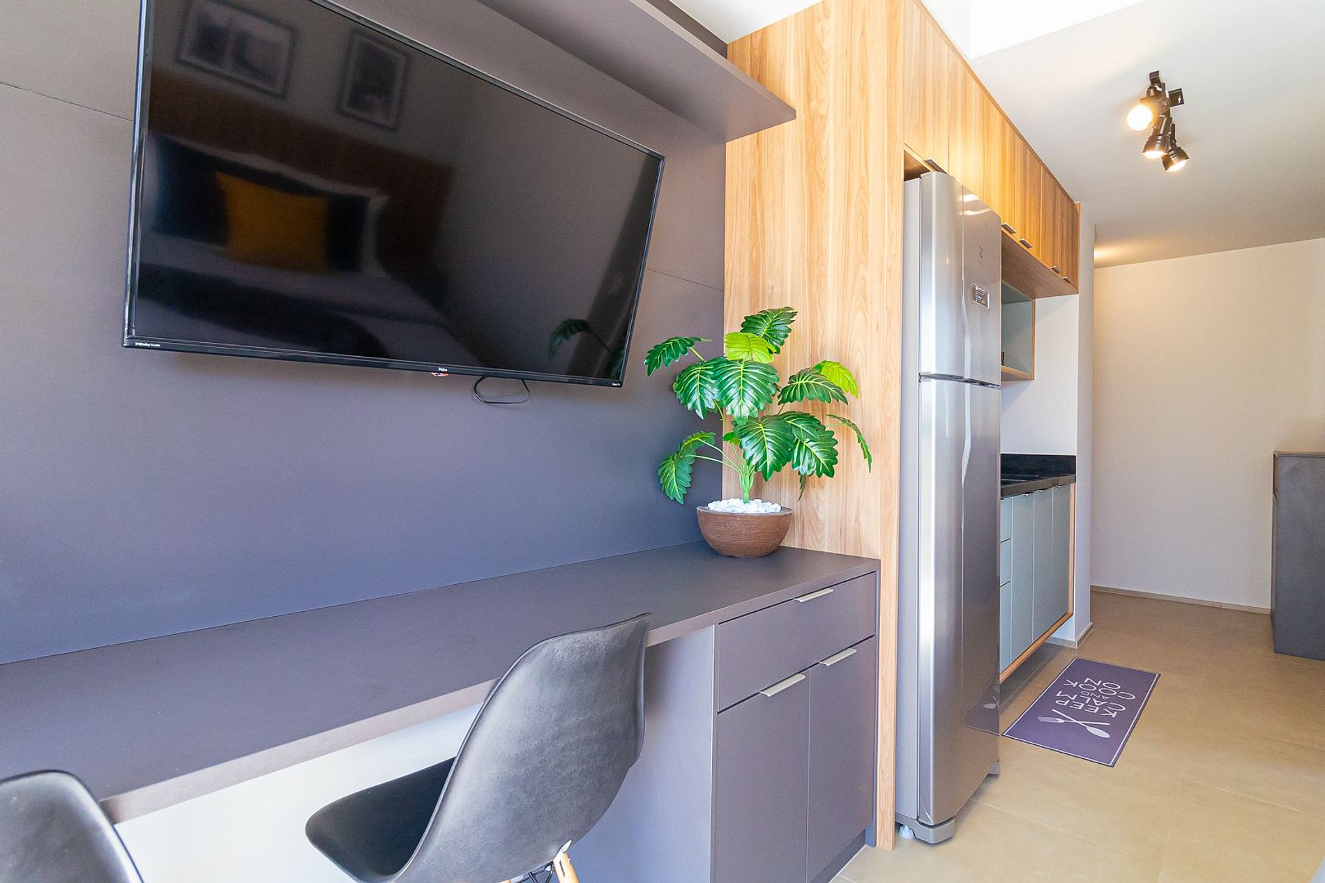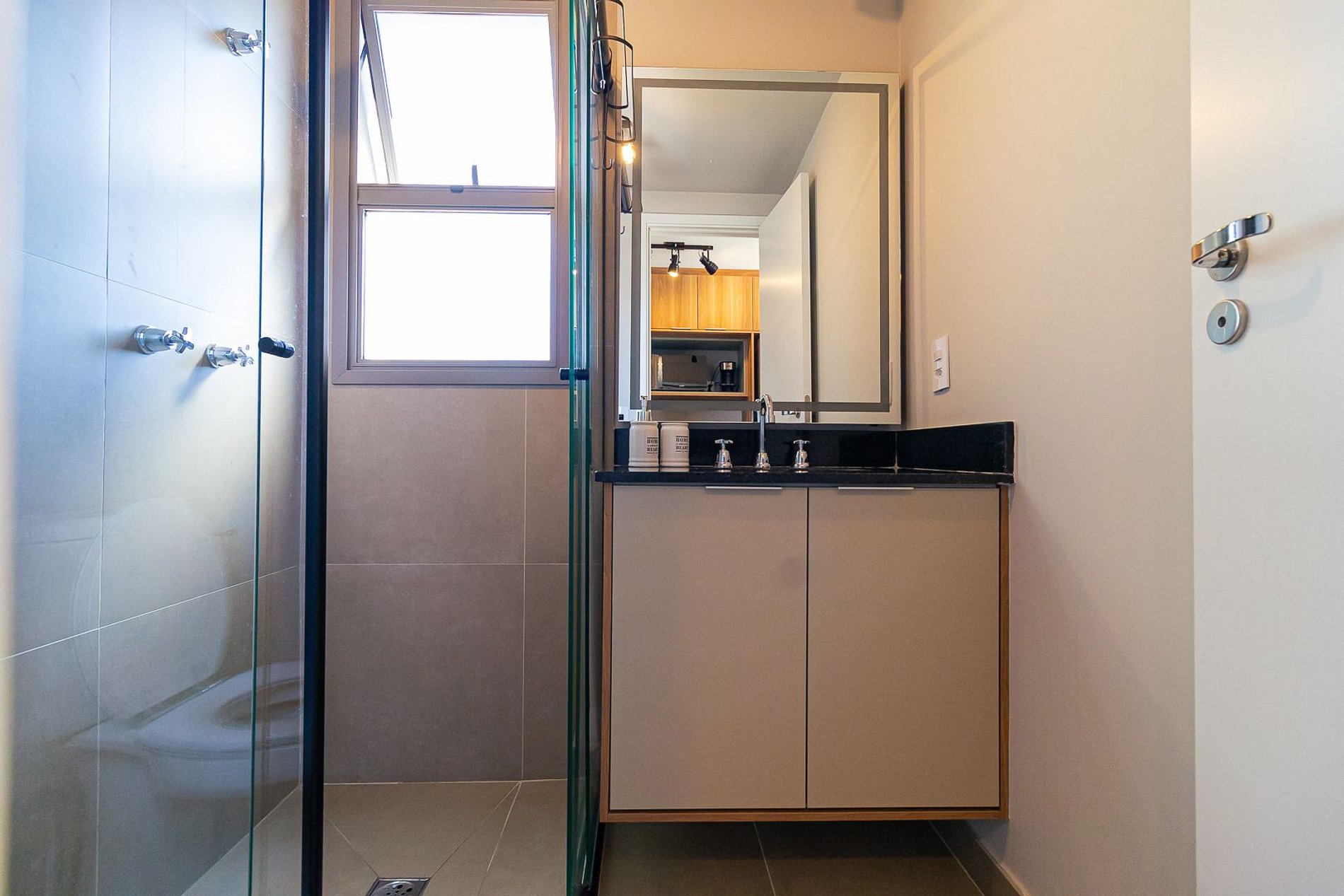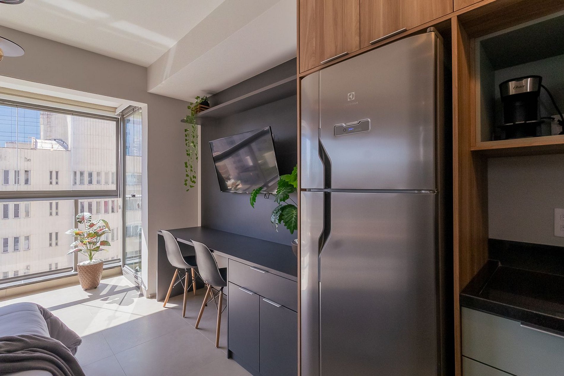 Studio completo e confortável, possui uma decoração limpa que une design e modernidade com um toque urbano da cidade de São Paulo, nas cores bege e cinza, possui prateleiras em madeira, armários cinzas, lustres de lâmpadas quentes com iluminação regulada e spots de estúdio. O apartamento conta com bancada para refeição, cooktop por indução, geladeira, micro-ondas, utensílios de cozinha, taças, televisão 42", cama queen-size e banheiro em cor branca com janela. Além de ar-condicionado oferecemos roupa de cama confortável e nova, ferro de passar, cabides, shampoo, sabonete e secador de cabelos.