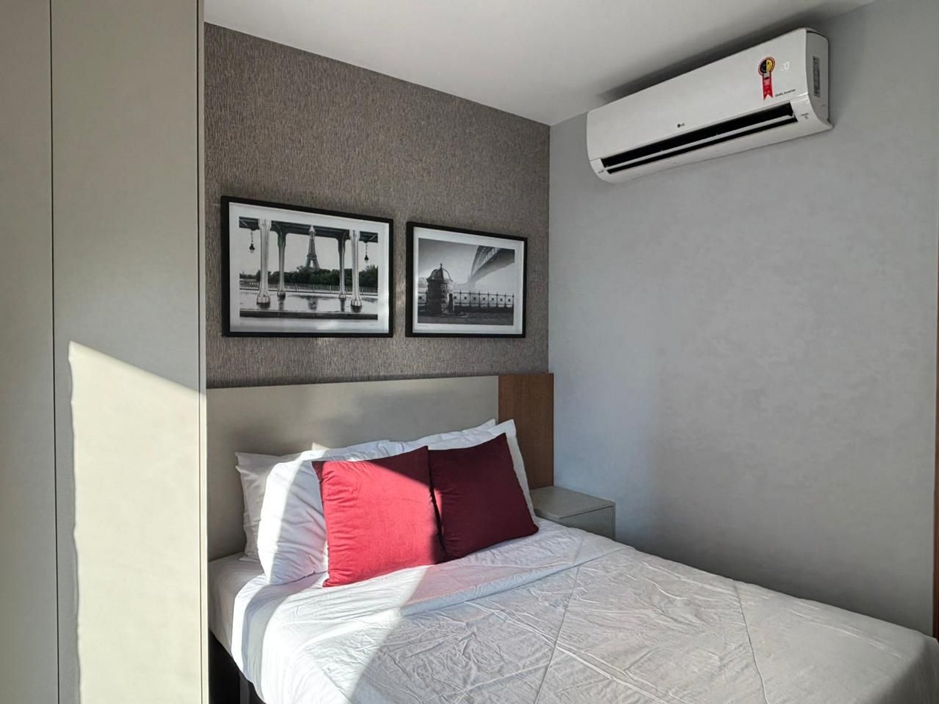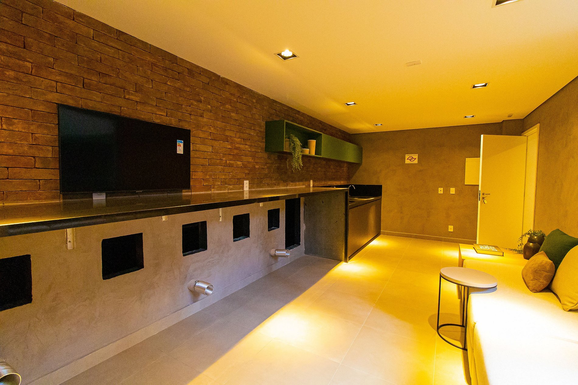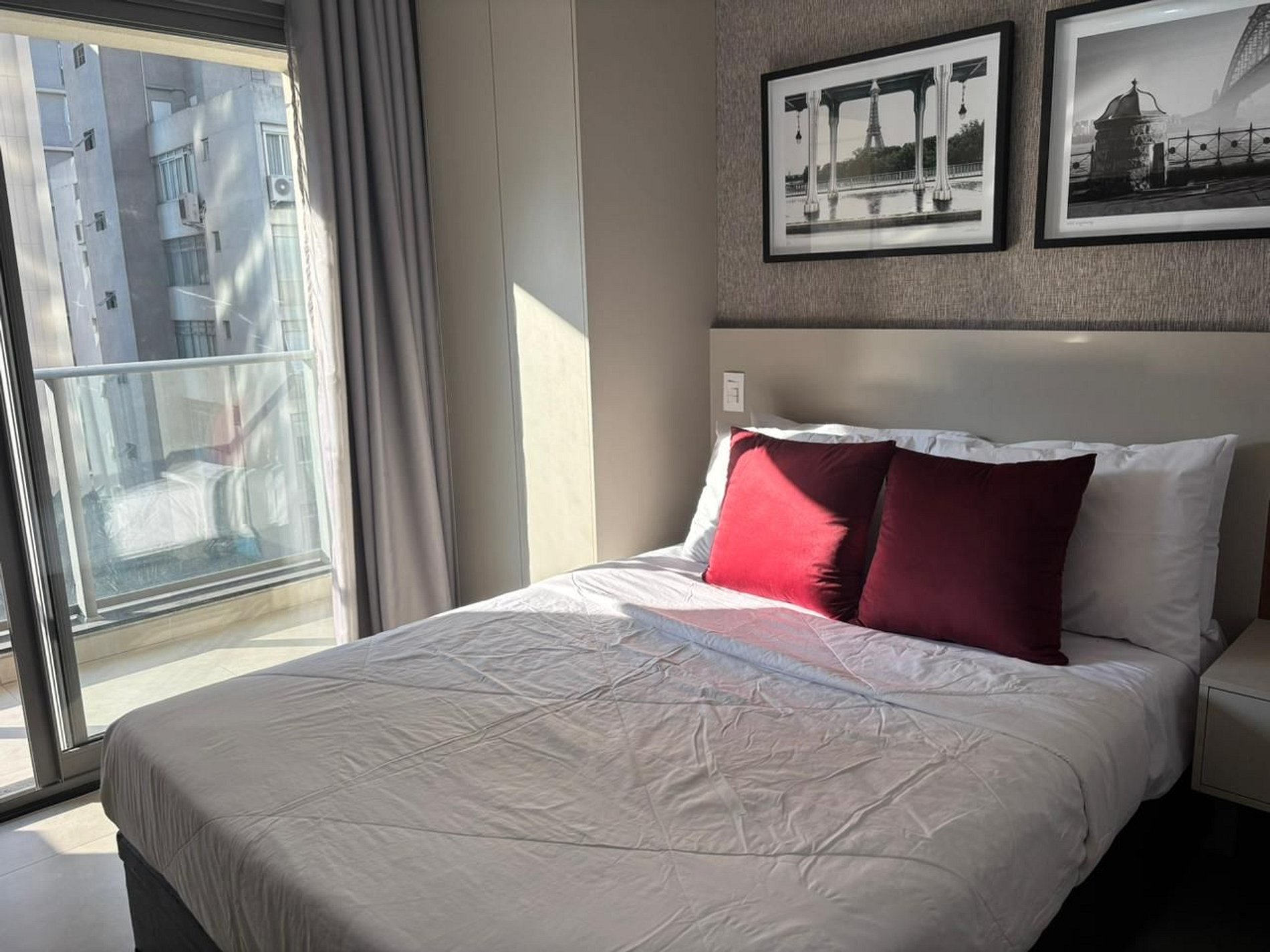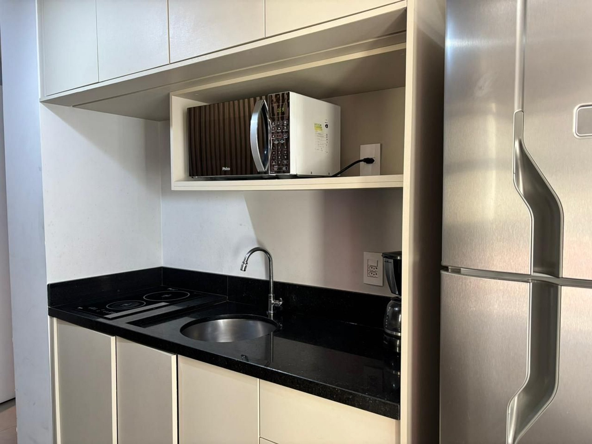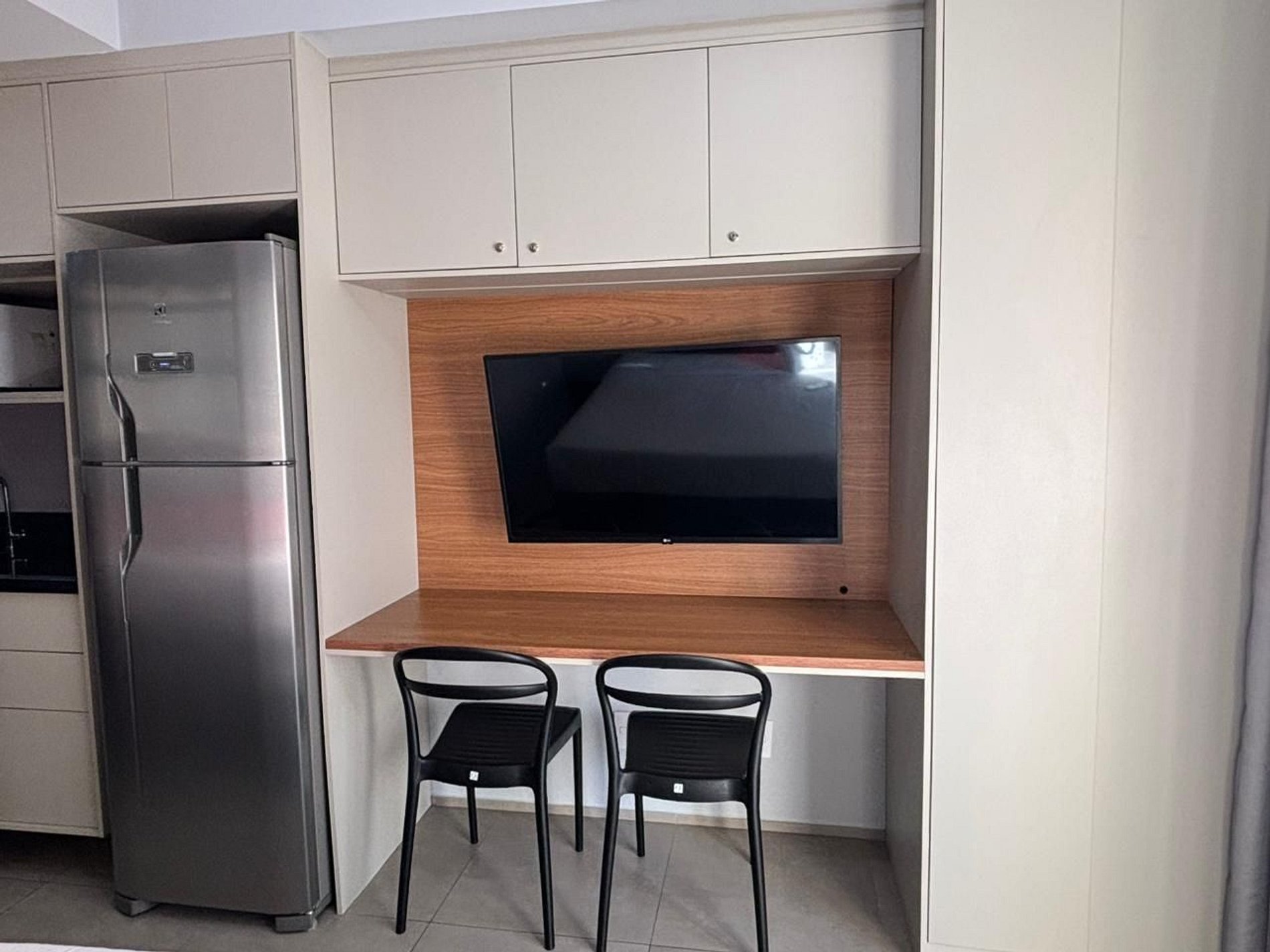 Studio completo e confortável, com decoração clean que une design e modernidade, trazendo um toque urbano típico de São Paulo. Nas cores bege e cinza, conta com prateleiras de madeira, armários cinza, lustres com iluminação quente e regulável, além de spots estilo estúdio. O apartamento dispõe de bancada para refeições, cooktop, geladeira, micro-ondas, utensílios de cozinha, taças, televisão, cama casal e banheiro em tom branco. Além do ar-condicionado, oferecemos roupa de cama nova e confortável, ferro de passar, cabides, shampoo, sabonete e secador de cabelo.